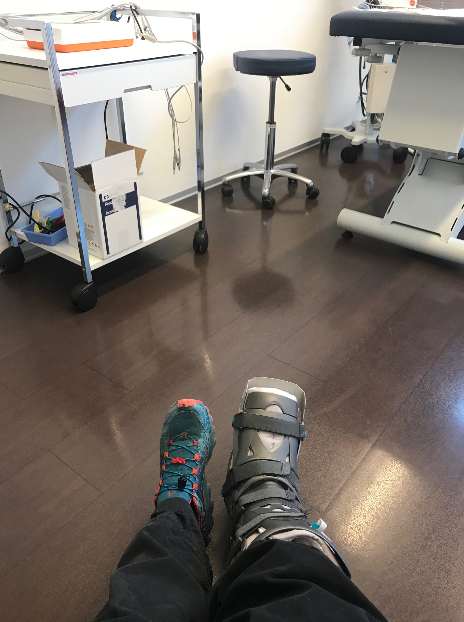 On passe à l’hôtel ramasser nos affaires, Claudia est déterminée à m’amener chez un toubib. Je préfère rentrer en Valais, je ne sais pas comment on dit « entorse » en suisse-allemand ! Dans la voiture, la douleur est toujours plus vive et je suis hyper contente d’arriver à Martigny à la permanence. Je vous la fait courte, mon entorse est en fait une fracture de l’astragale et je ressors avec le pied dans le plâtre, enfin dans une botte de robocop !