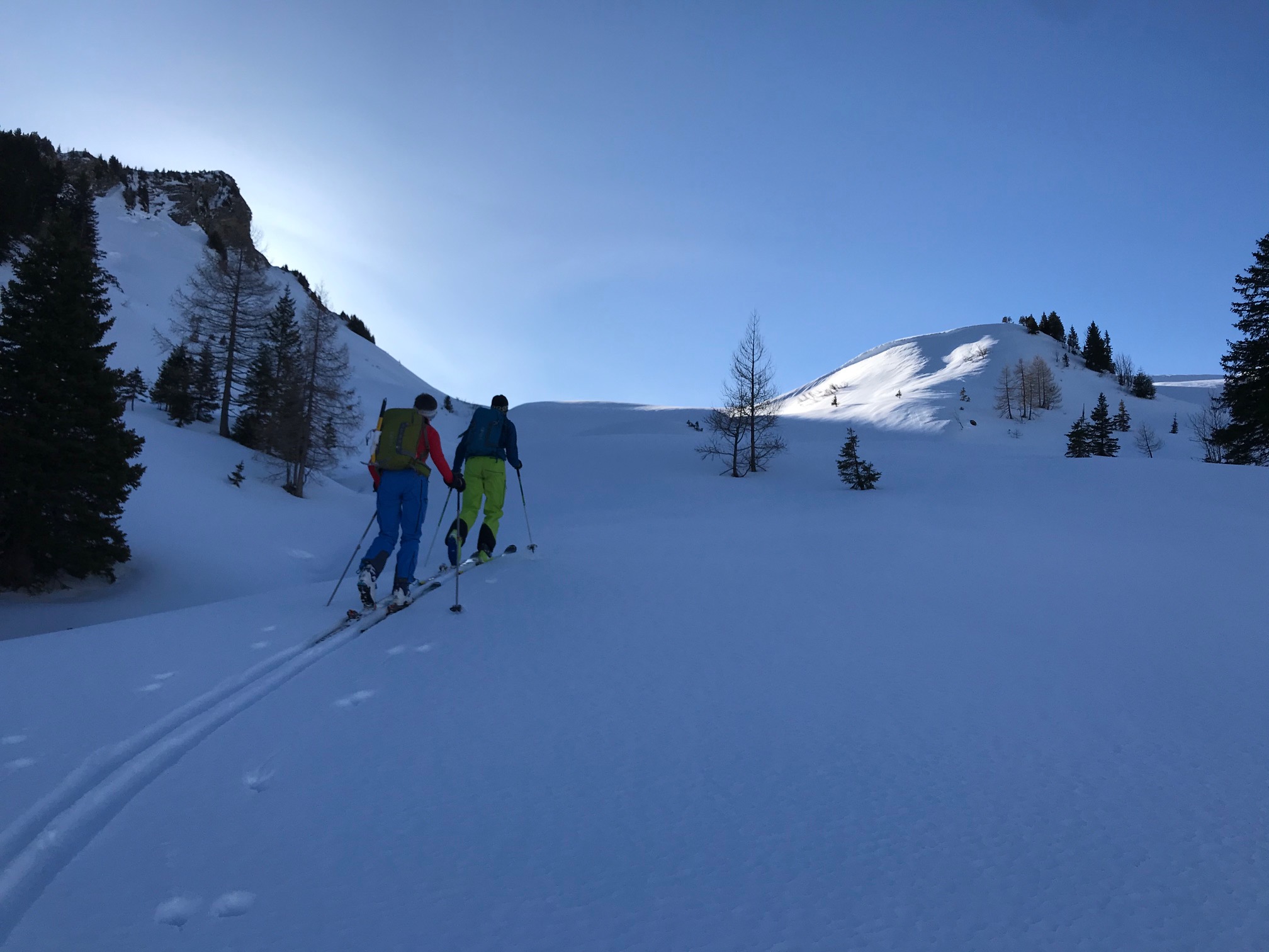 Nous avons quitté le col du Pillon relativement tôt pour la saison, histoire de ne pas prendre de retard avant de partir. Premier but de la journée, le Col du Voré. Ca commence par un plat interminable le long du sentier raquette, puis une montée efficace droit dans le pentu. La neige est bien gelée et nous aurons tous les trois besoin des couteaux pour en venir à bout. Au sommet du col, on constate que le versant nord est comme on l’avait espéré: poudreux à souhait.