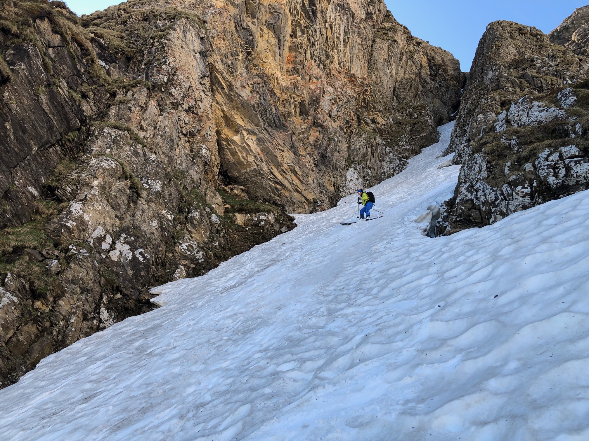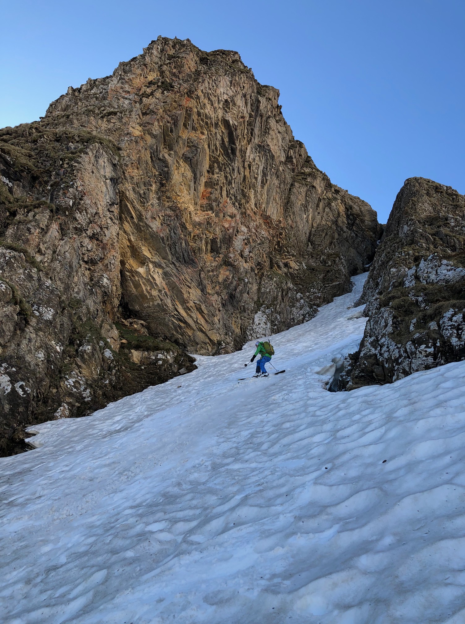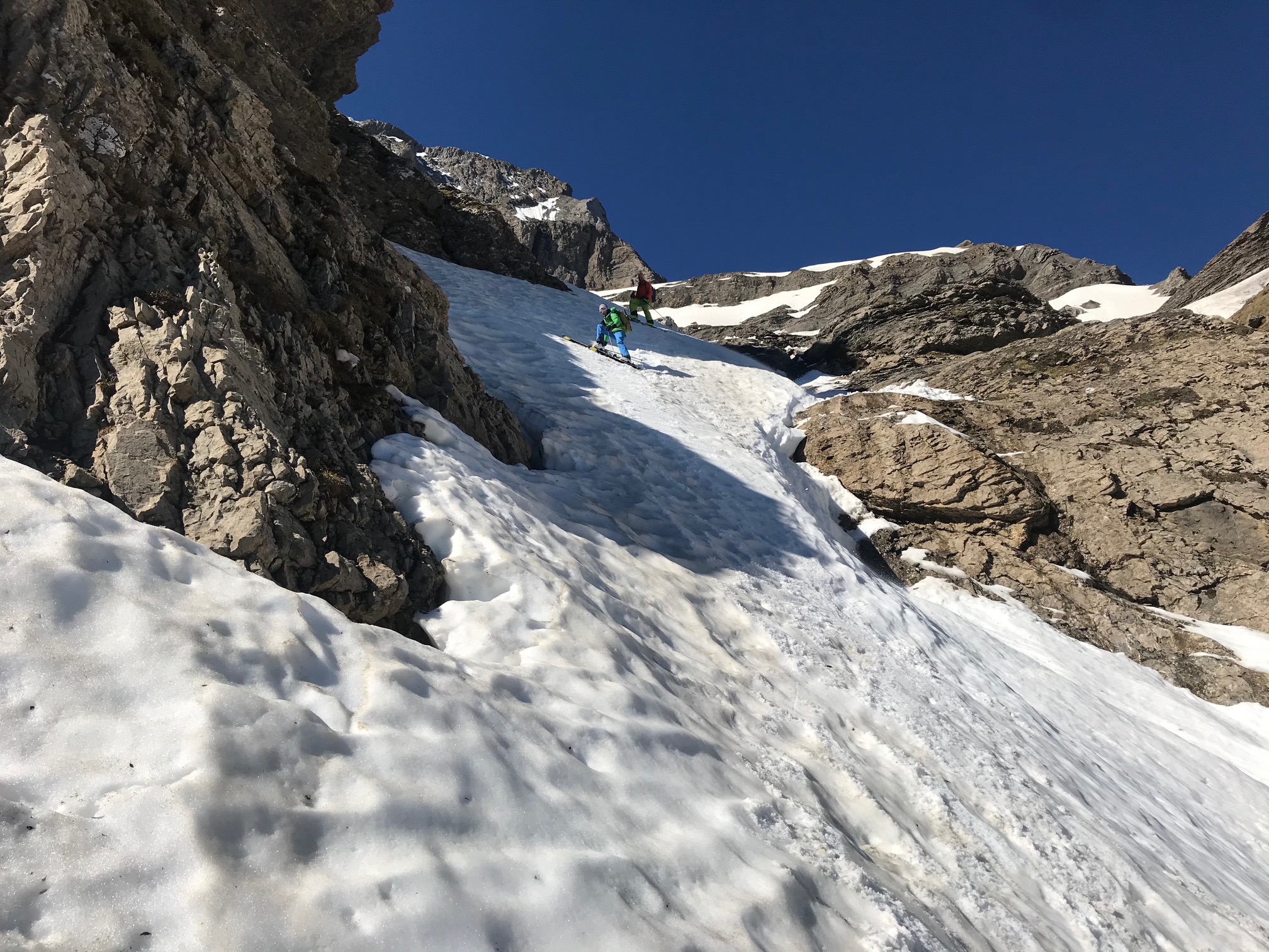 On se prépare pour la descente, y a un peu d’excitation dans l’air. Le début est vraiment large et peu raide, juste bien pour se chauffer les cuisses avant les deux couloirs. On descend le premier goulet sans avoir vraiment de plaisir, mais on s’éclate bien dans le second, un poil moins impressionnant quand même. Bon ils sont très courts ceci dit. La fin sur le névé revenu est excellente !