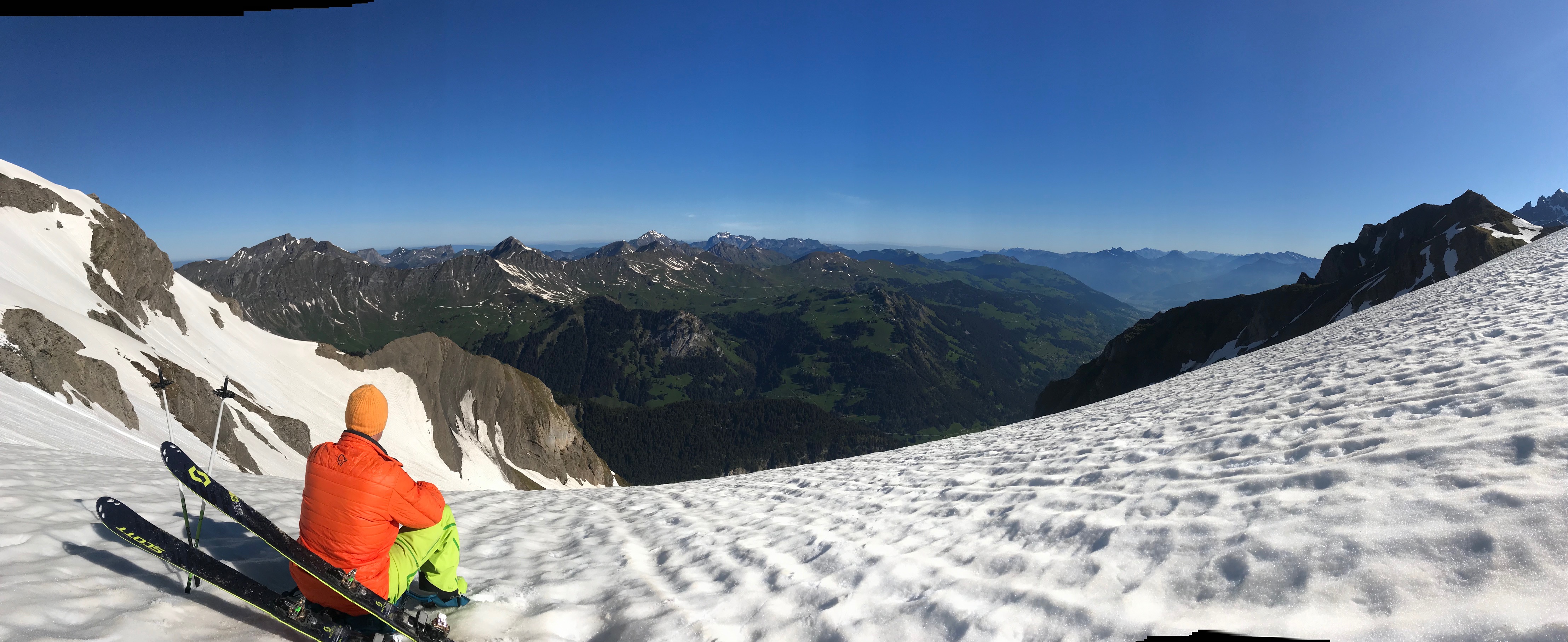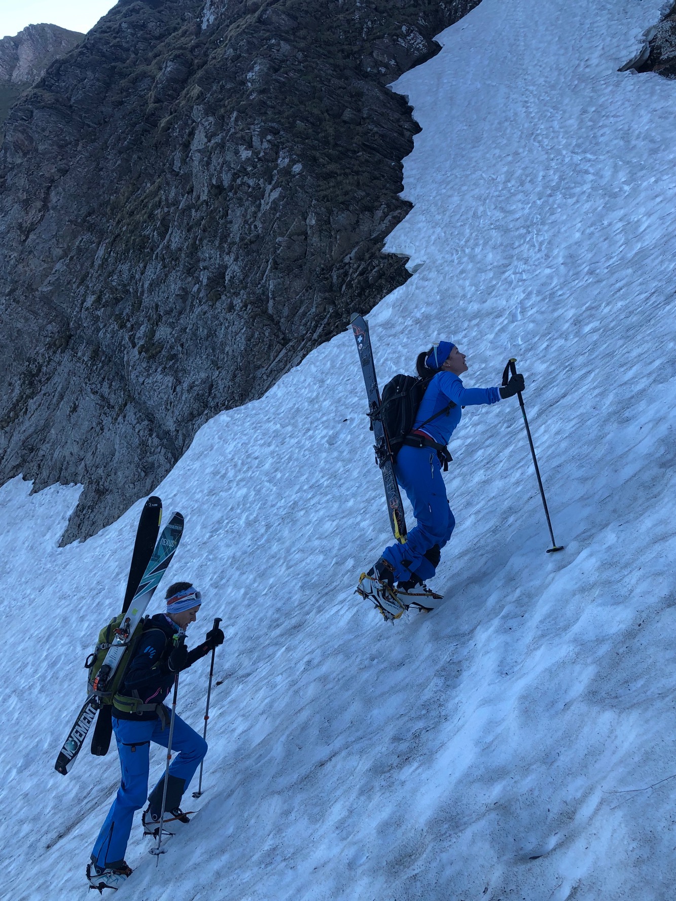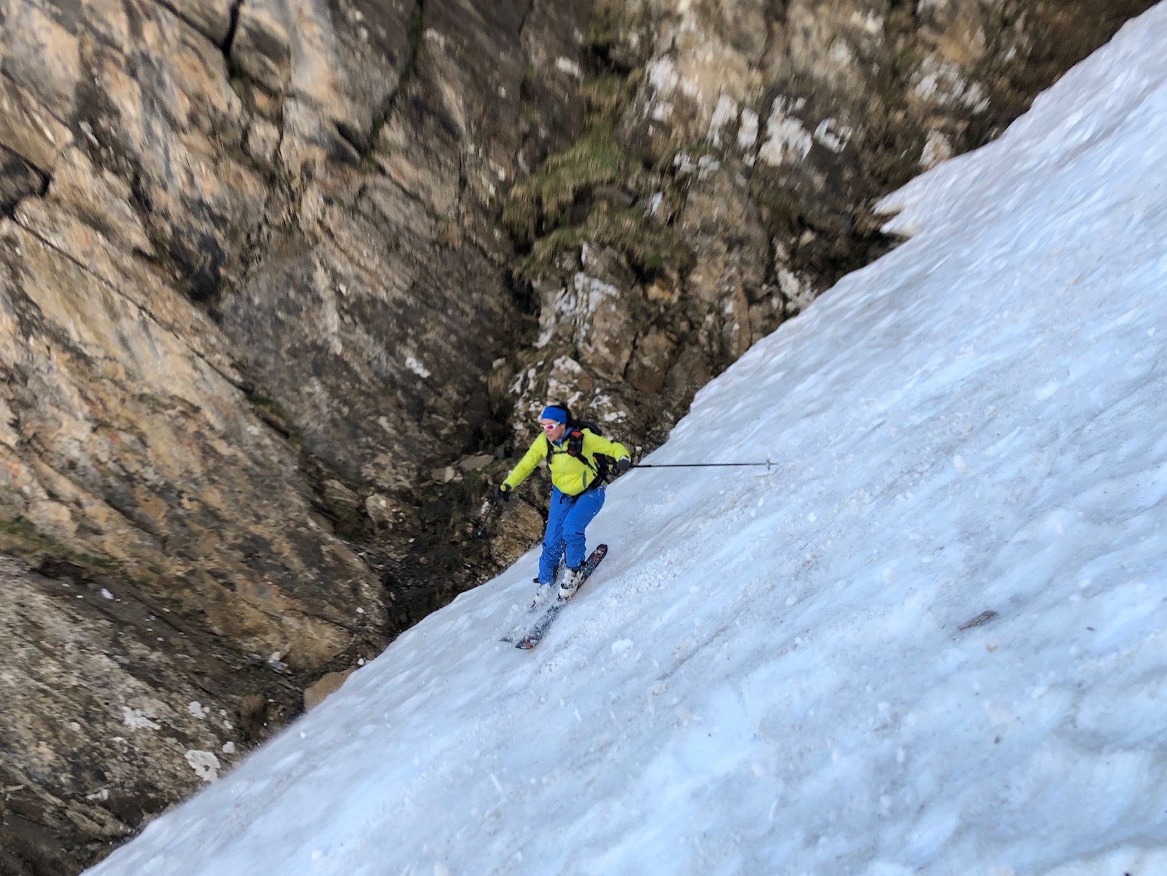 On se prépare pour la descente, y a un peu d’excitation dans l’air. Le début est vraiment large et peu raide, juste bien pour se chauffer les cuisses avant les deux couloirs. On descend le premier goulet sans avoir vraiment de plaisir, mais on s’éclate bien dans le second, un poil moins impressionnant quand même. Bon ils sont très courts ceci dit. La fin sur le névé revenu est excellente !