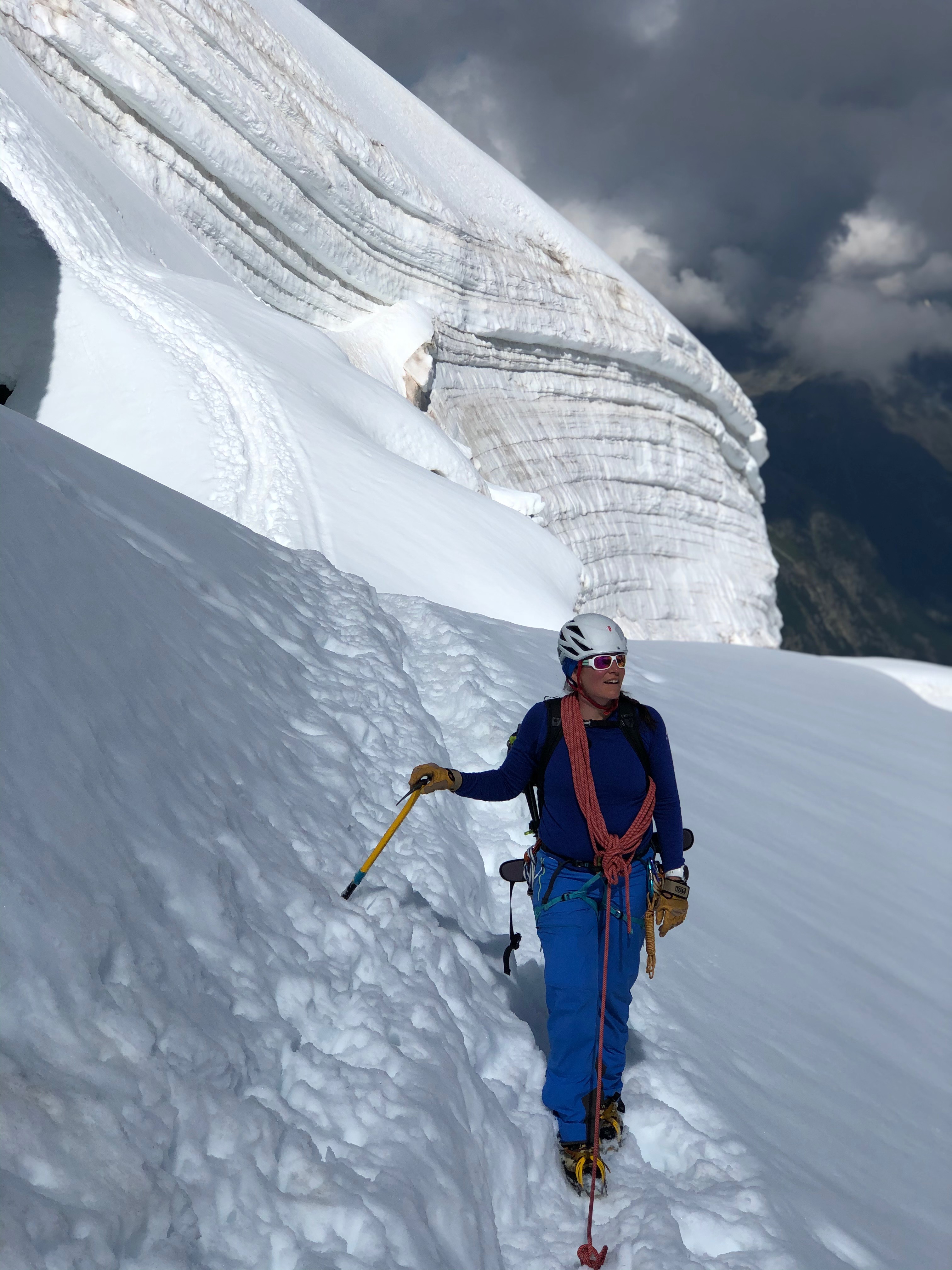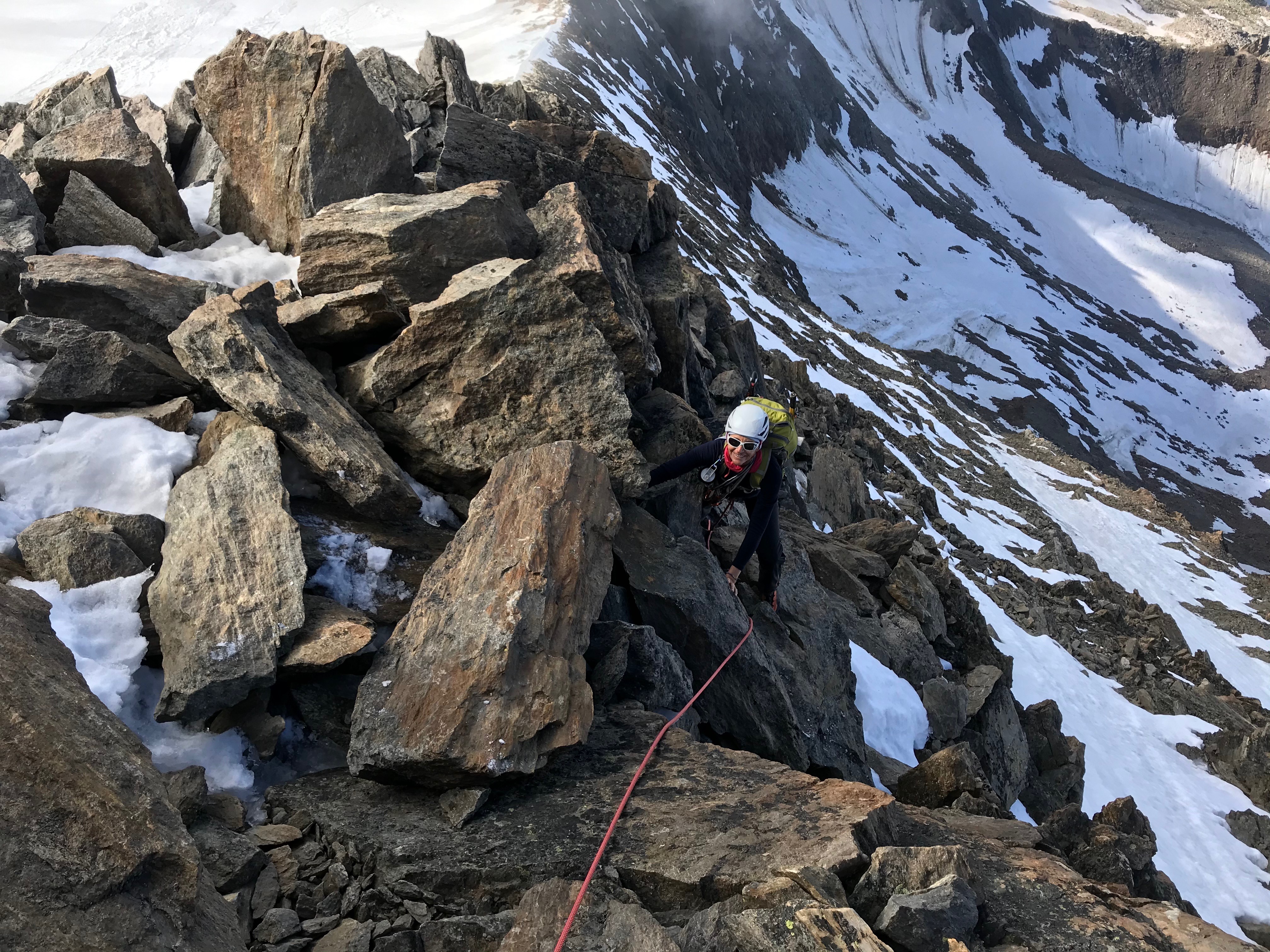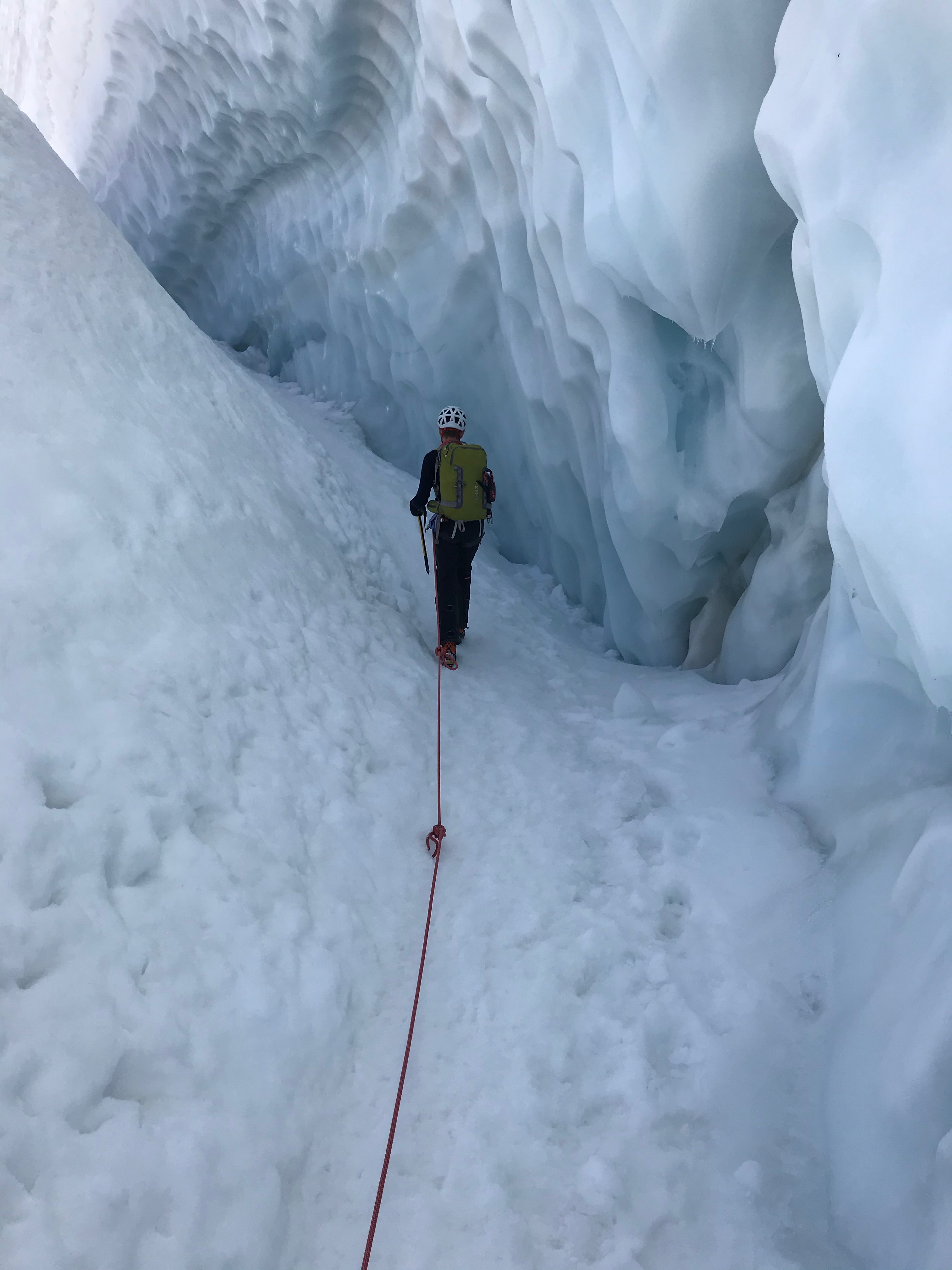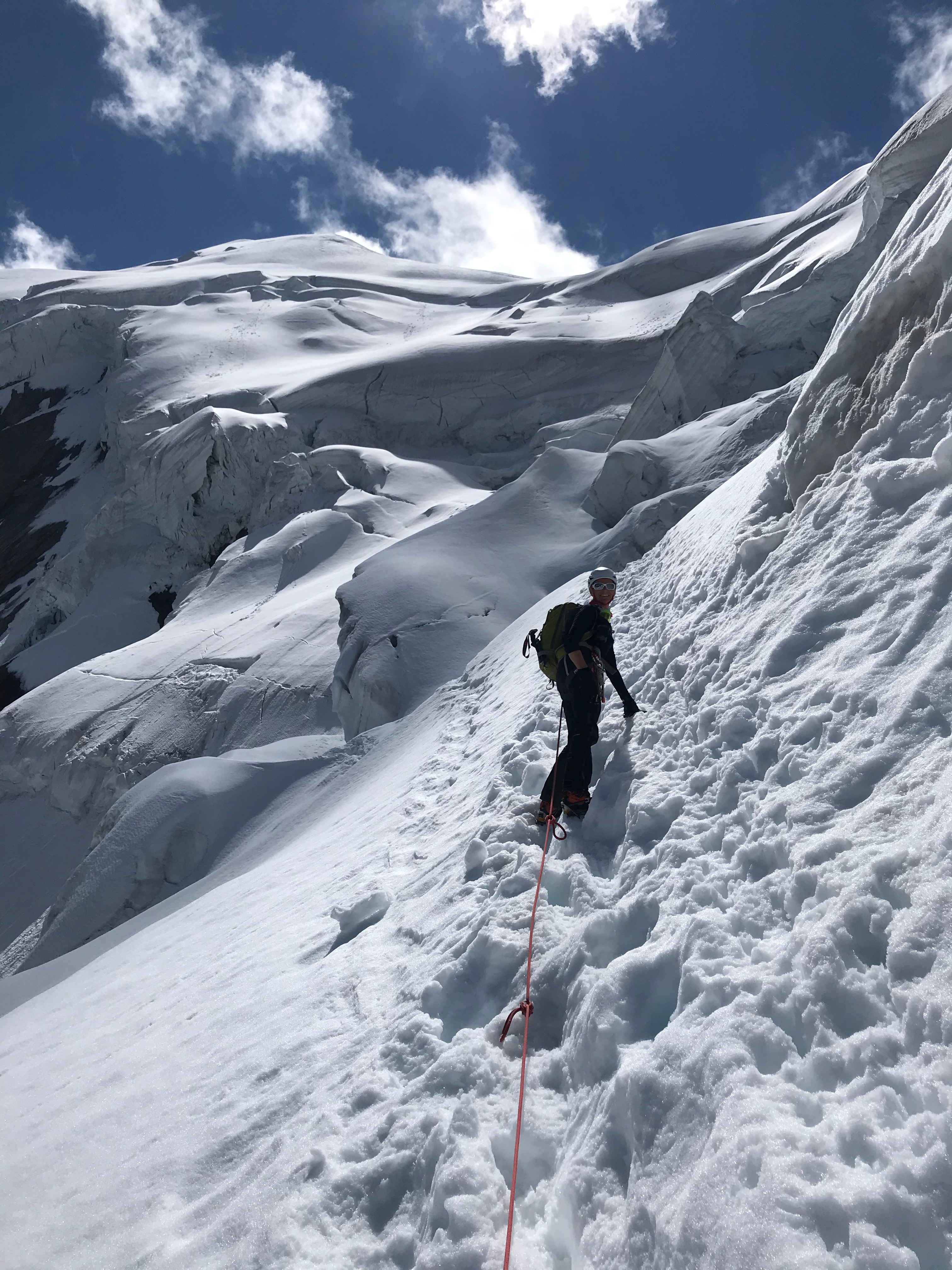 Et bien 8 ans plus tard j’ai toujours eu autant de plaisir. C’est vraiment une belle course, complète, avec de la grimpote sympa dans du beau rocher sans jamais se mettre au taquet, un final hyper esthétique sur un belle arête de neige et alors, une descente incroyable à travers les séracs de la face NW. Elle était encore en super bonnes conditions ce 1er juillet, les guides de la vallée ont fait un boulot de dingue. Mais il y a déjà quelques beaux trous, ça ne va pas durer.