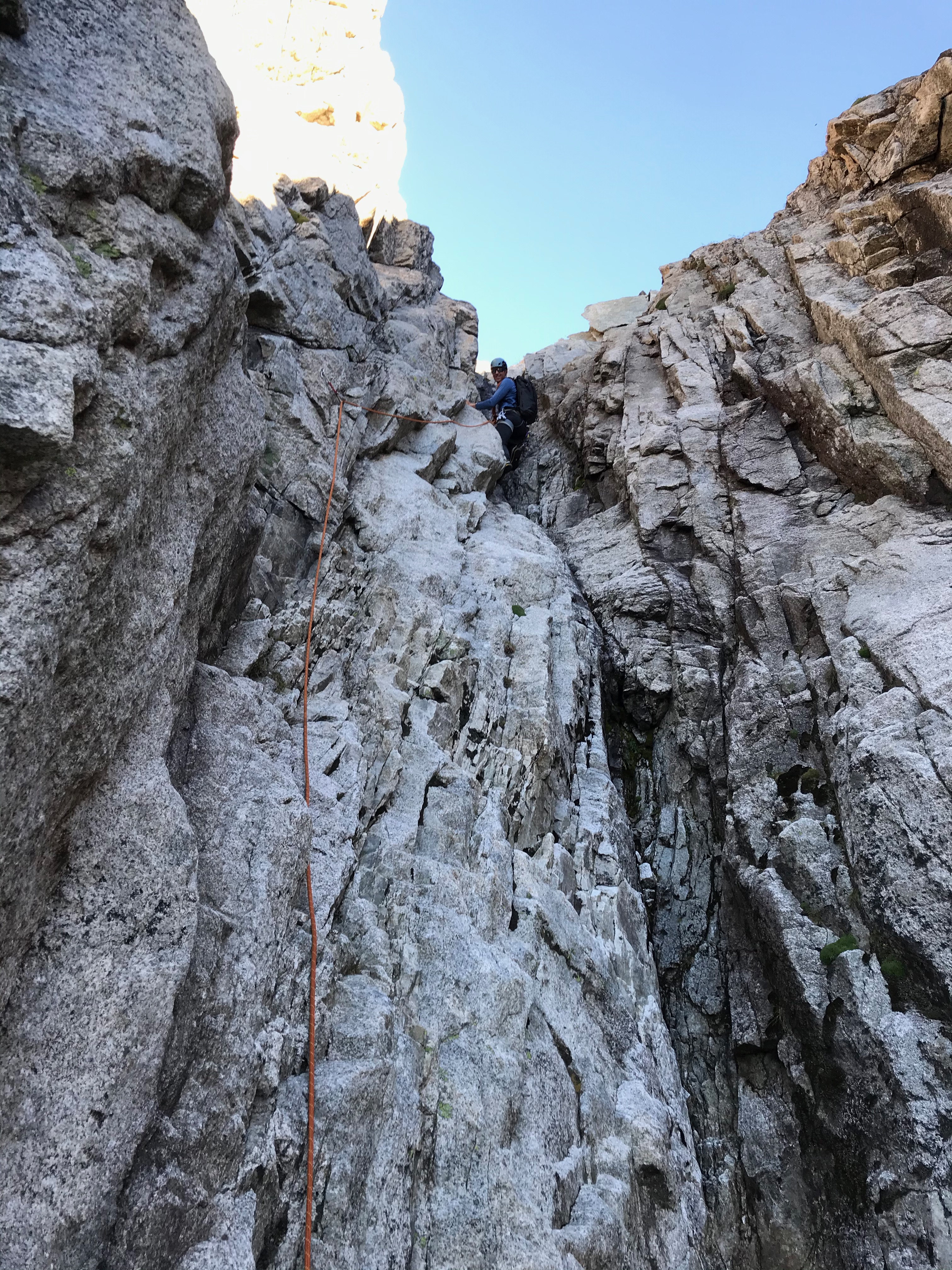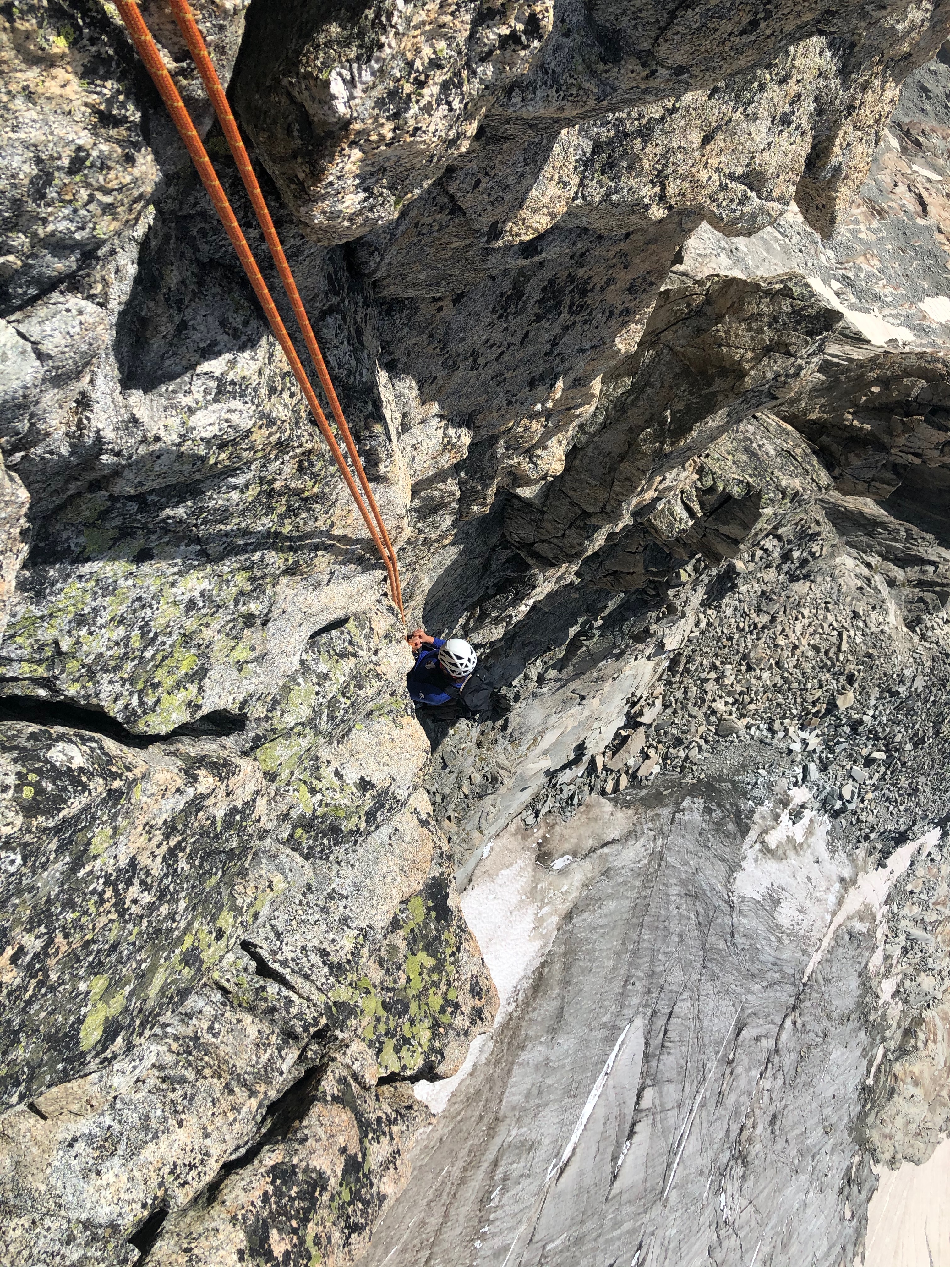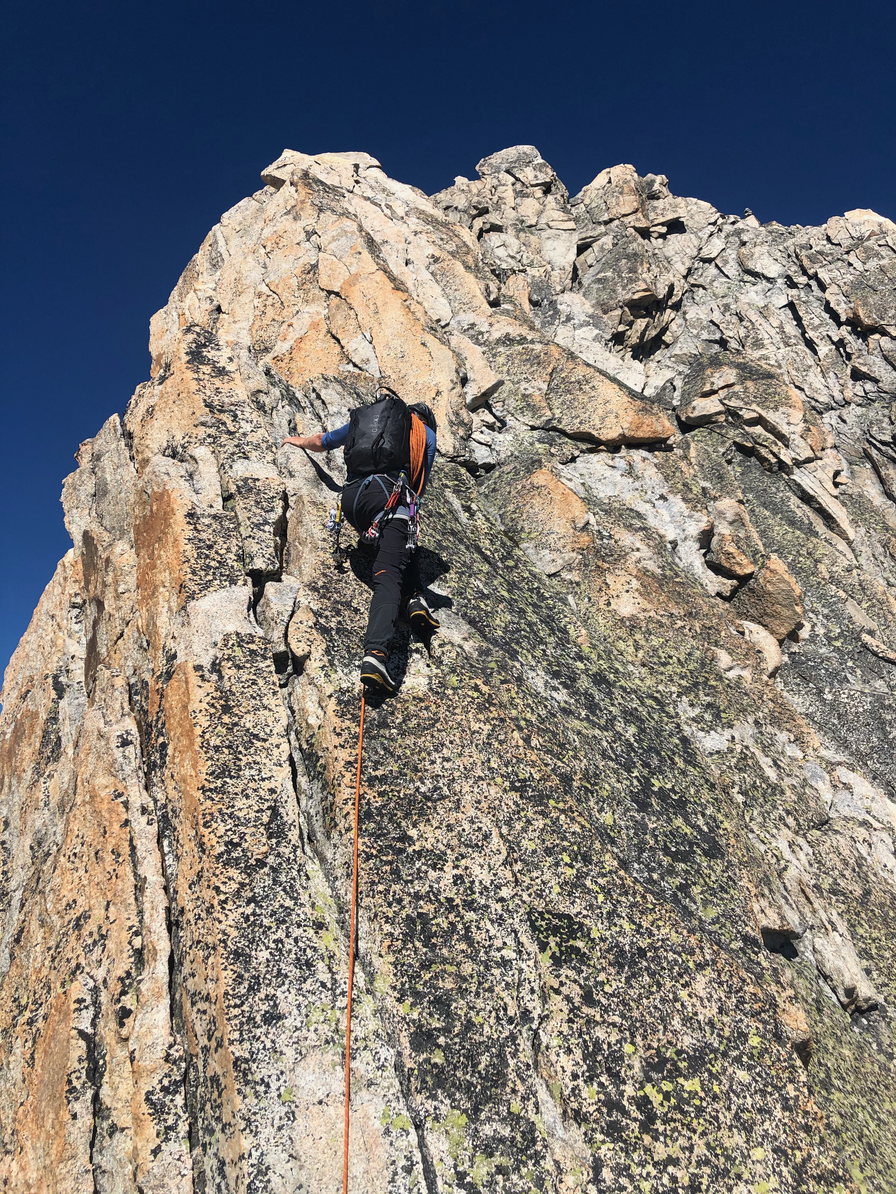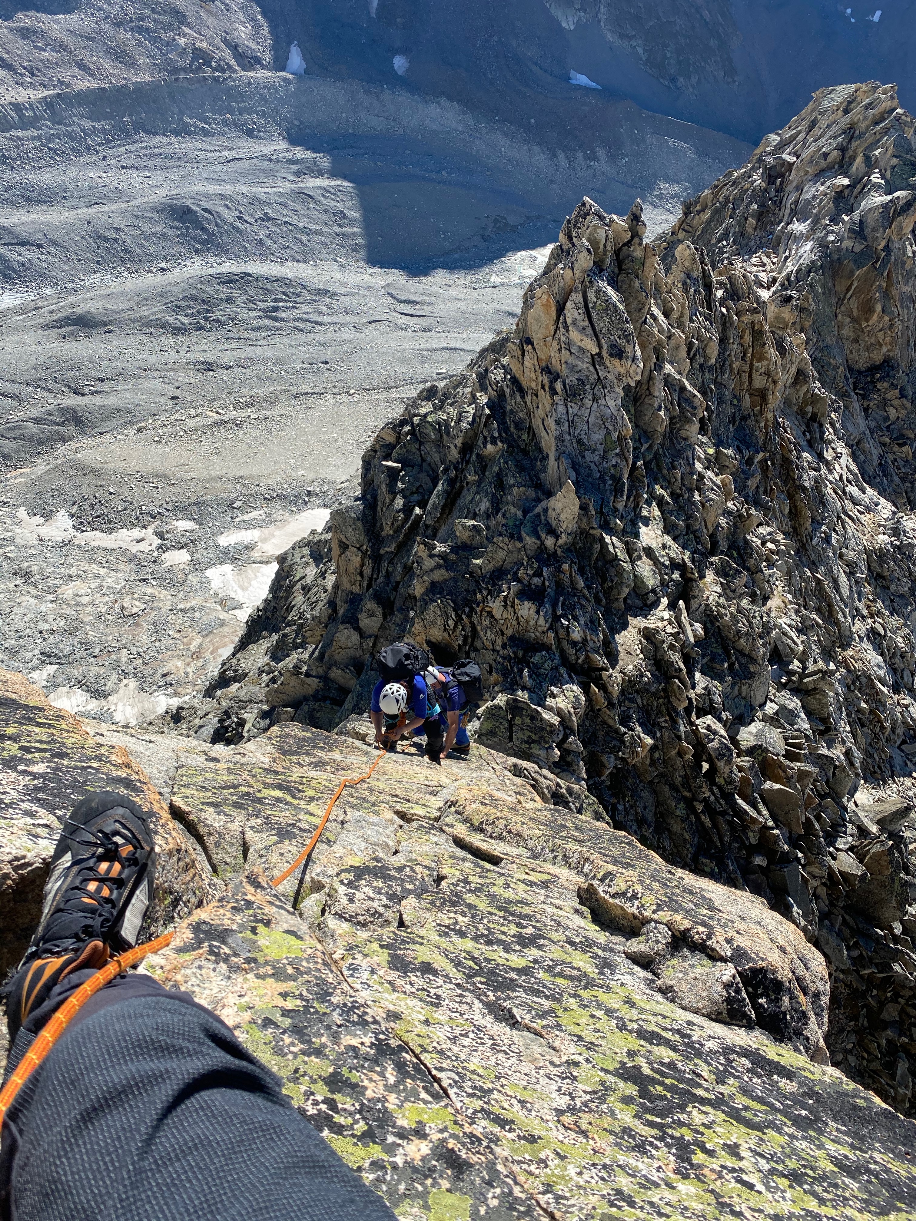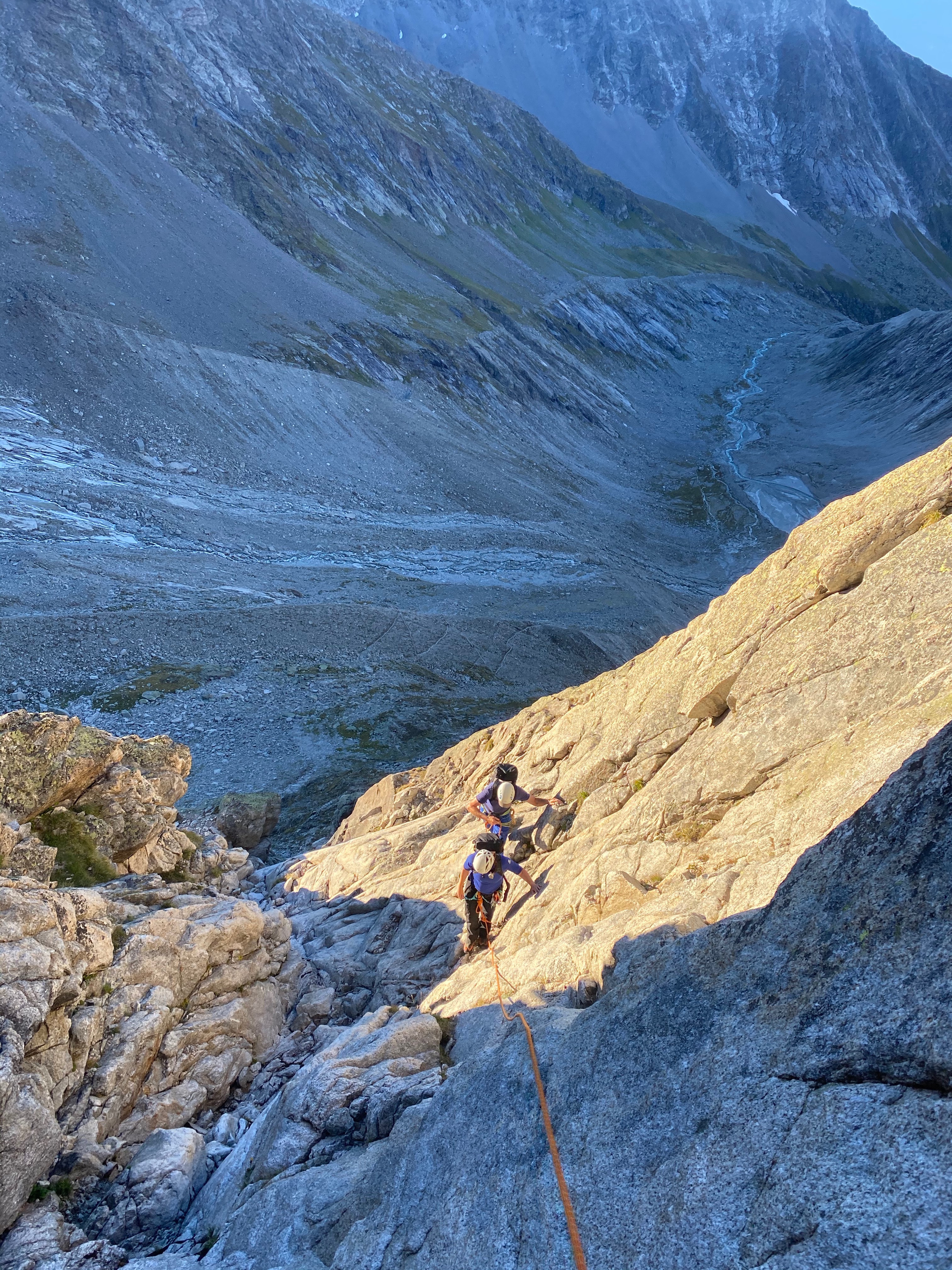 Nous sommes accompagné par Manu, notre guide de montagne et ami, et c’est sans honte aucune que nous apprécions de n’avoir qu’à suivre la corde sans se casser la tête pour trouver l’itinéraire. Le rocher est dément et la vue aussi. Le pompom, c’est la marche d’approche depuis la cabane: 3 minutes à tout péter !