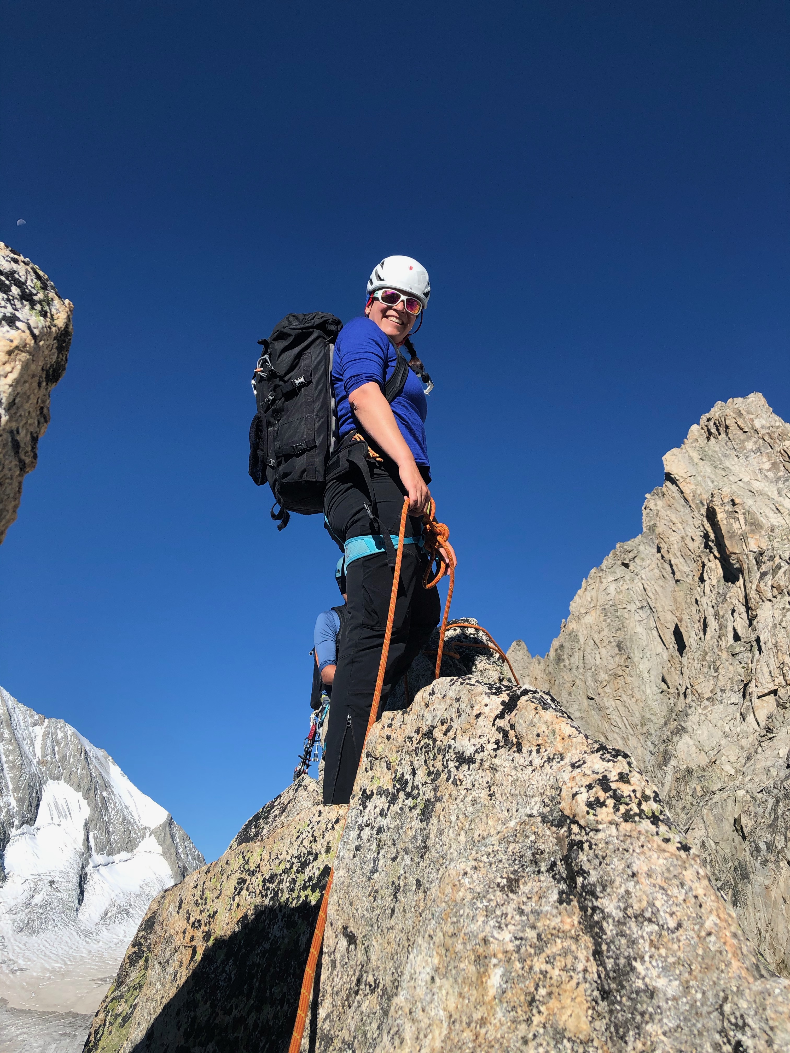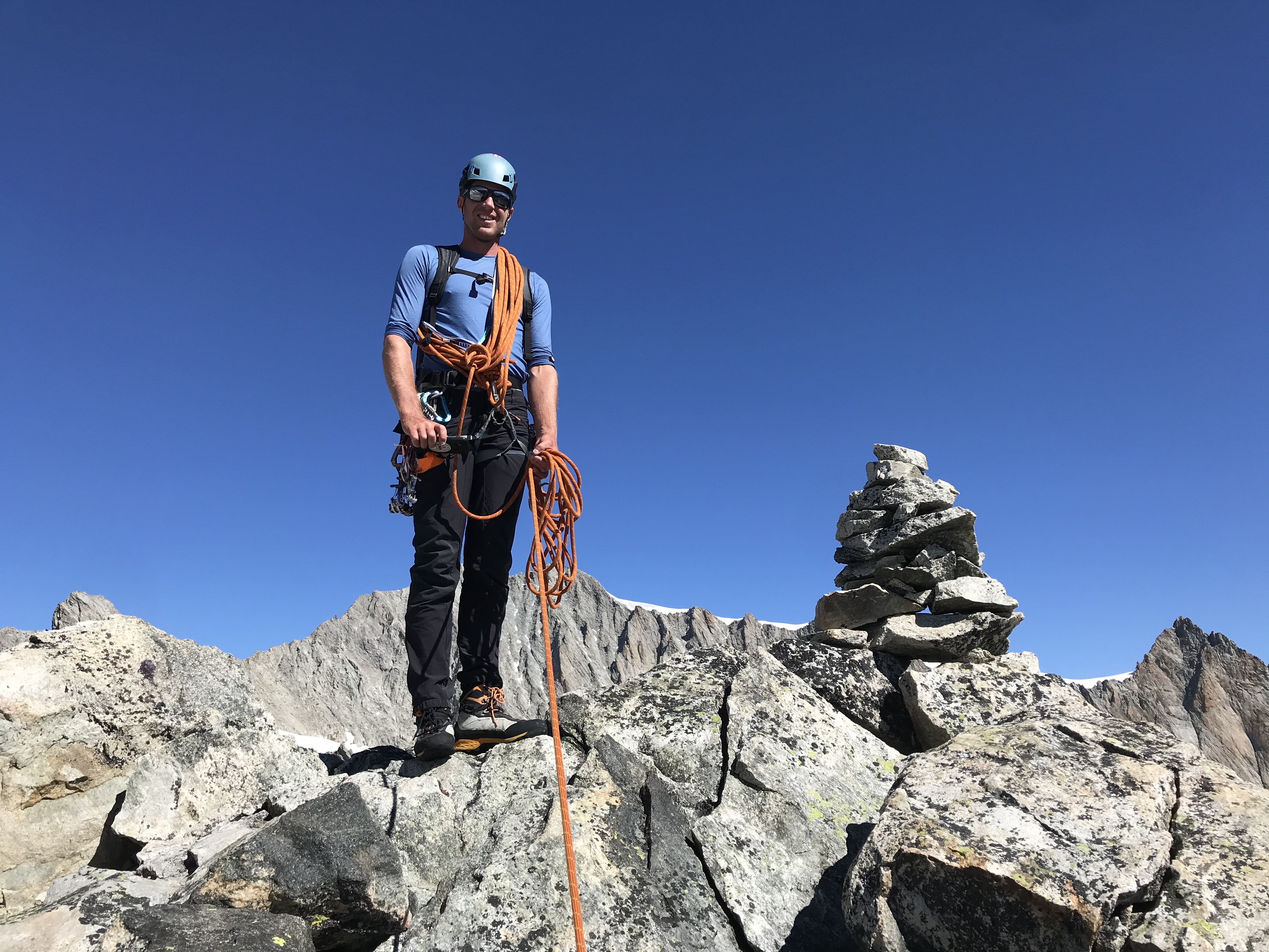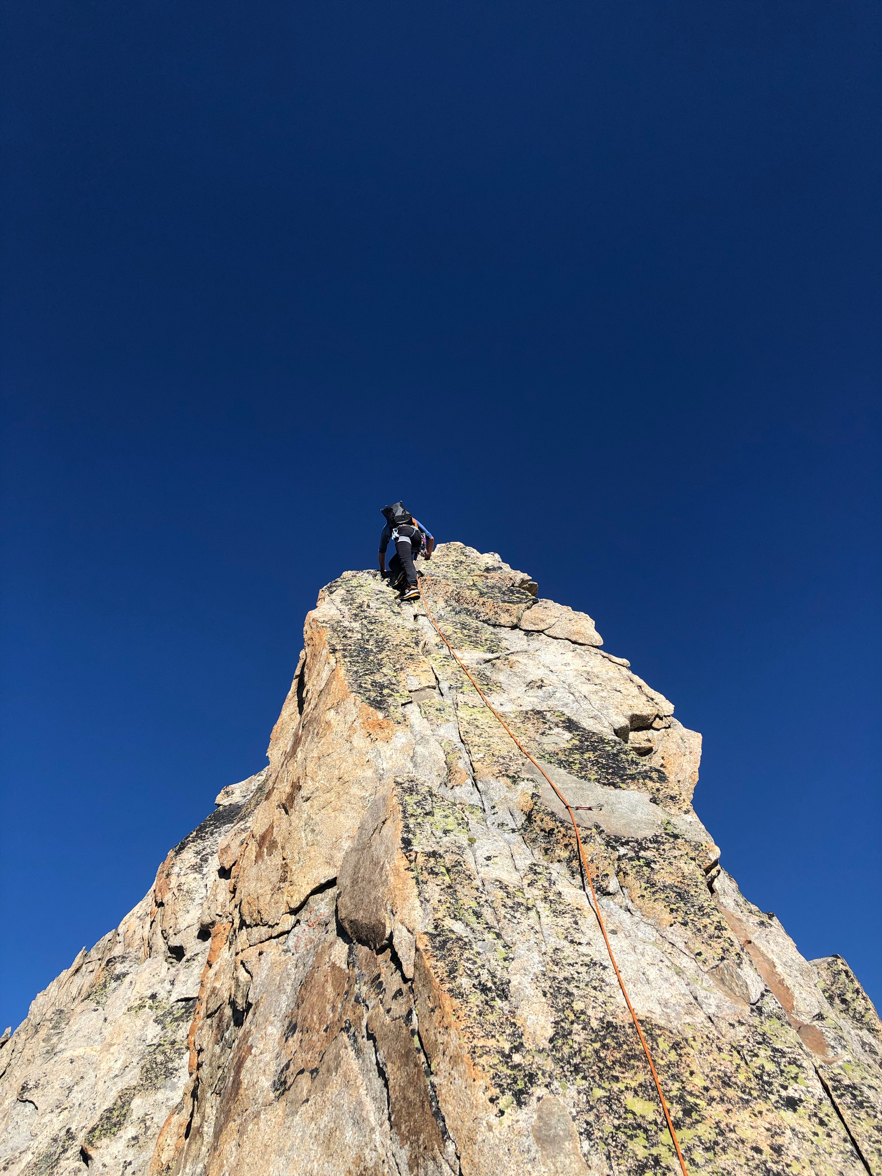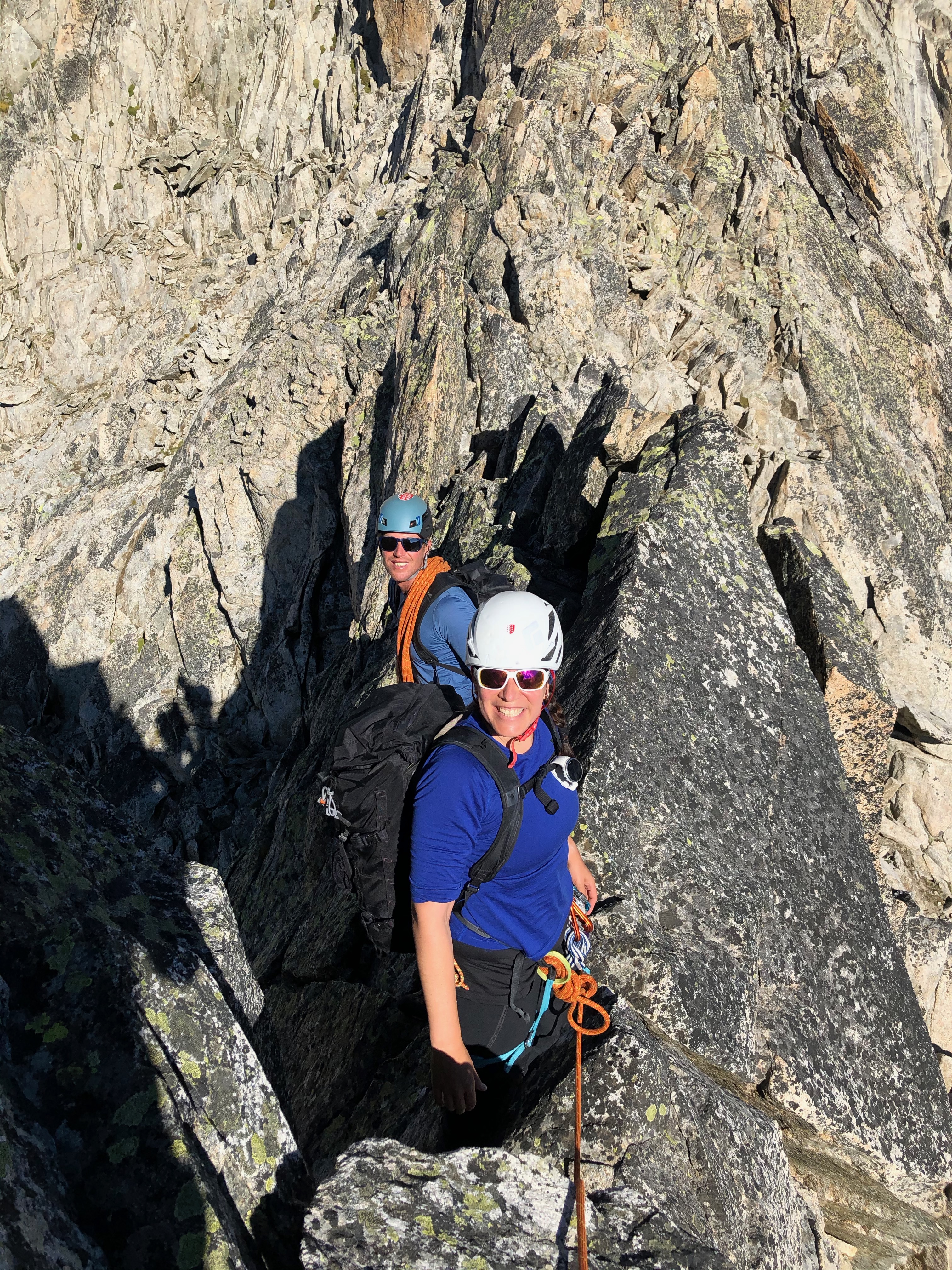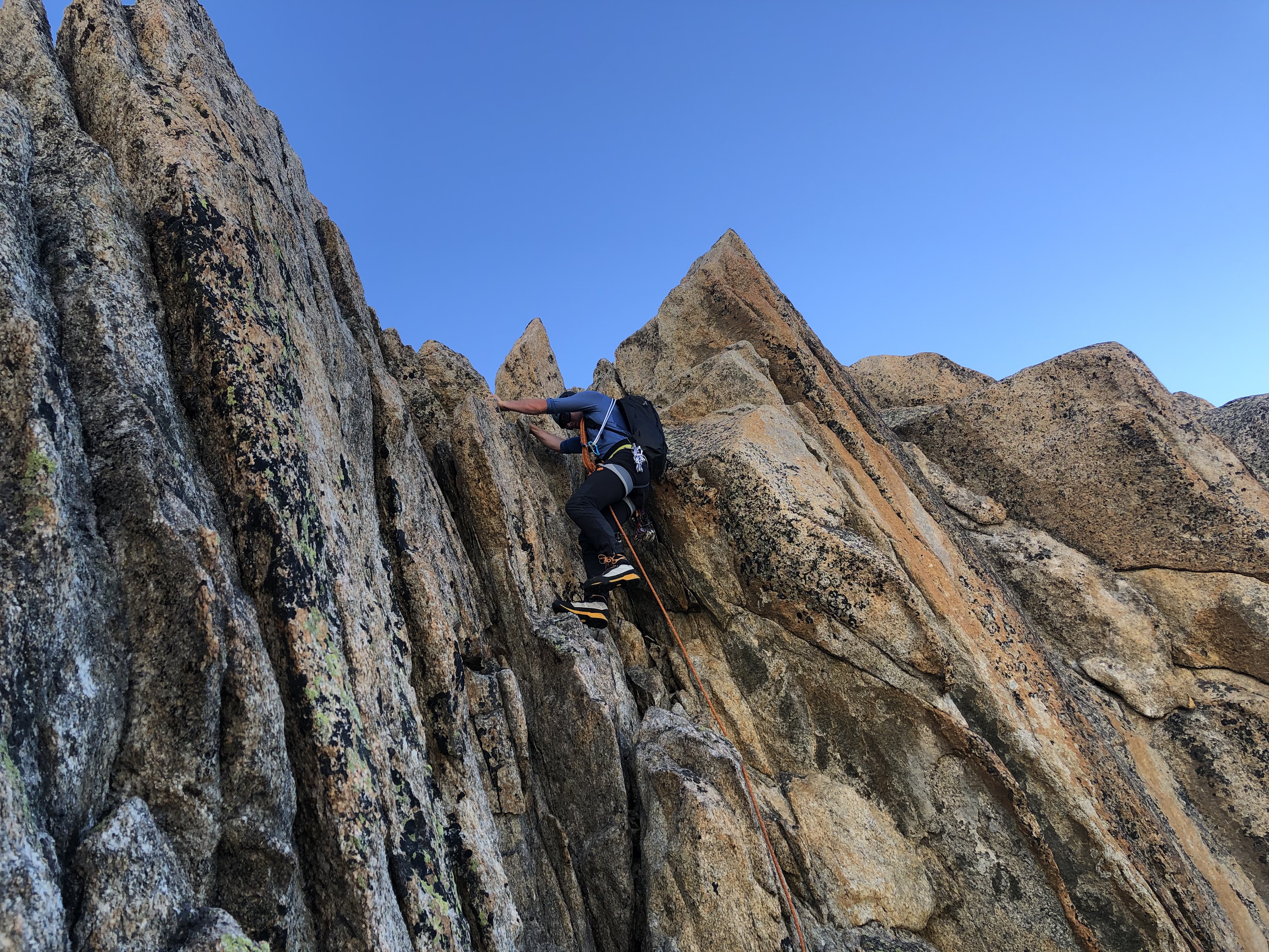 Nous sommes accompagné par Manu, notre guide de montagne et ami, et c’est sans honte aucune que nous apprécions de n’avoir qu’à suivre la corde sans se casser la tête pour trouver l’itinéraire. Le rocher est dément et la vue aussi. Le pompom, c’est la marche d’approche depuis la cabane: 3 minutes à tout péter !