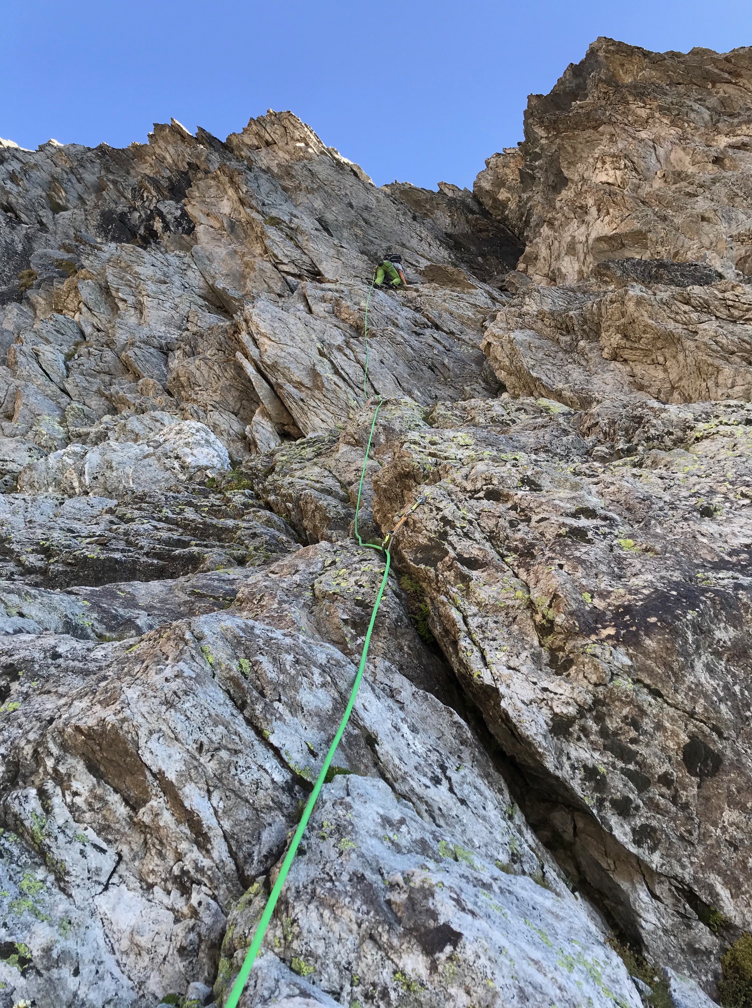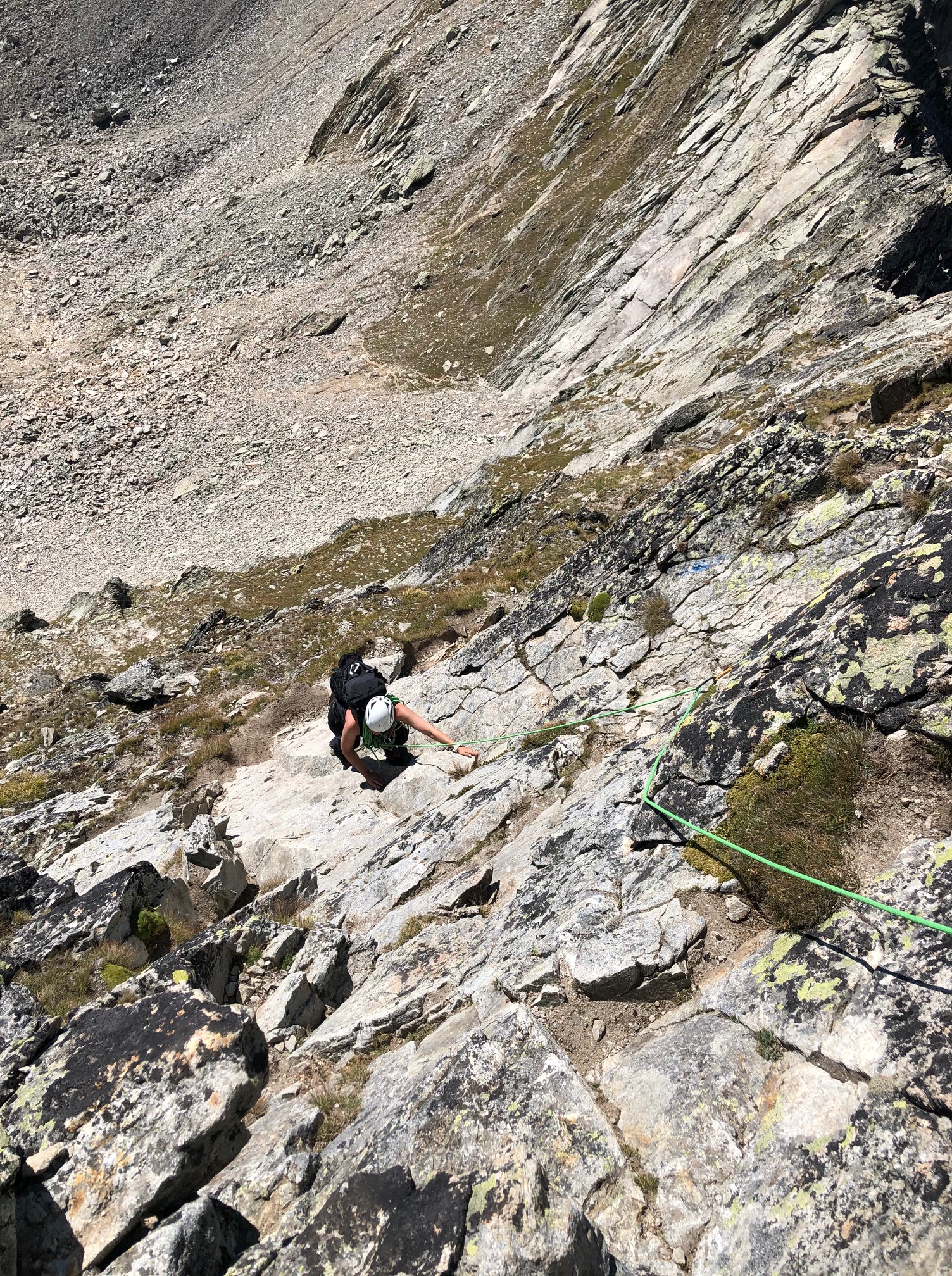 Cette fois nous montons pour deux jours et partons d’abord visiter le sommet voisin qui répond au doux nom de Chlys Öugstchummuhorn. Plusieurs personnes nous ont recommandé la voie Salamander. Si j’avais eu la bonne idée de lire le topo avant de partir, ça nous aurait probablement simplifié la vie, mais c’est bien connu, on n’aime pas ce qui est simple. Avec la photo de la voie en poche, on cherche comme des malades les spits dans le faux couloir. Faut dire qu’avec le nombre de traces de sente et de cairns, on n’est surement pas les premiers à se planter 😉 Finalement on trouve le départ.