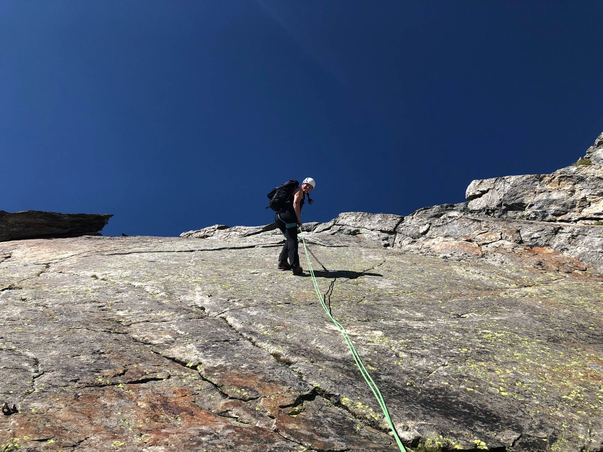 Le lendemain nous retournons au Wiwannihorn, mais cette année nous voulons faire une voie sur la gauche, nous choisissons Papillon. Après ma mauvaise nuit, je n’ai pas le moral de grimper en tête mais Pål ne se fait pas prier ! En second, j’apprécie vraiment la voie qui est super belle et variée. Les deux longueurs de 5b sont très bien équipées. Les difficultés de la deuxième 5b peuvent être contournées par la gauche, mais il n’y a pas de points.