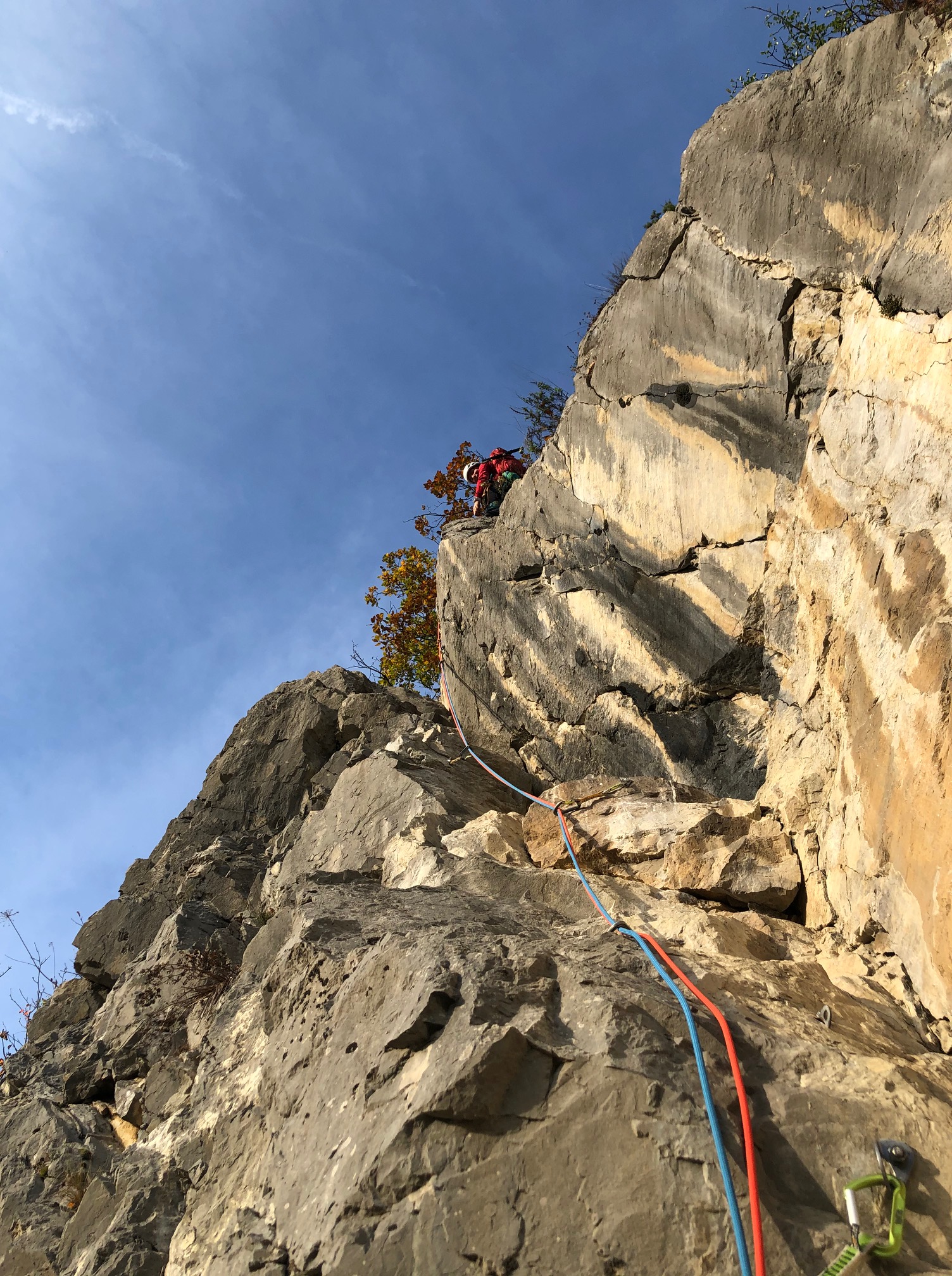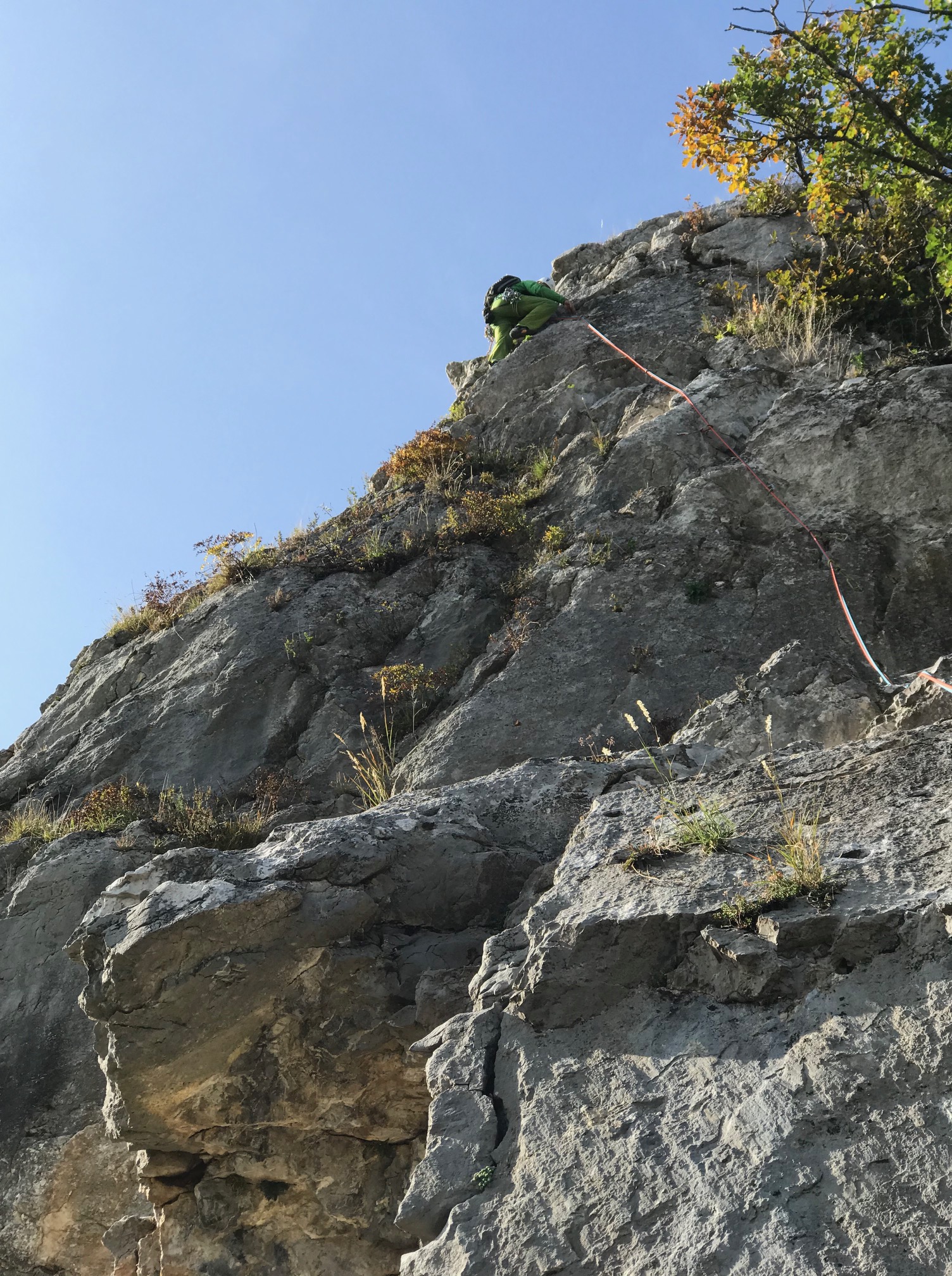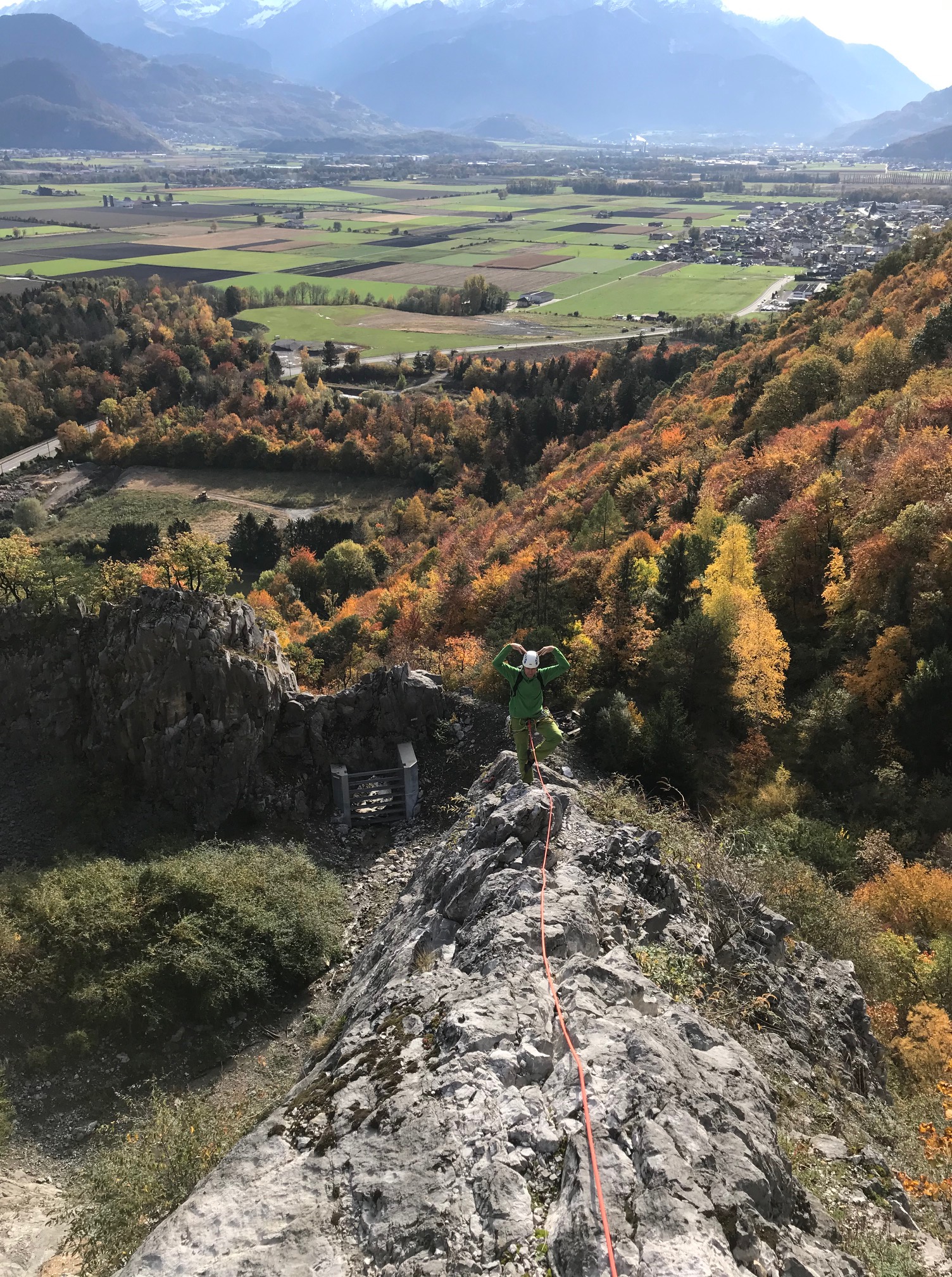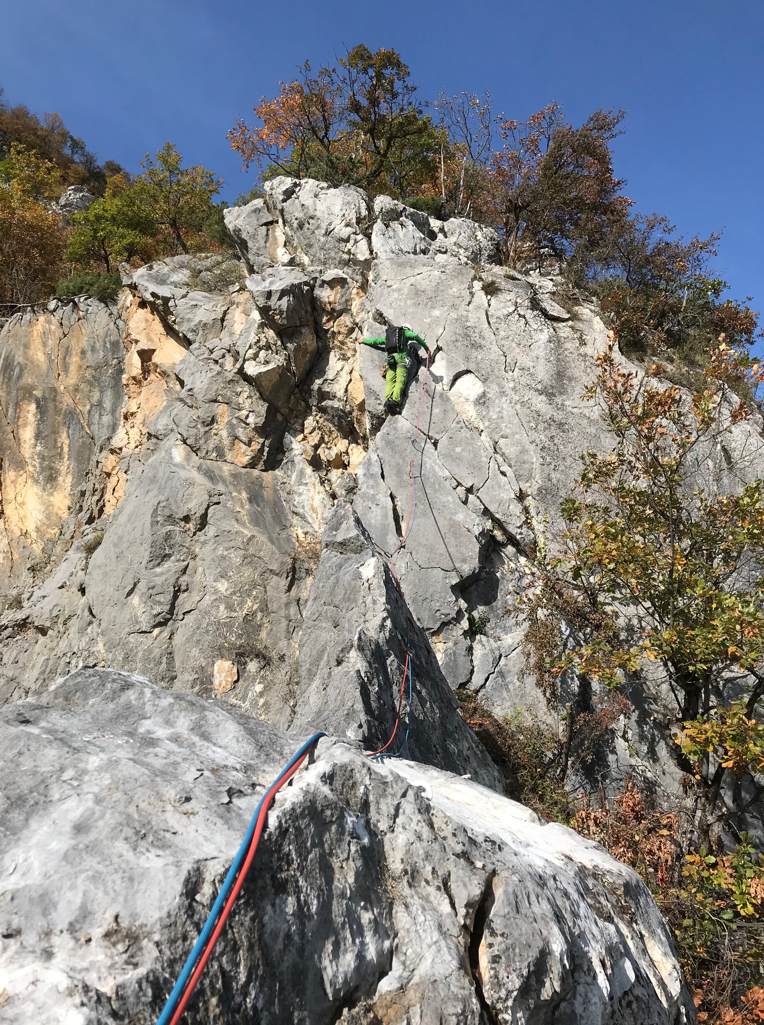 La voie est super, variée, avec des bouts d’arête, des rappels, des dièdres, on ne voit pas le temps passer. L’ambiance entre les cordées est excellente, on se marre bien. L’arrivée au sommet est épique, avec le dernier relai gardé par une chèvre et son bouc caractériel. Eveline improvisera un relai sur un arbre, ce n’est qu’à l’arrivée de notre cordée et donc à 5 humains, que nous arriverons à défendre notre pique-nique ! Non mais !