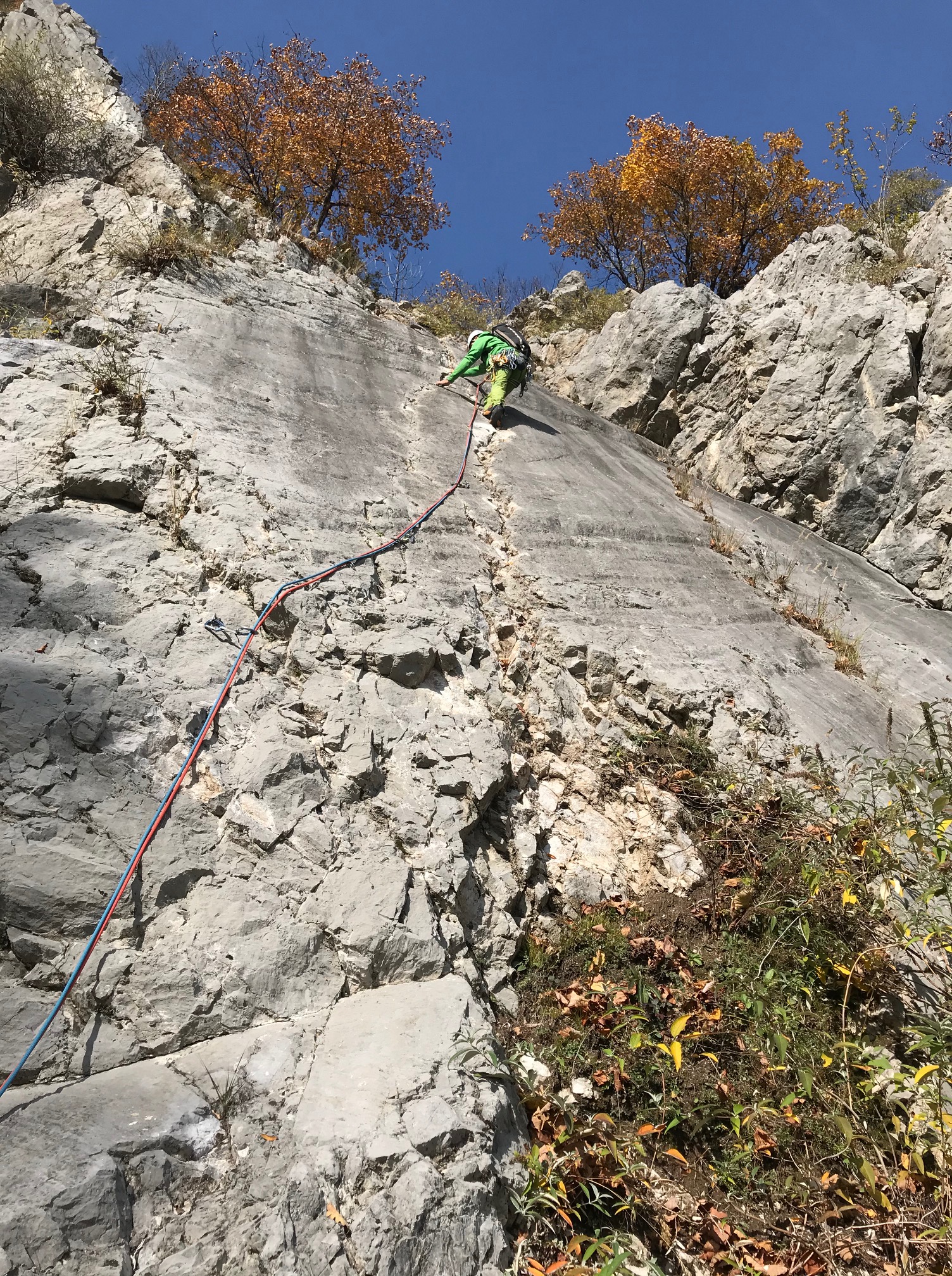 Lors de notre week-end ViNicole, Sophie m’avait parlé de cette voie, dont les 8 premières longueurs étaient déjà décrites dans la dernière édition du topo Rémy, et pour laquelle une suite de 12 longueurs venait d’être équipée.