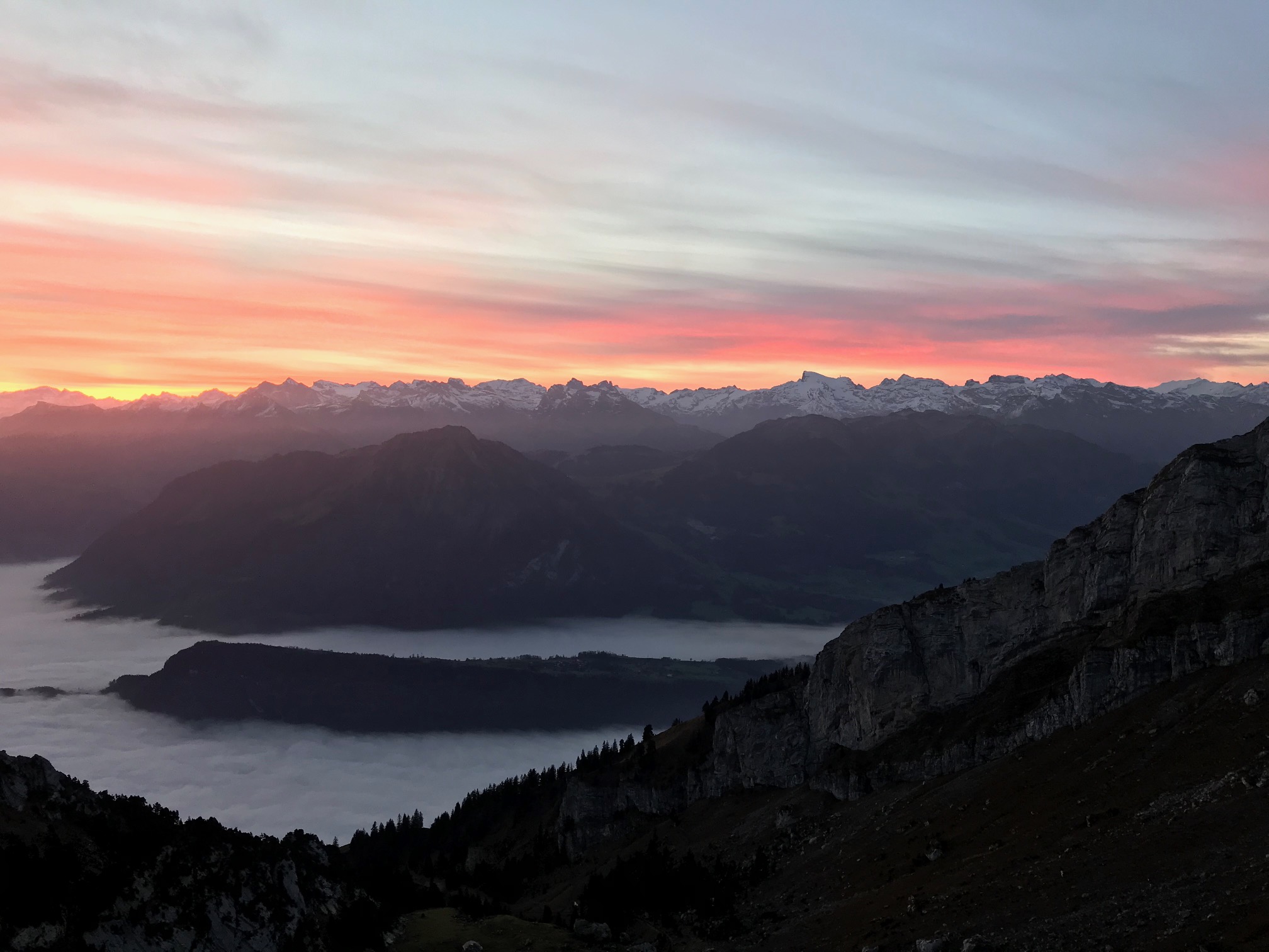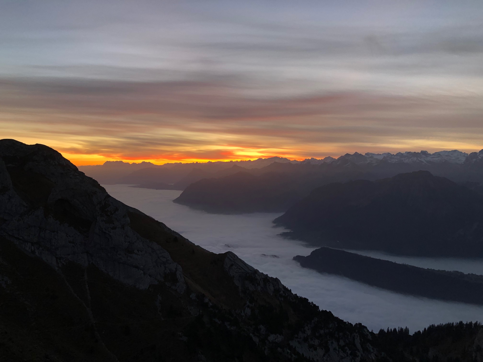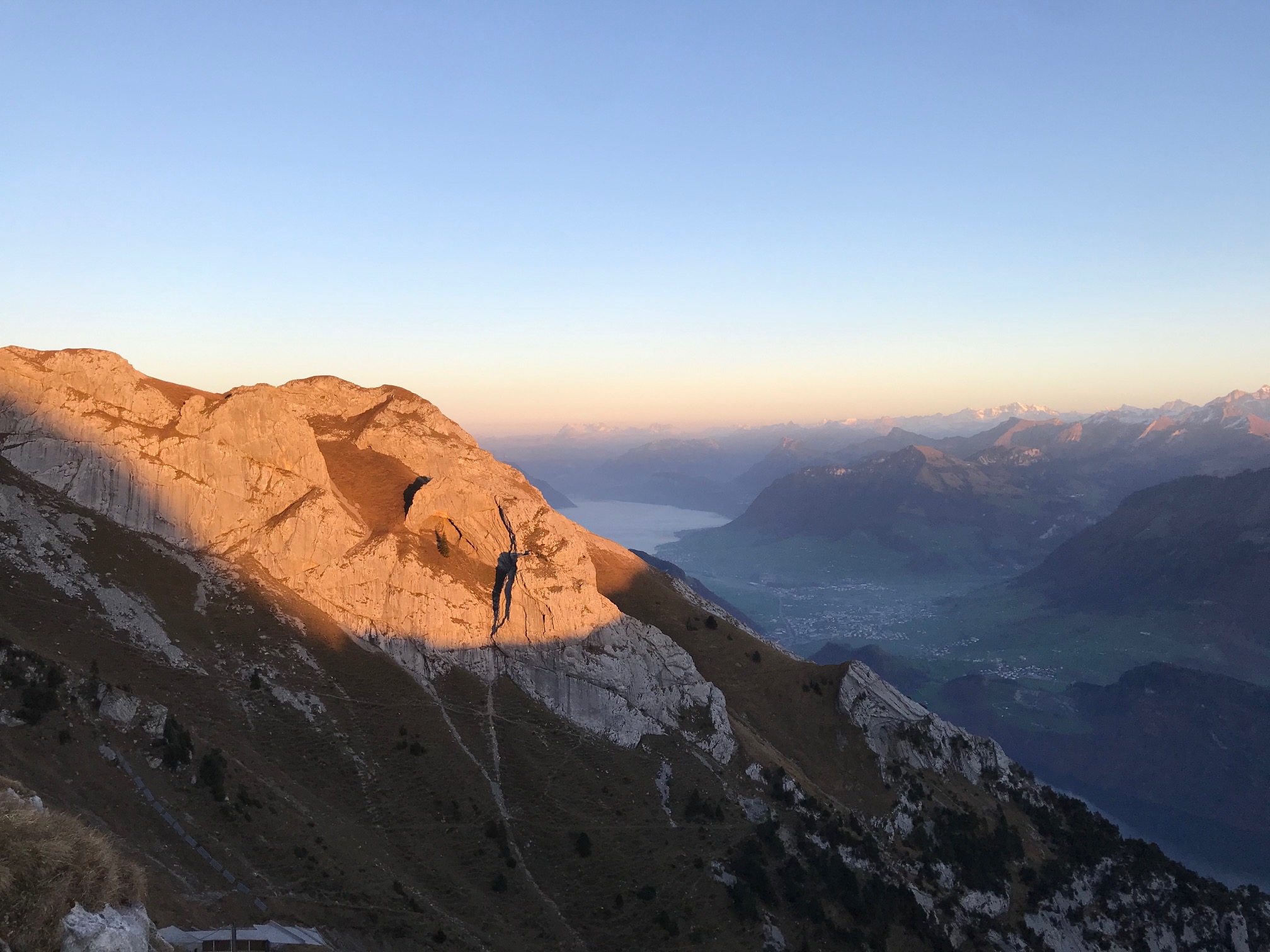 En même temps, on habite un pays fantastique dans lequel on nous laisse sortir à plus d’un kilomètre de chez nous, on n’a pas vraiment le droit de se plaindre. On profite donc de notre semaine de vacances pour (re)découvrir le Pilatus, montagne emblématique de Suisse Centrale, habituellement envahie de hordes de touristes asiatiques. On part tranquilles le lundi matin, et on passe l’après-midi à grimpoter sur un petit jardin d’escalade sympa à 30 minutes du sommet. On se trouve une cabane 5 étoiles sur le chemin qui contourne l’Esel et on passe une super soirée, à admirer le coucher de soleil sur le lac des 4 cantons. La nuit sera finalement bien moins fraîche que prévu à l’abris de la rosée, et on se lève frais et dispos pour attaquer cette Galtigengrat.
