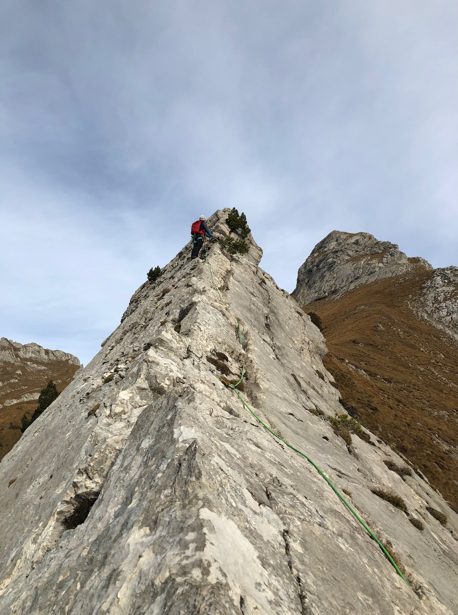 La difficulté augmente sensiblement pour la dernière tour, mais pour Pål ce n’est pas un problème, il fait tout ça en grosses les doigts dans le nez ! En second, je peux me permettre d’apprécier pleinement le moment, le rocher est excellent, adhérent, limite abrasif, la vue est démente et l’équipement rassurant. Le kiff total !