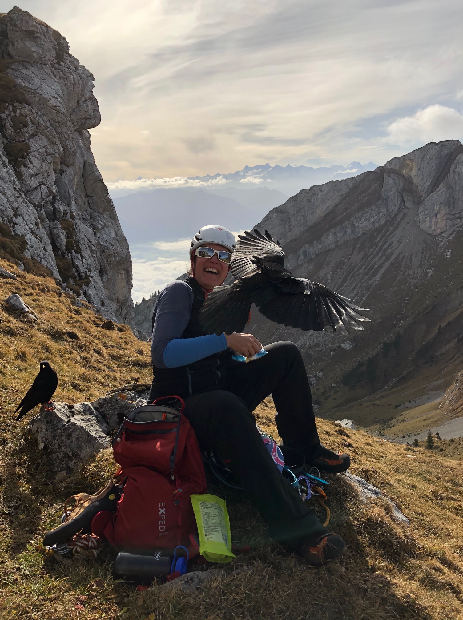 Après un casse-croûte au sommet de la voie, largement partagé avec les chocards du coin, on passe dans « notre » cabane récupérer le matos de bivouac laissé sur place avant de redescendre sous le brouillard.