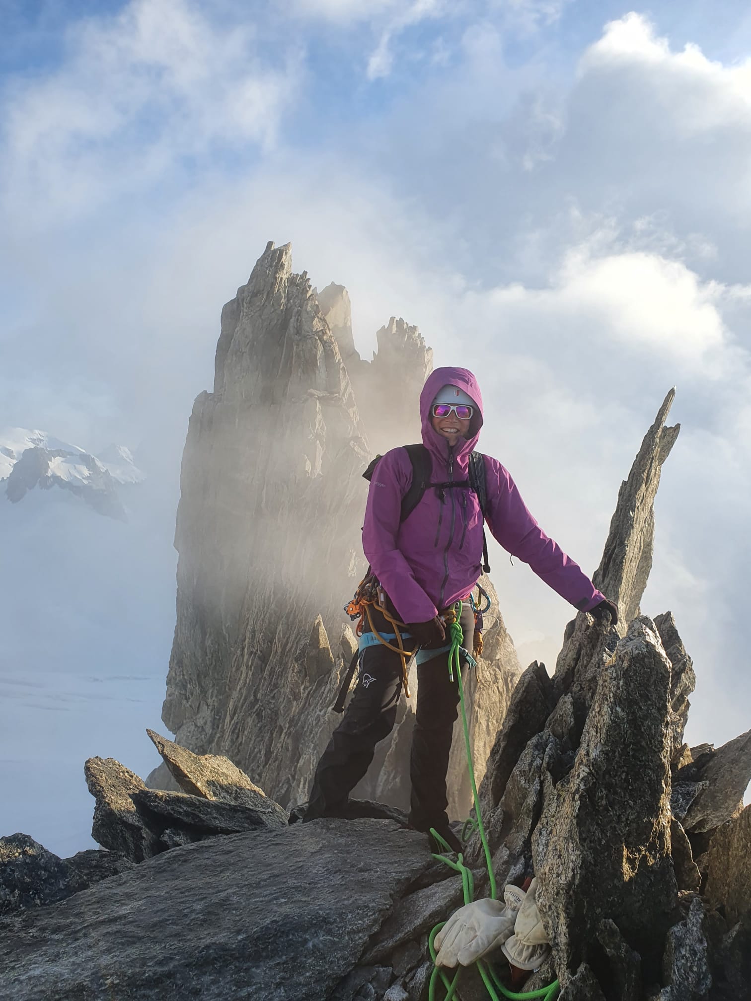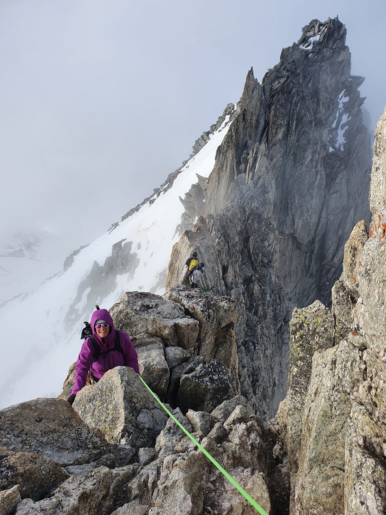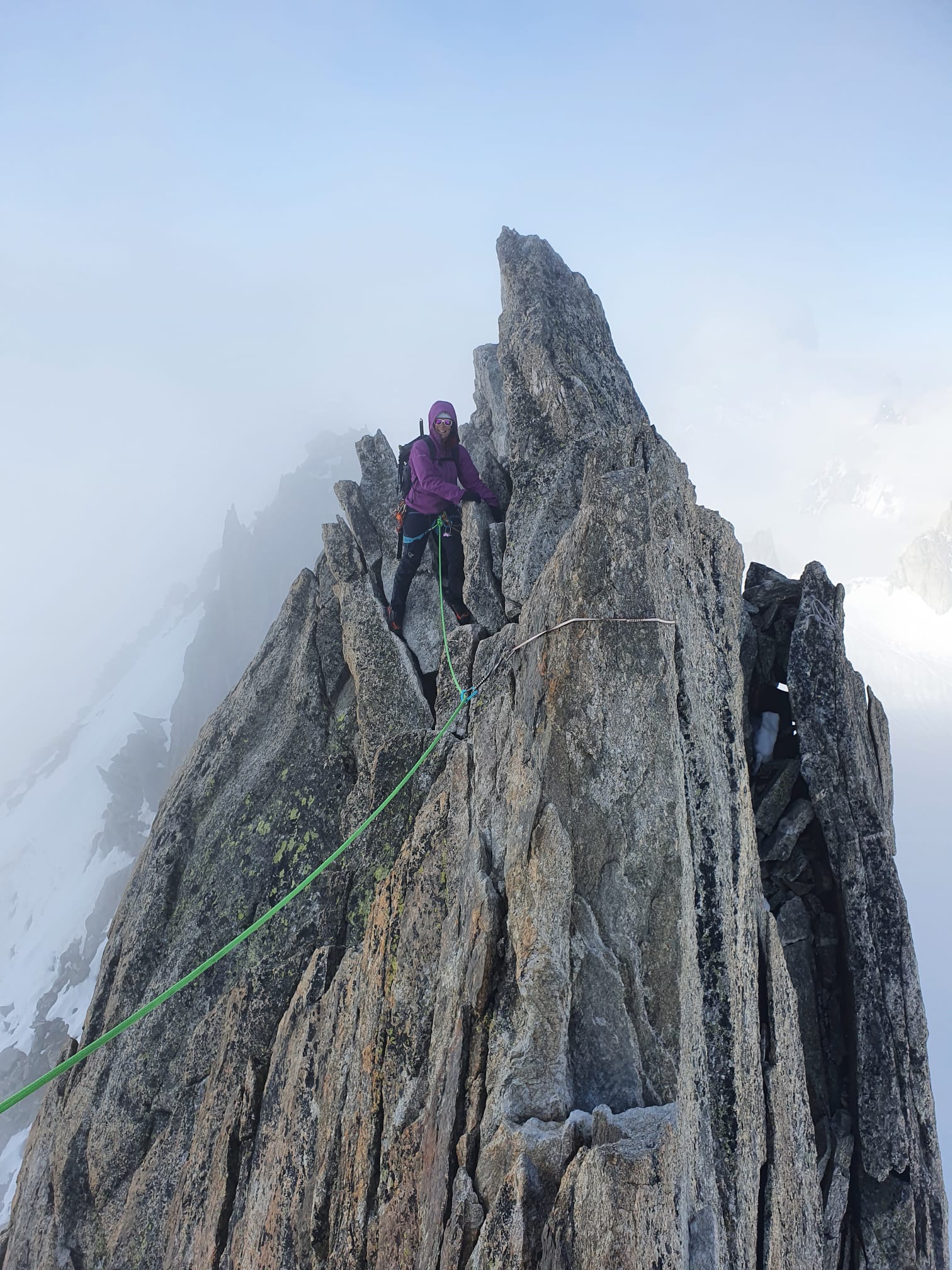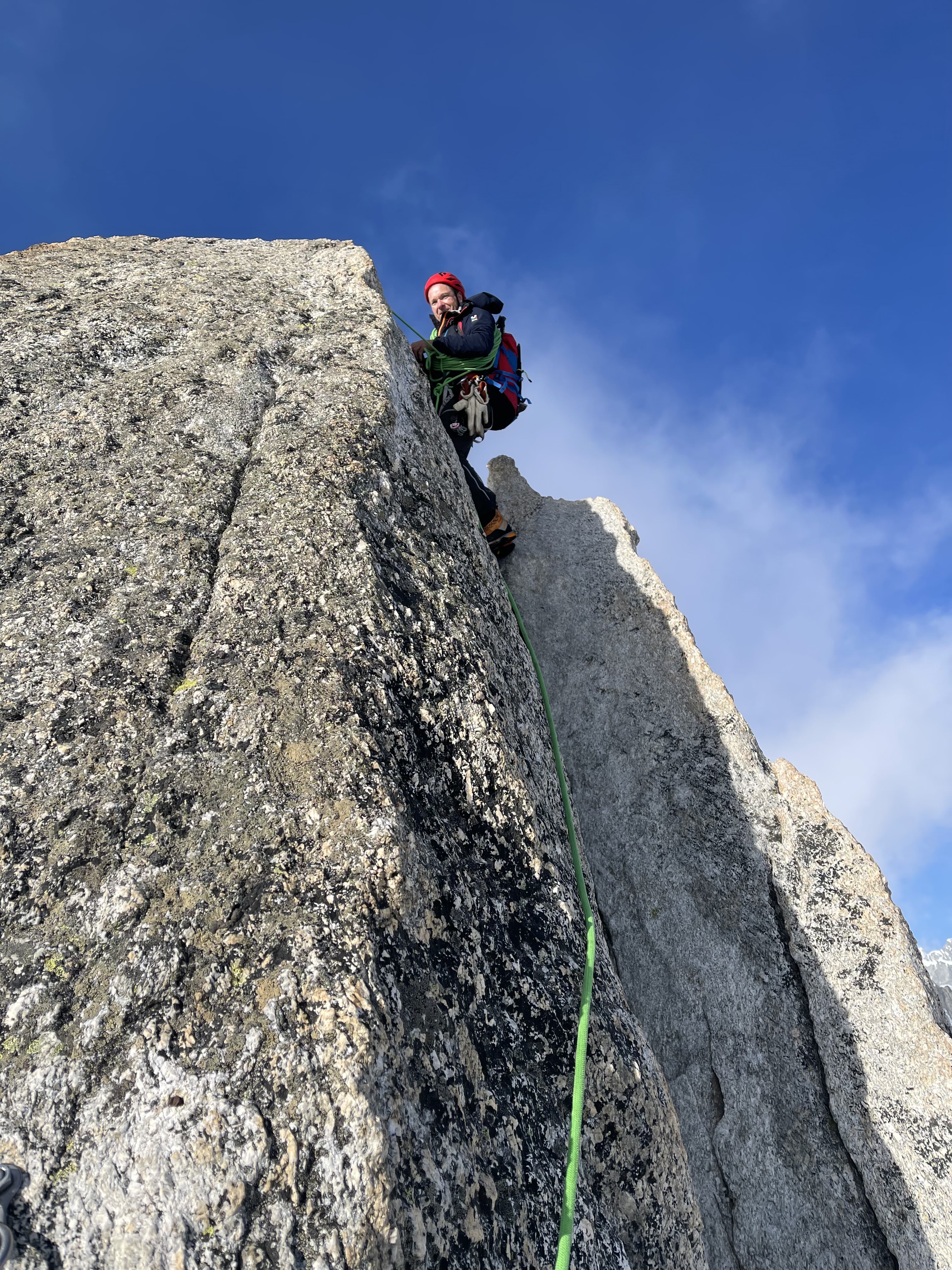 Le début est facile et je rigole, mais évidemment ça ne va pas durer 😉 On nous vend ça comme une course d’initiation, mais je trouve qu’il y a quand même 2-3 pas qui ne sont pas mega évidents: D’abord une sale petite désescalade suivie d’une remontée dans une large cheminée, assez improtégable pour le premier, et après la belle arête aérienne, il y a encore un sale pas avec une sangle coincée juste sous le sommet. Plus physique que vraiment difficile, mais j’ai quand même un peu couiné 😉