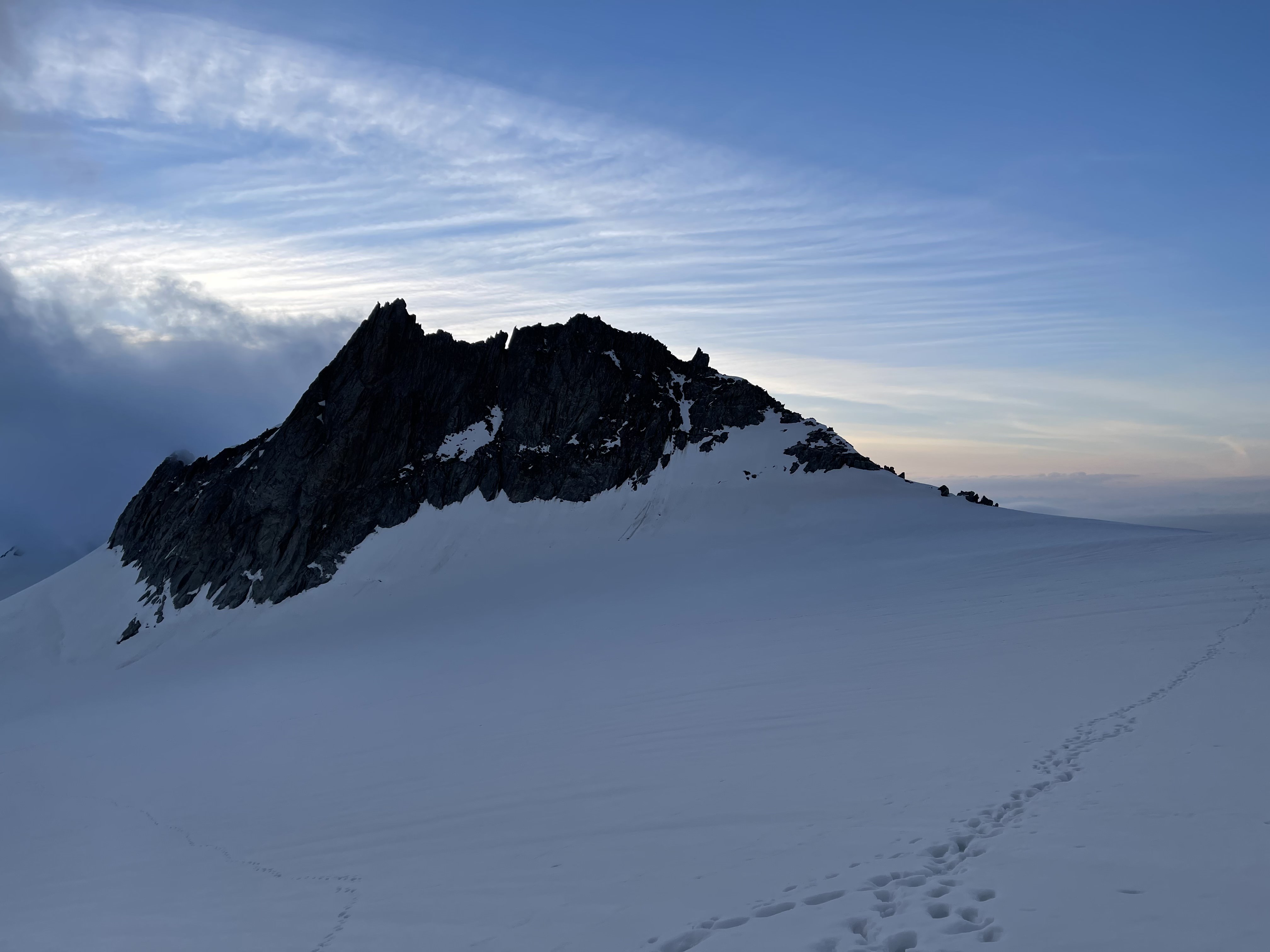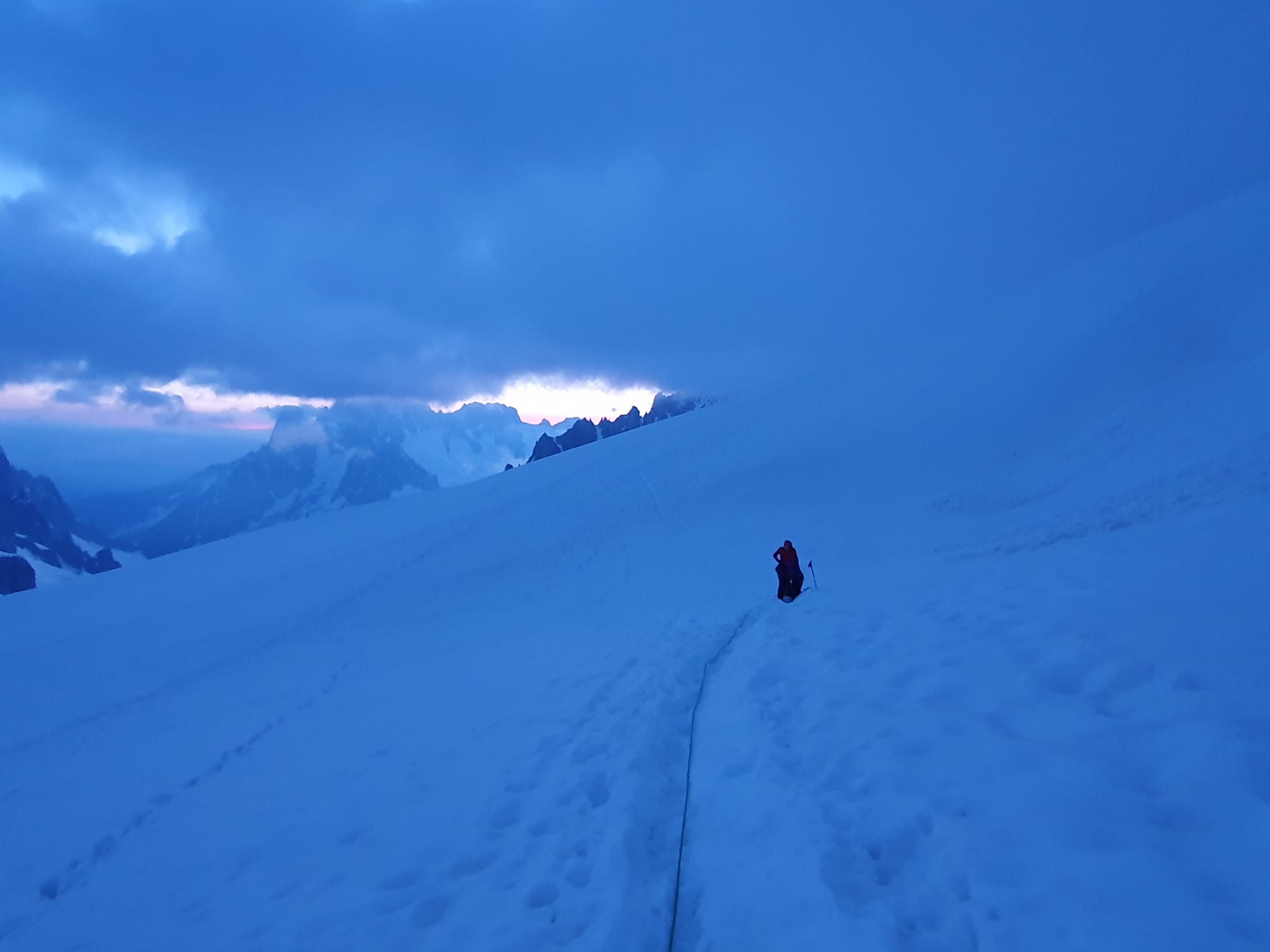 Après la journée inoubliable de la veille à la Dent du Géant et une bonne nuit réparatrice dans le confortable refuge de Torino, on rechausse les crampons au petit matin en direction du col des Flambeaux. Le brouillard est dense et c’est à peine si je distingue la lueur de la frontale de Bruno qui marche quelques mètres devant.