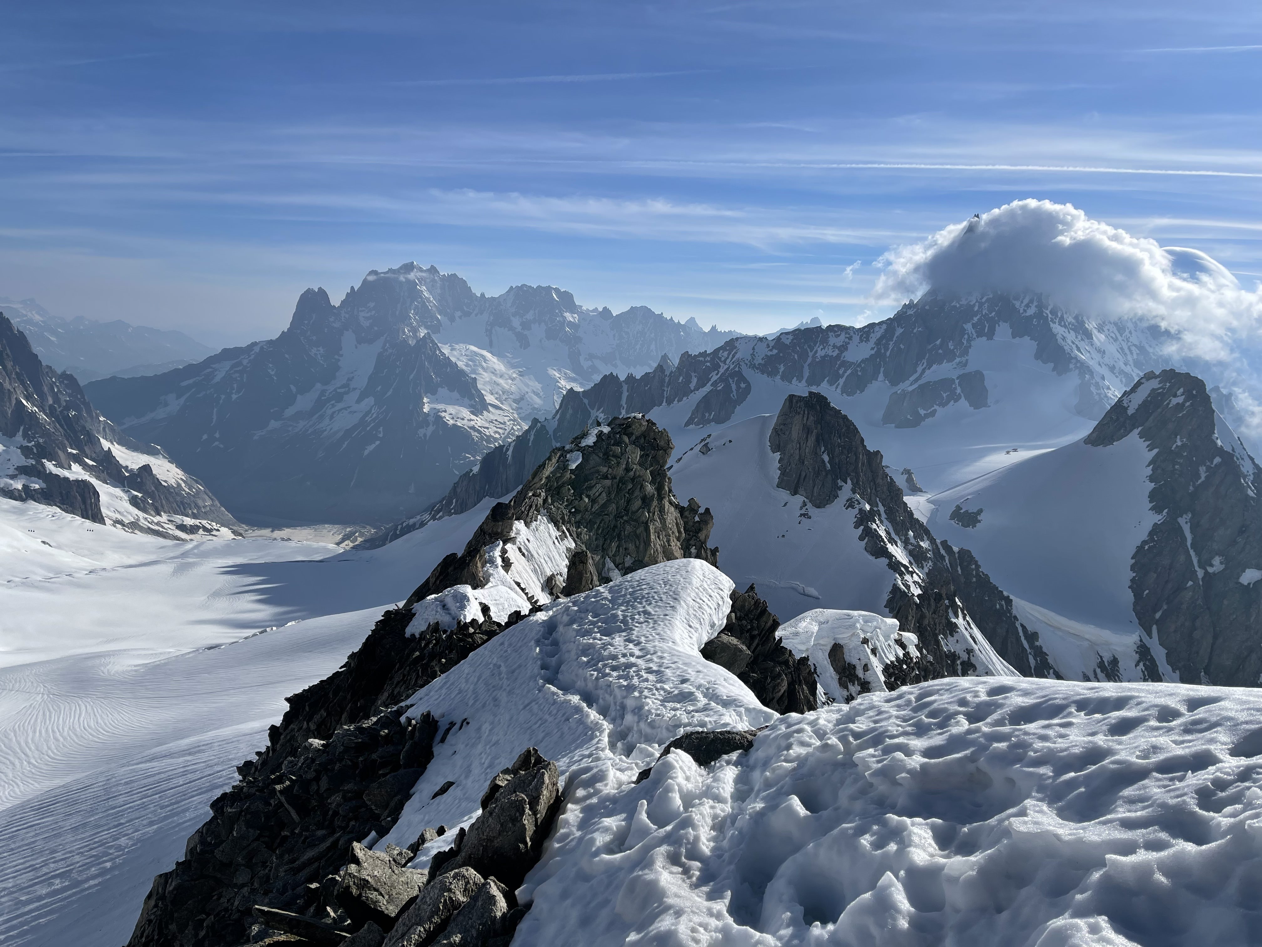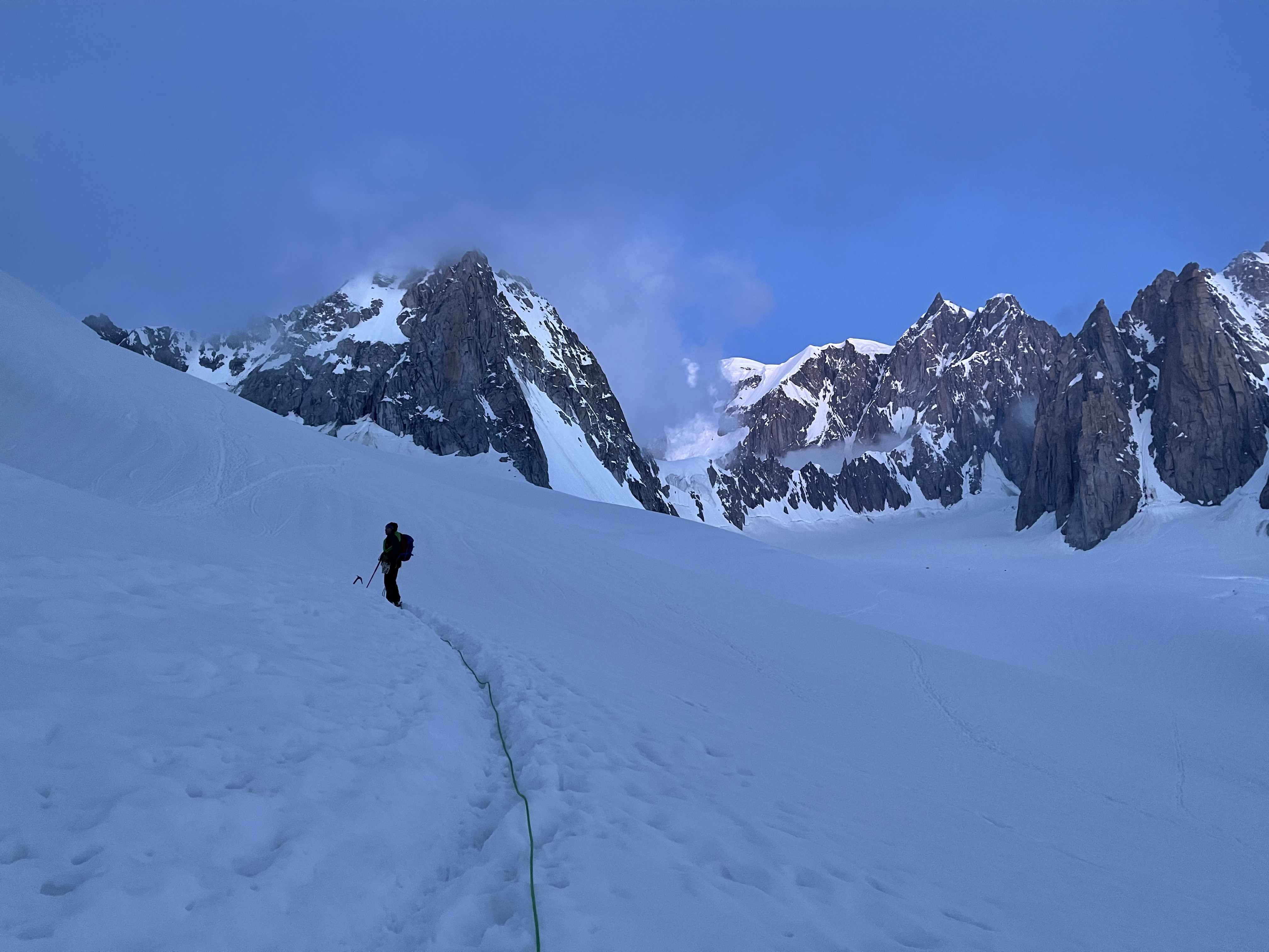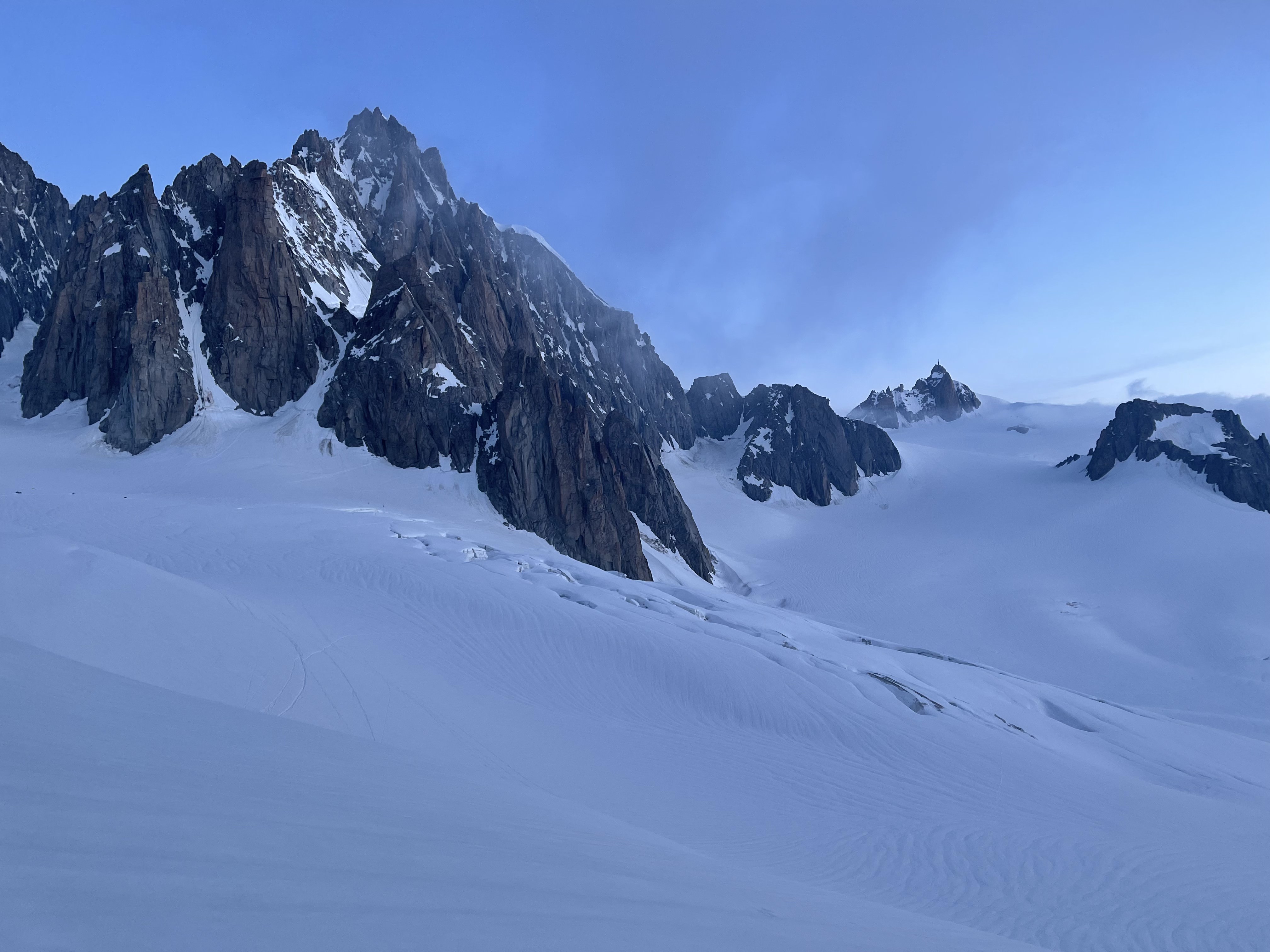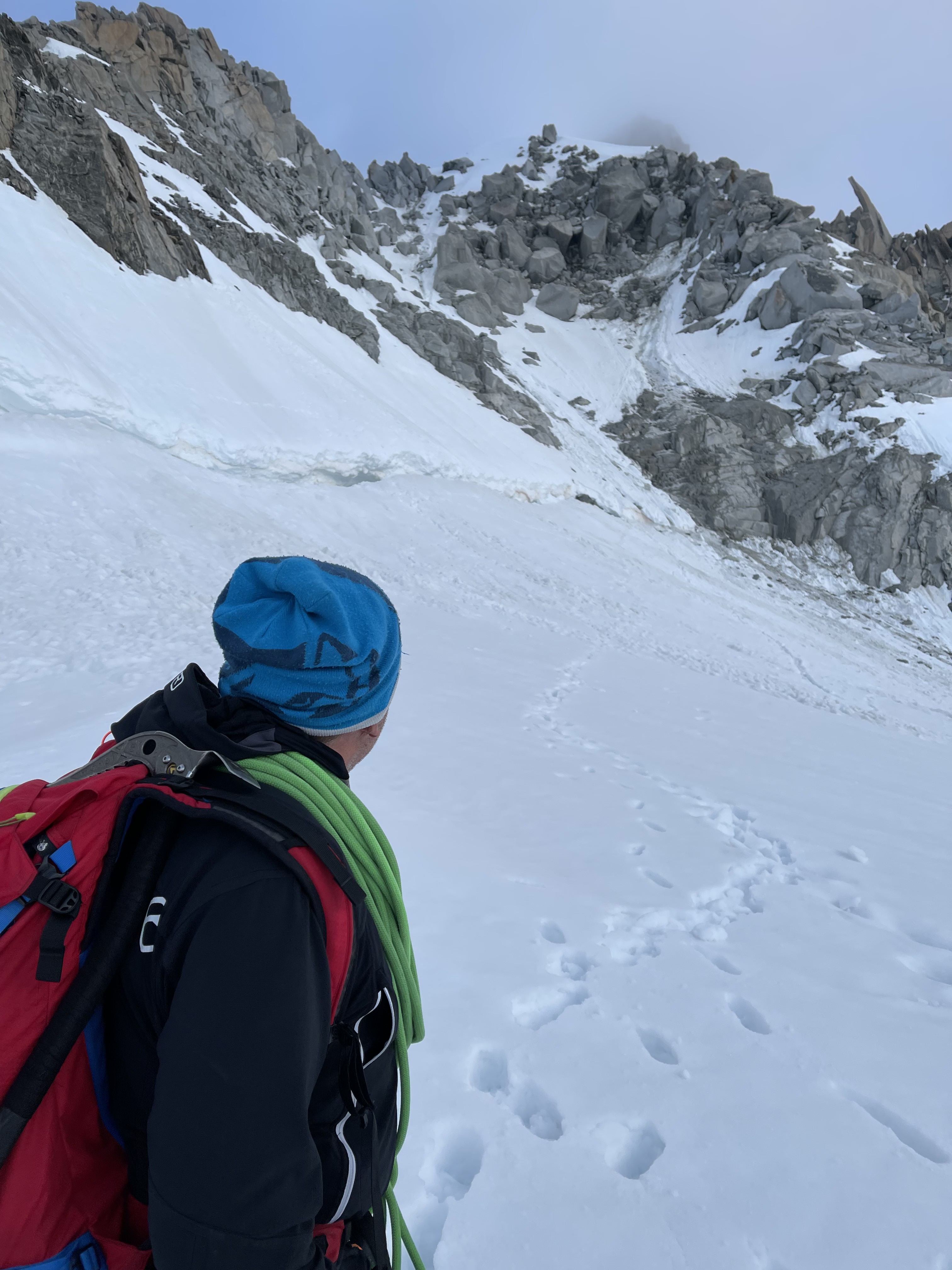 Notre plan A était l’arête E de la Tour Ronde, mais déjà de loin ça n’avait pas l’air en super conditions, notamment à cause du mauvais regel (ou plutôt de l’absence de regel tout court). En arrivant au pied de l’arête, un guide italien et son client sont en train de faire demi-tour. On passe donc au plan B: l’Aiguille d’Entrèves.