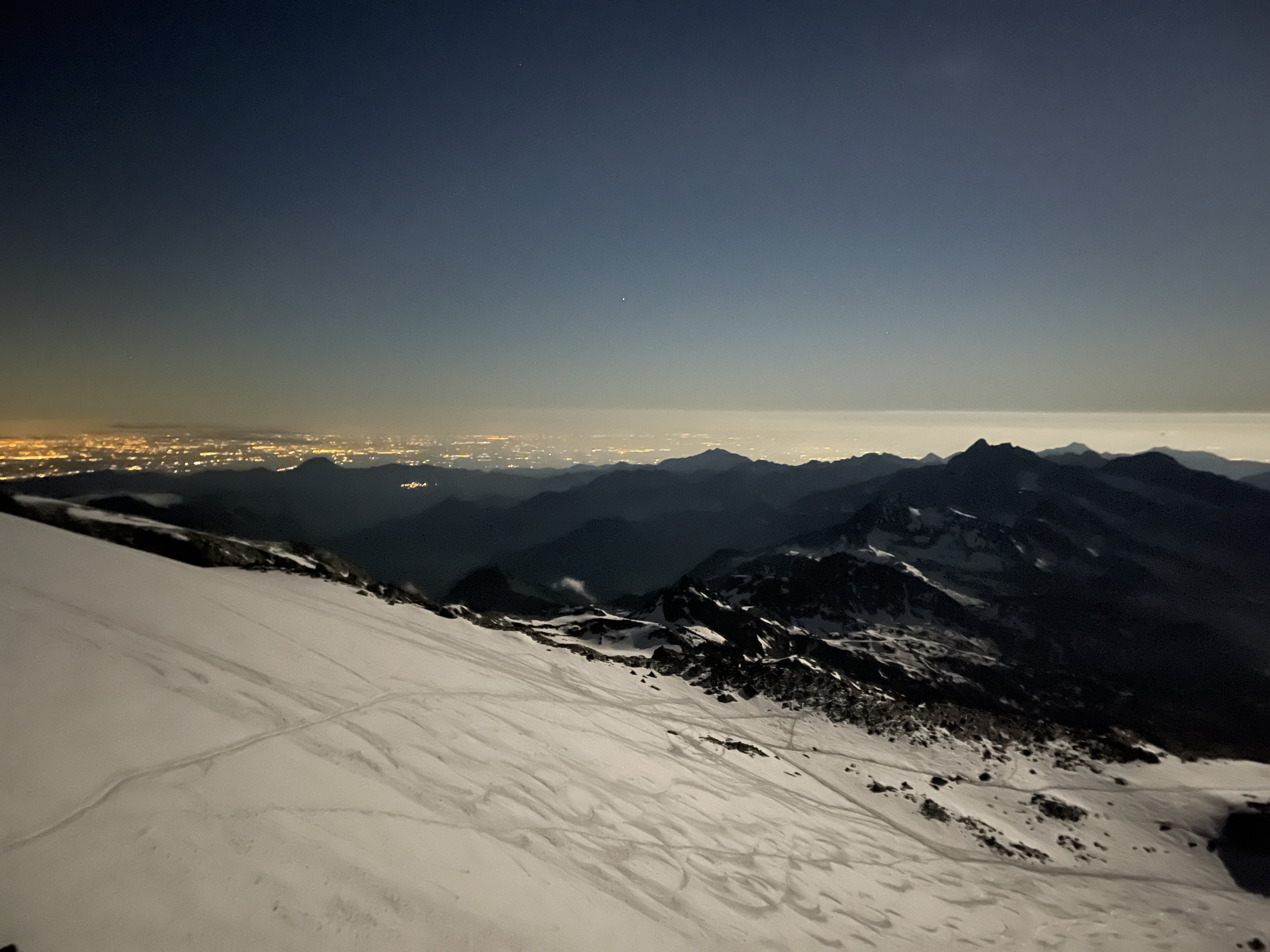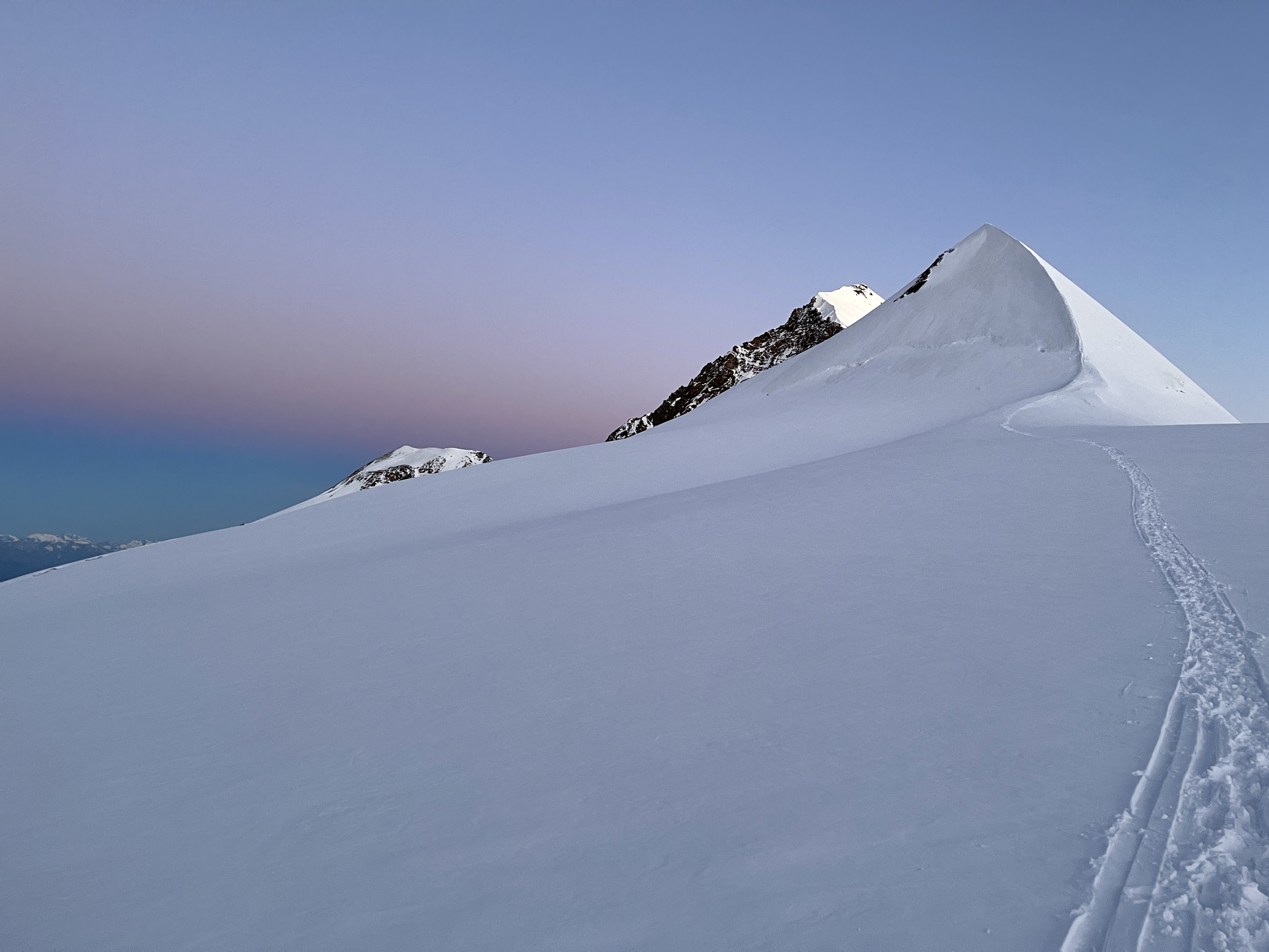 Finalement le réveil à 2h50 sonne comme une libération. On avale difficilement un mini p’tit déj et surtout deux tasses de café. Malgré le manque de sommeil je me sens en forme et Mathilde aussi. On sort du refuge, l’instant est irréel avec la pleine lune et les lumières de la vallée tout en bas. On rejoint le glacier par les quelques échelons et on commence notre journée. Remonter le glacier pour rejoindre le col du Lys nous permet de finir notre nuit, la trace est excellente, les ponts de neige sont béton grâce à un excellent regel, et comme c’est la troisième fois que je me tape cette montée, je n’ai pas besoin de trop réfléchir. On arrive au col pour le levé du jour. Les couleurs du ciel et l’ambiance incroyable de l’instant nous font presque oublier qu’on se les gèle méchamment. On enfile toutes nos couches, ça caille grave.