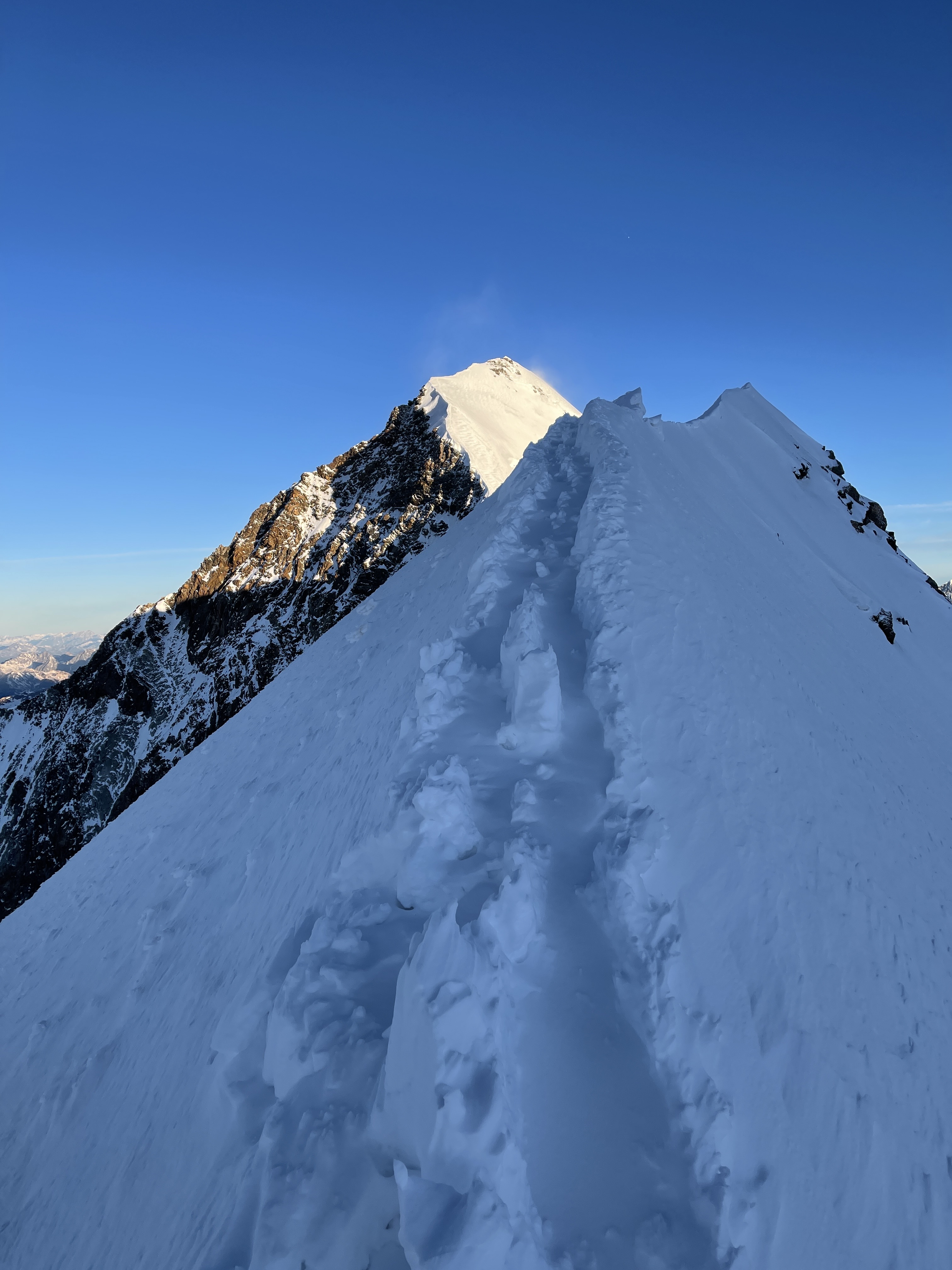 On raccourcit l’encordement et on y va ! J’arrive à peine à croire que je suis enfin sur cette arête. Même pas peur. Les conditions sont excellentes, ça cramponne super bien. Mathilde suit d’un pas assuré, confiance totale. On fait une pause un peu avant le sommet Est. J’essaie d’avaler quelque chose mais ça ne passe pas, je me contente de boire quelques gorgées du thé de marche hyper sucré du refuge. On repart, j’ai un sacré coup de mou avant le sommet, mais on peut presque le toucher. Encore un p’tit pas sur un bloc et on y est ! Wowowowow, tellement beau !