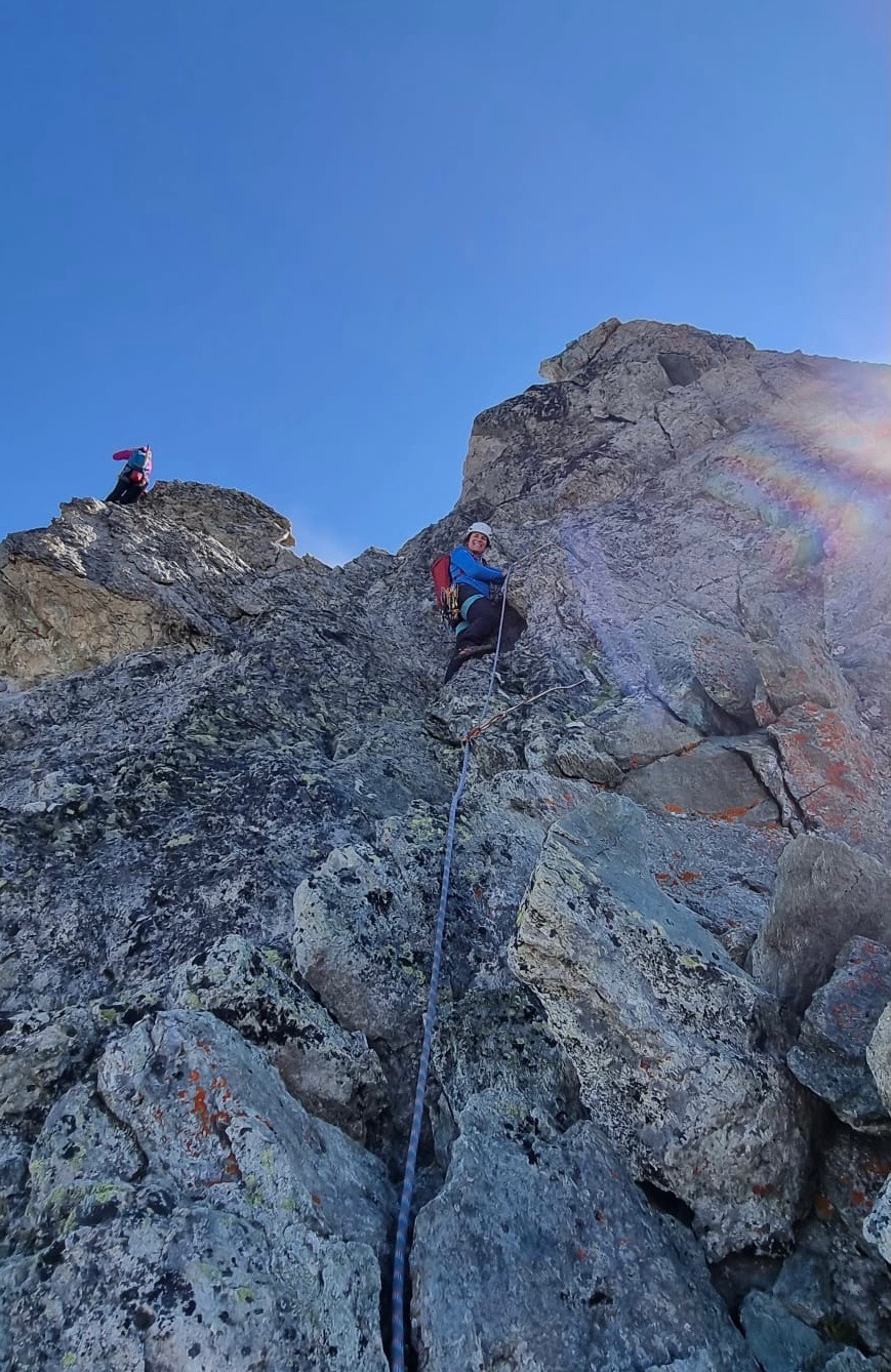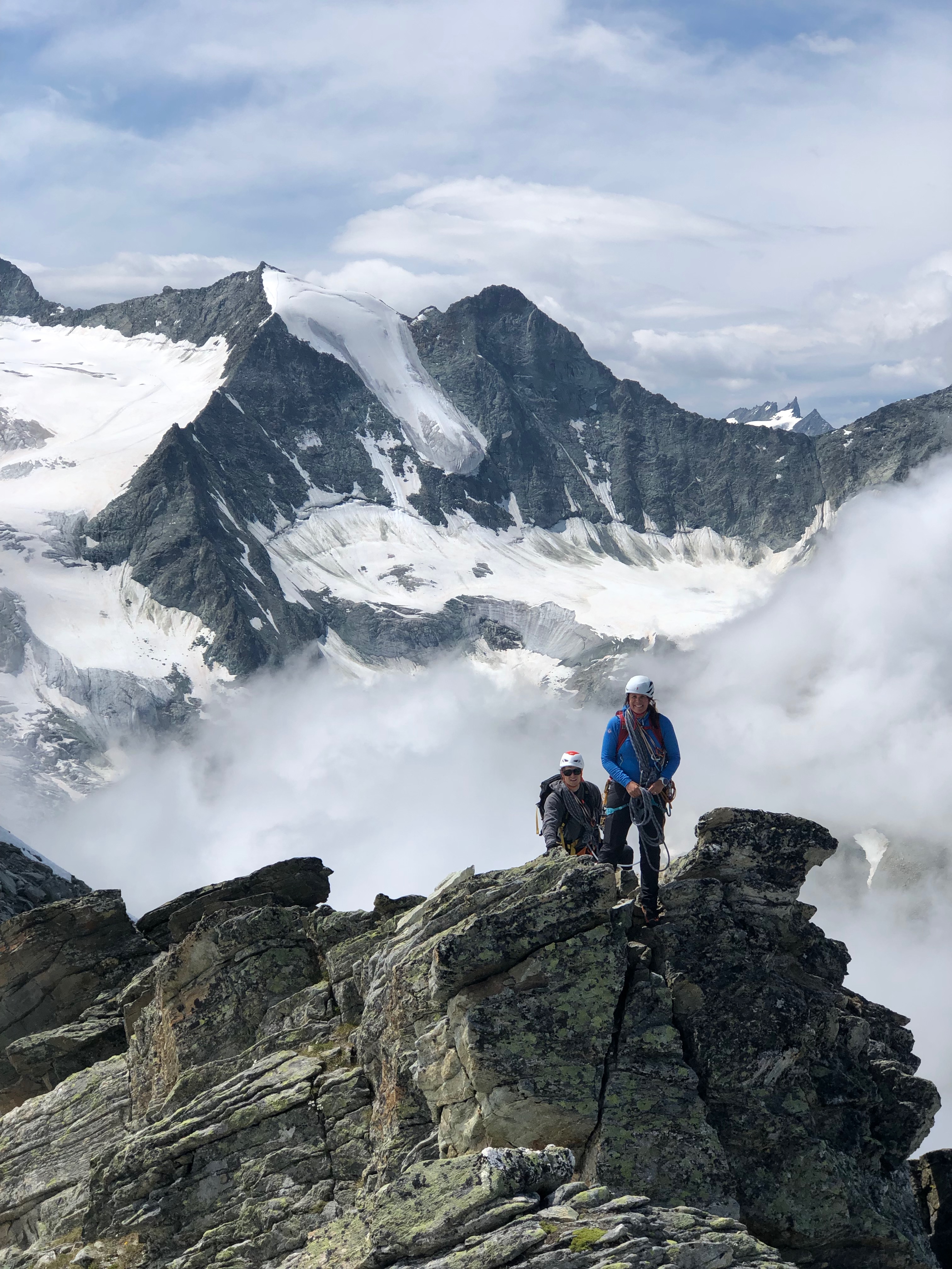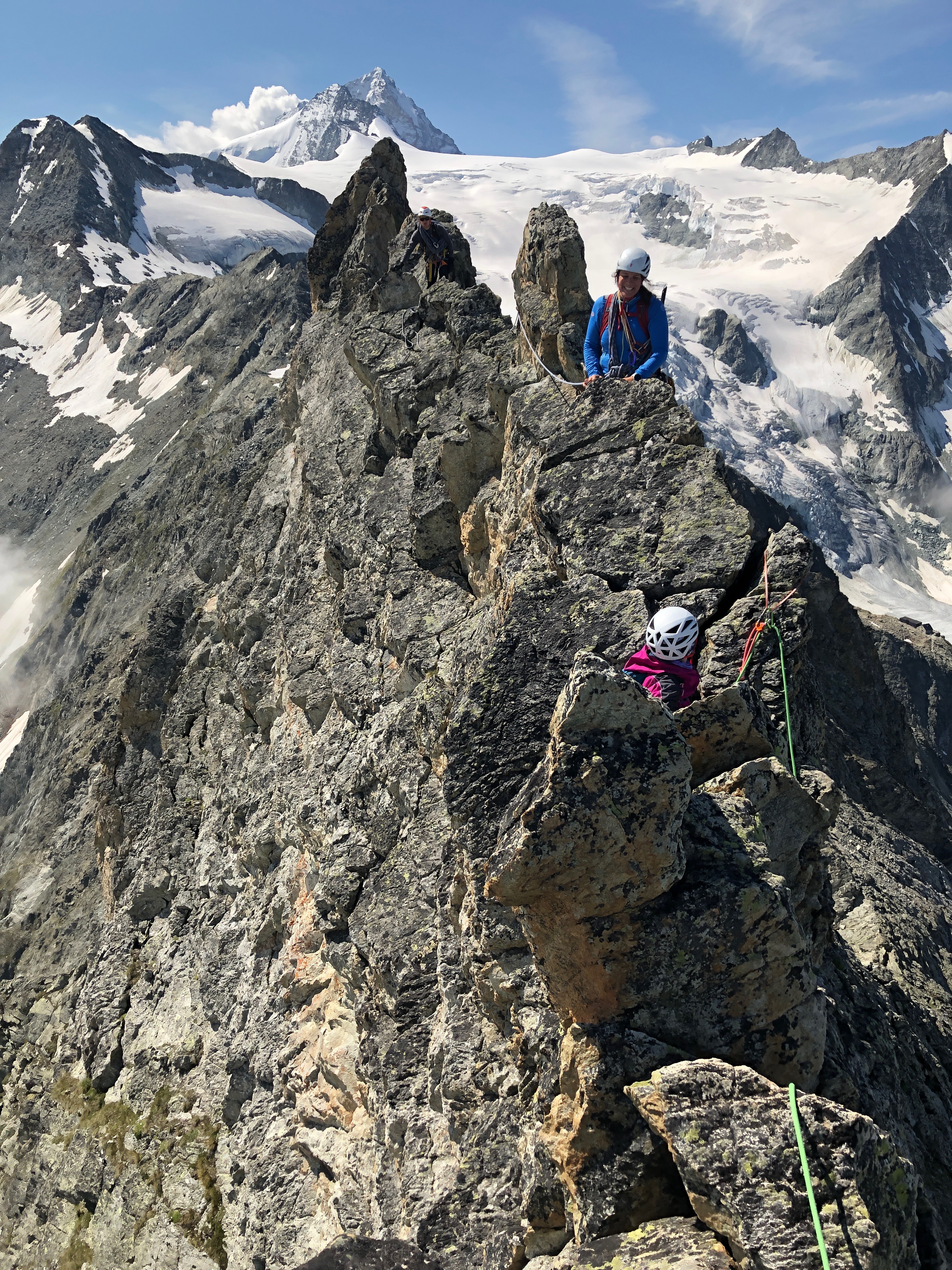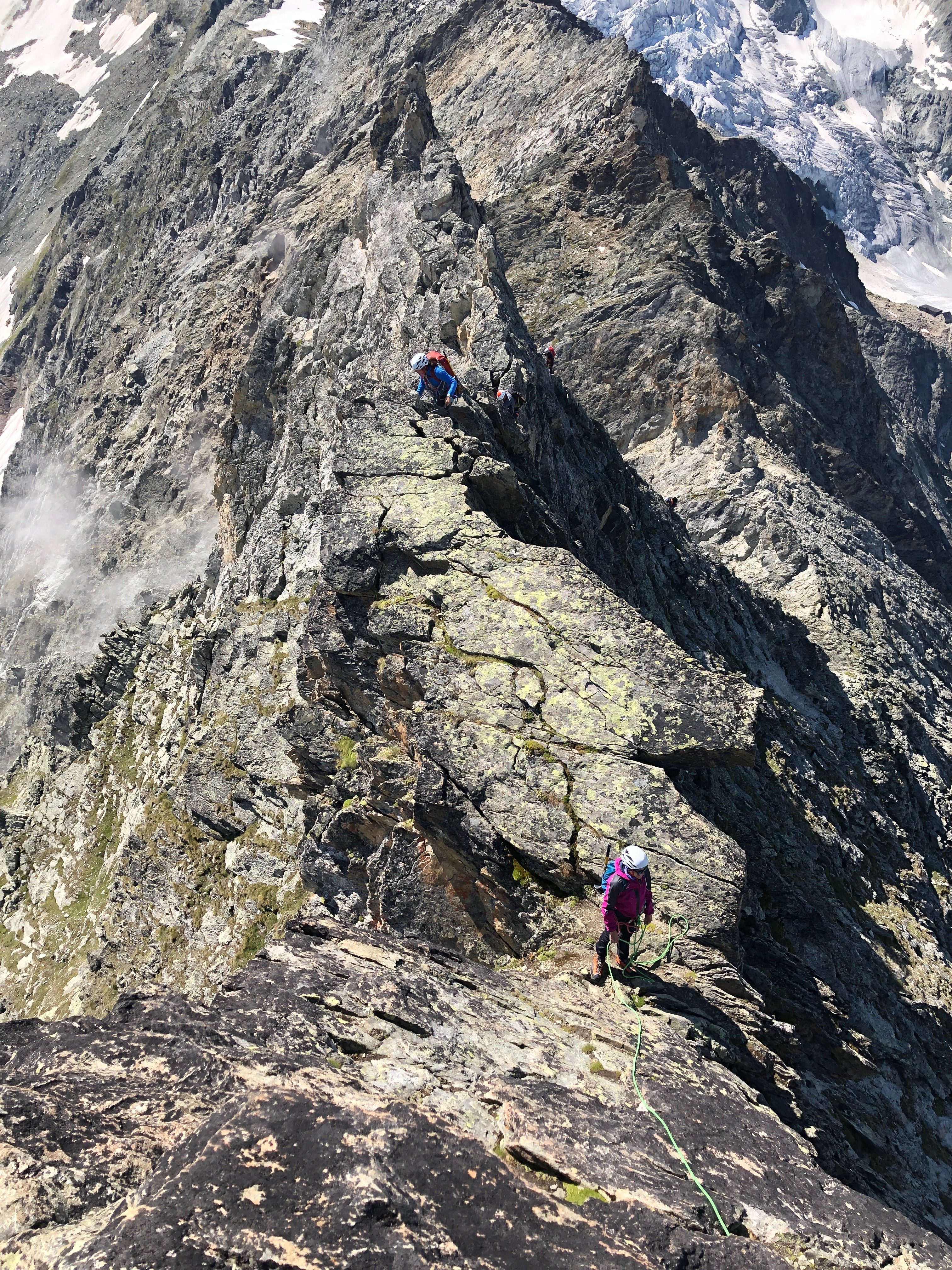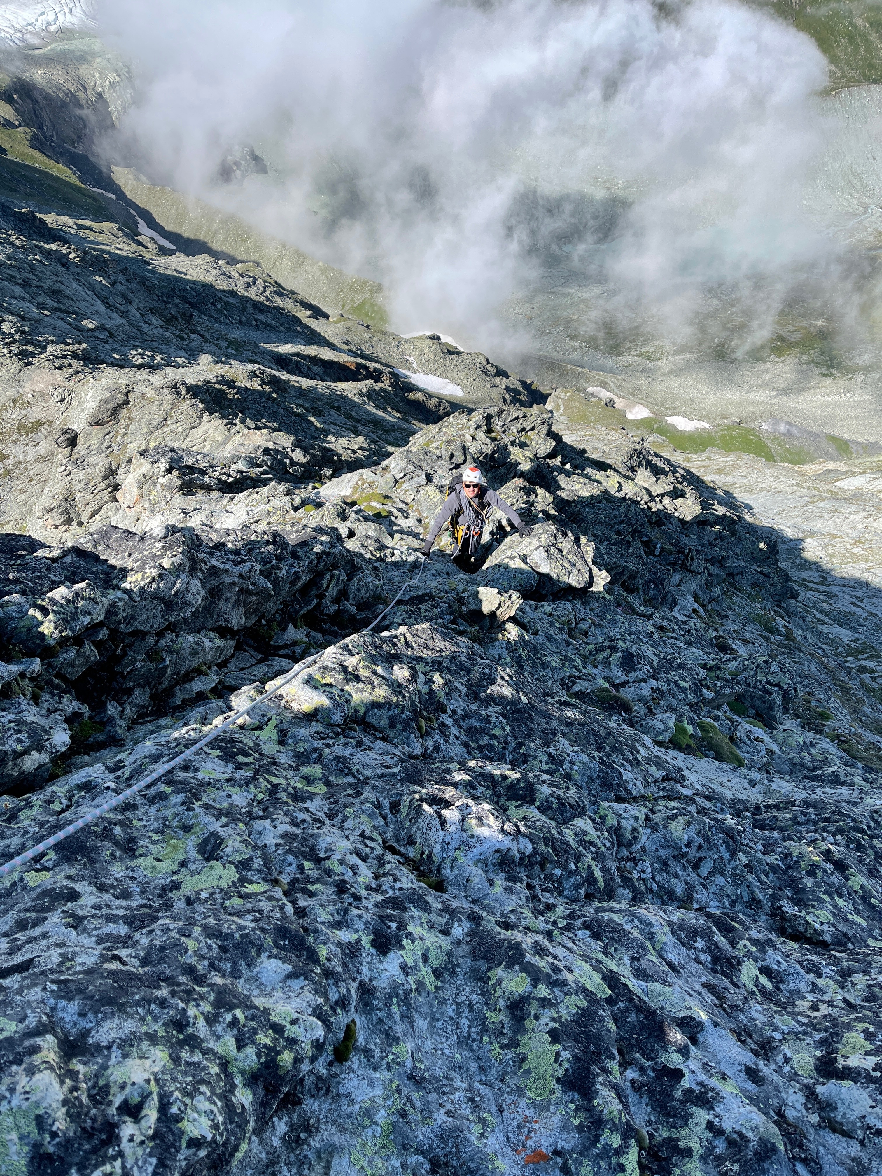 Le début est tout facile et on se met gentiment dans le bain. Pål et Claudia ont le feu aux fesses et avancent super vite, alors que Dylan et moi on prend notre temps. Heureusement ils font régulièrement des pauses pour profiter du paysage et nous attendre. On fait une petite pause au Col des Aiguilles avant d’attaquer la deuxième partie. L’escalade depuis le col est vraiment très chouette, puis on arrive sur une belle arête horizontale et effilée. Les bancs de brouillard vont et viennent et donnent une atmosphère bien particulière, on passe vraiment une belle journée.