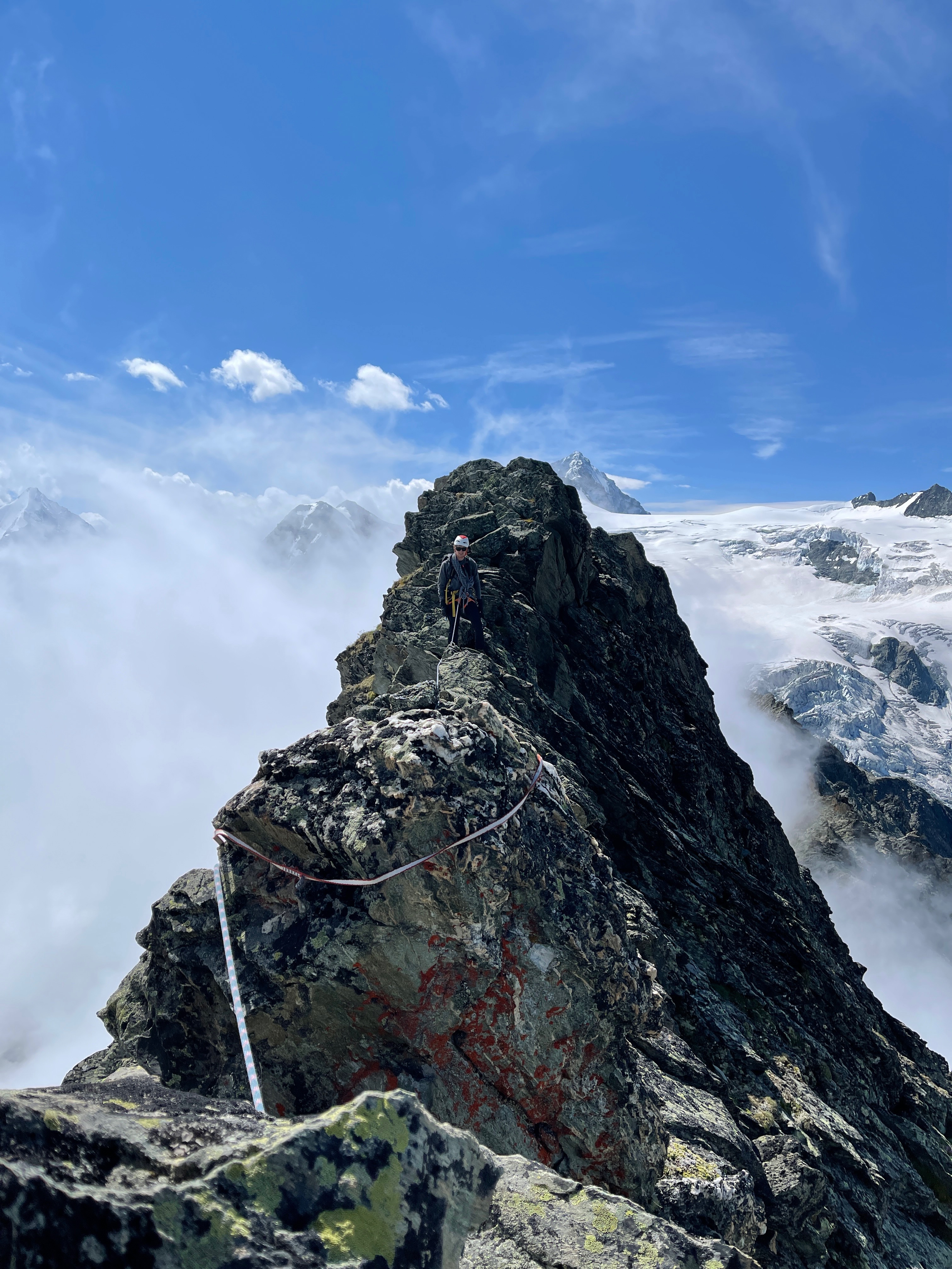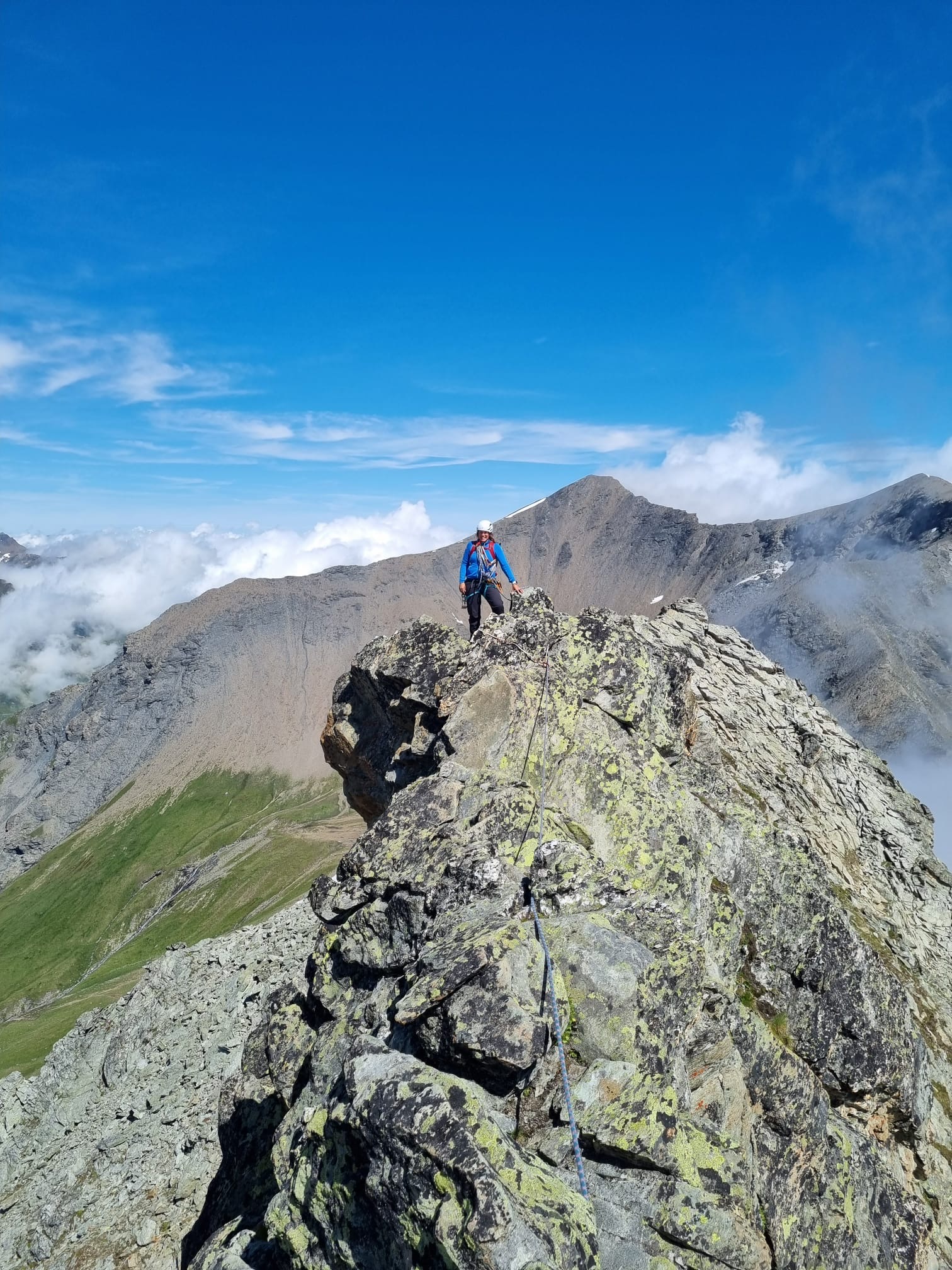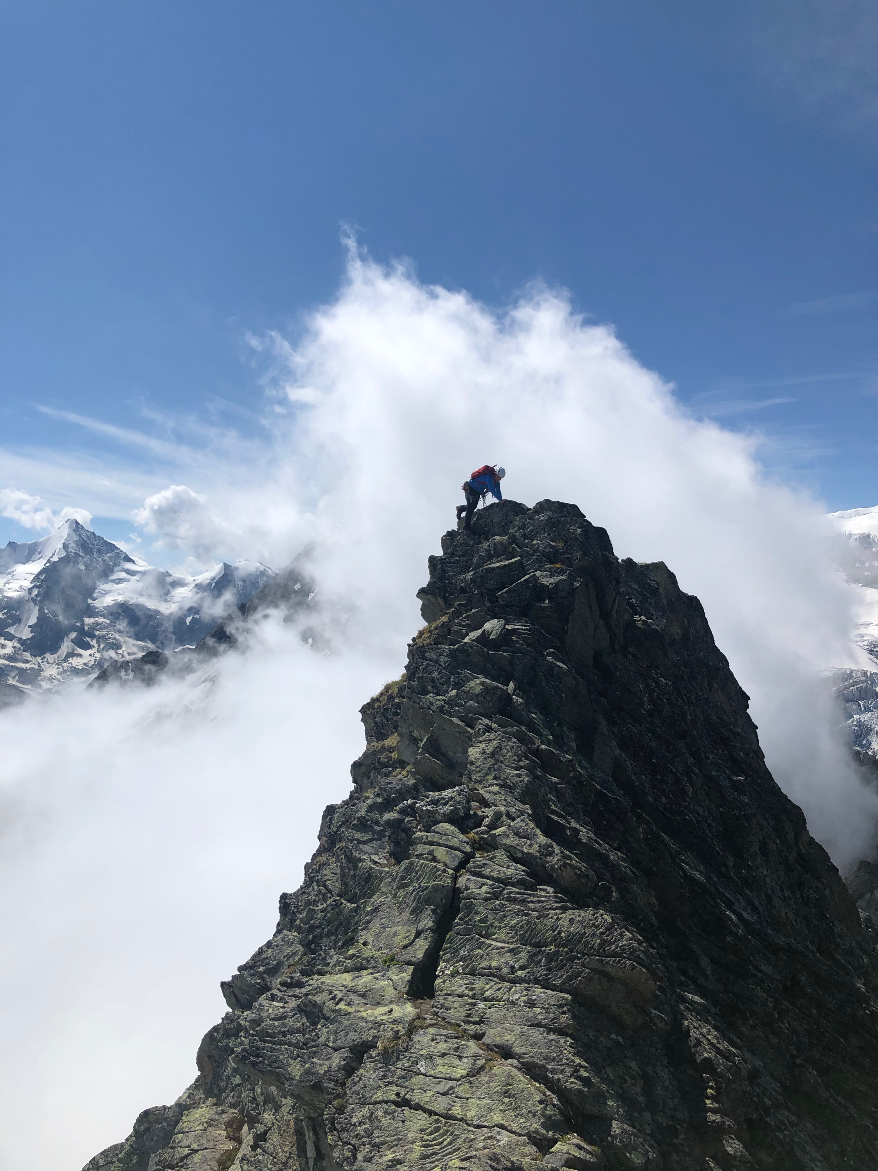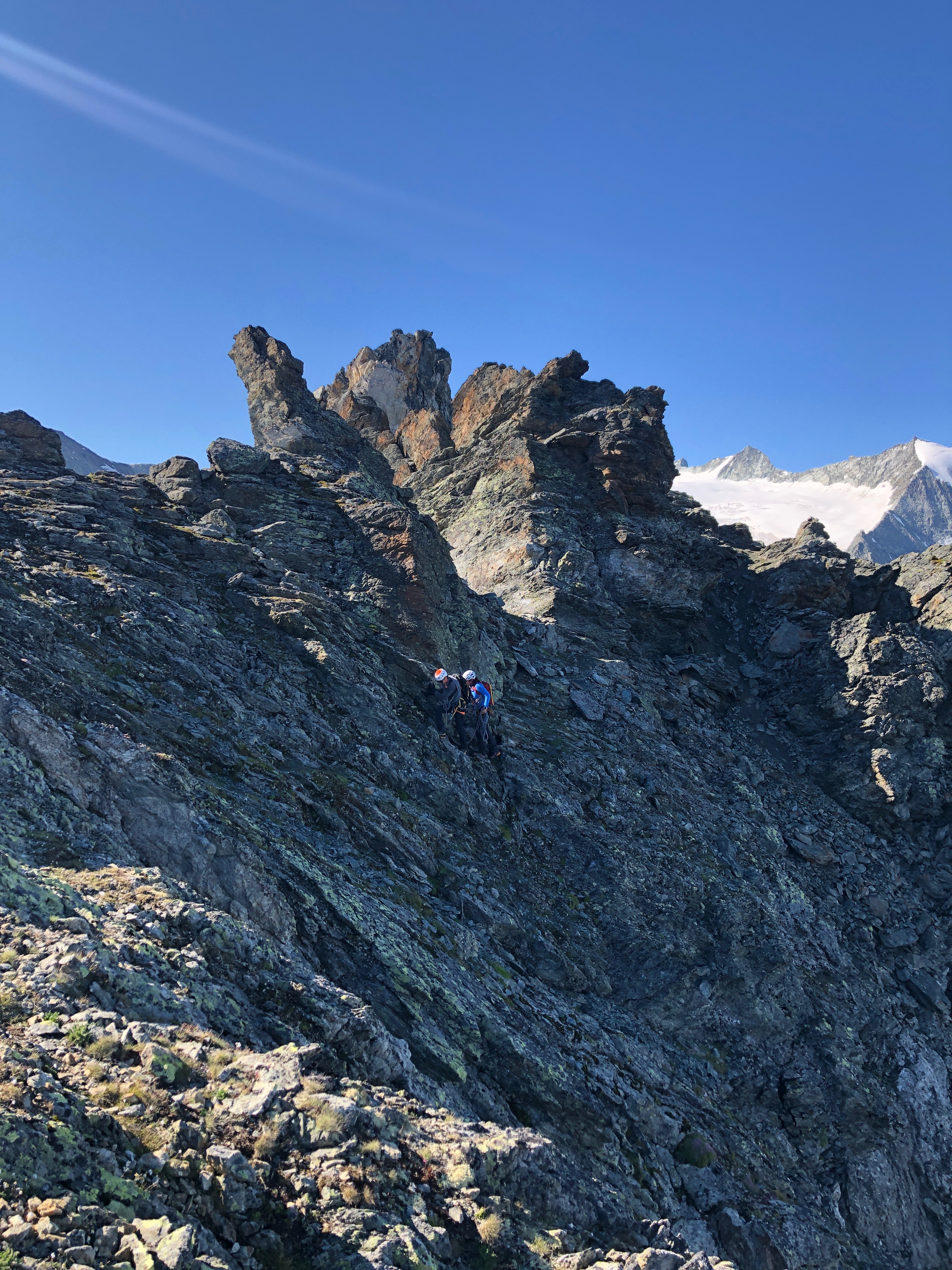 Le début est tout facile et on se met gentiment dans le bain. Pål et Claudia ont le feu aux fesses et avancent super vite, alors que Dylan et moi on prend notre temps. Heureusement ils font régulièrement des pauses pour profiter du paysage et nous attendre. On fait une petite pause au Col des Aiguilles avant d’attaquer la deuxième partie. L’escalade depuis le col est vraiment très chouette, puis on arrive sur une belle arête horizontale et effilée. Les bancs de brouillard vont et viennent et donnent une atmosphère bien particulière, on passe vraiment une belle journée.