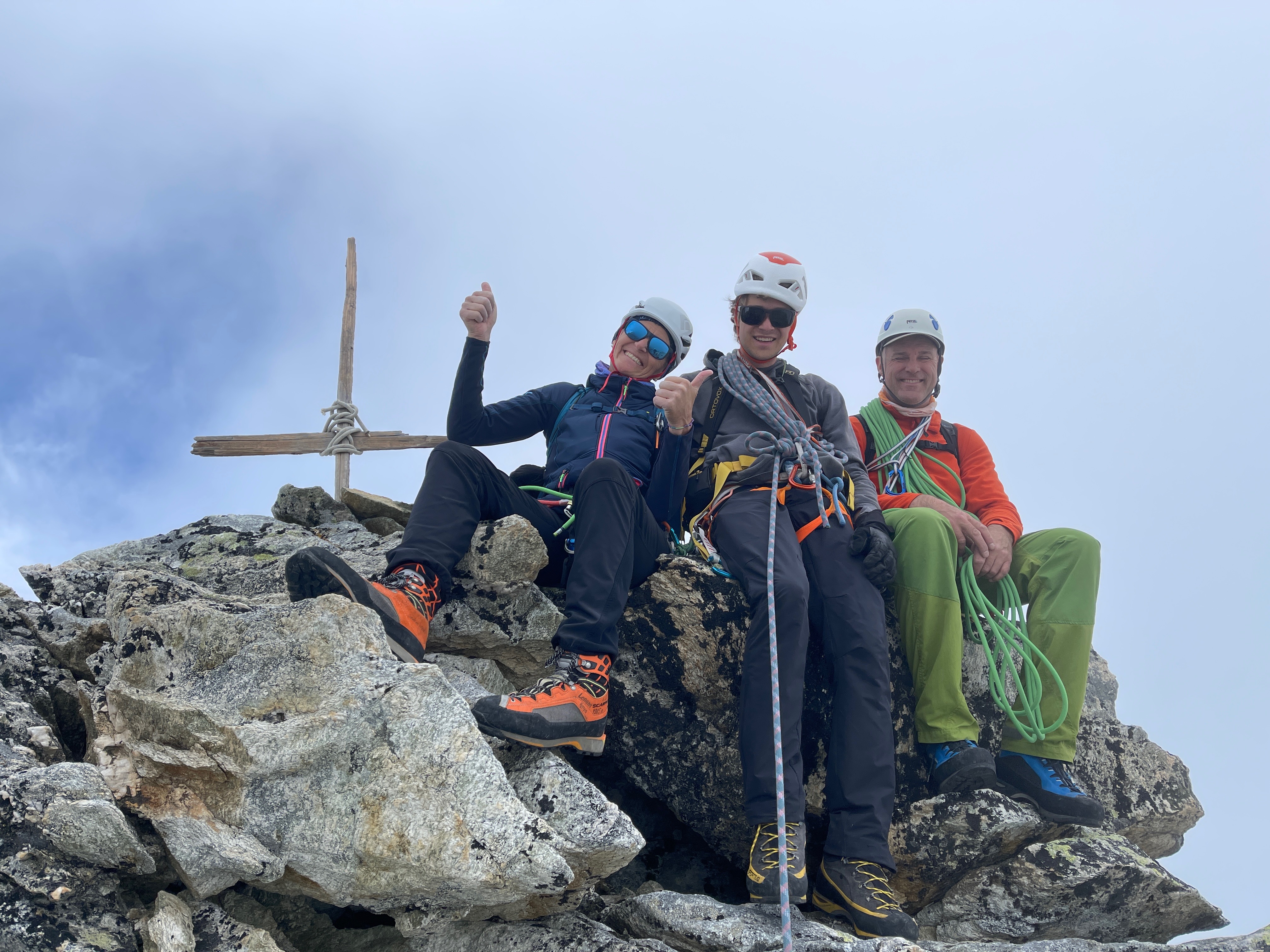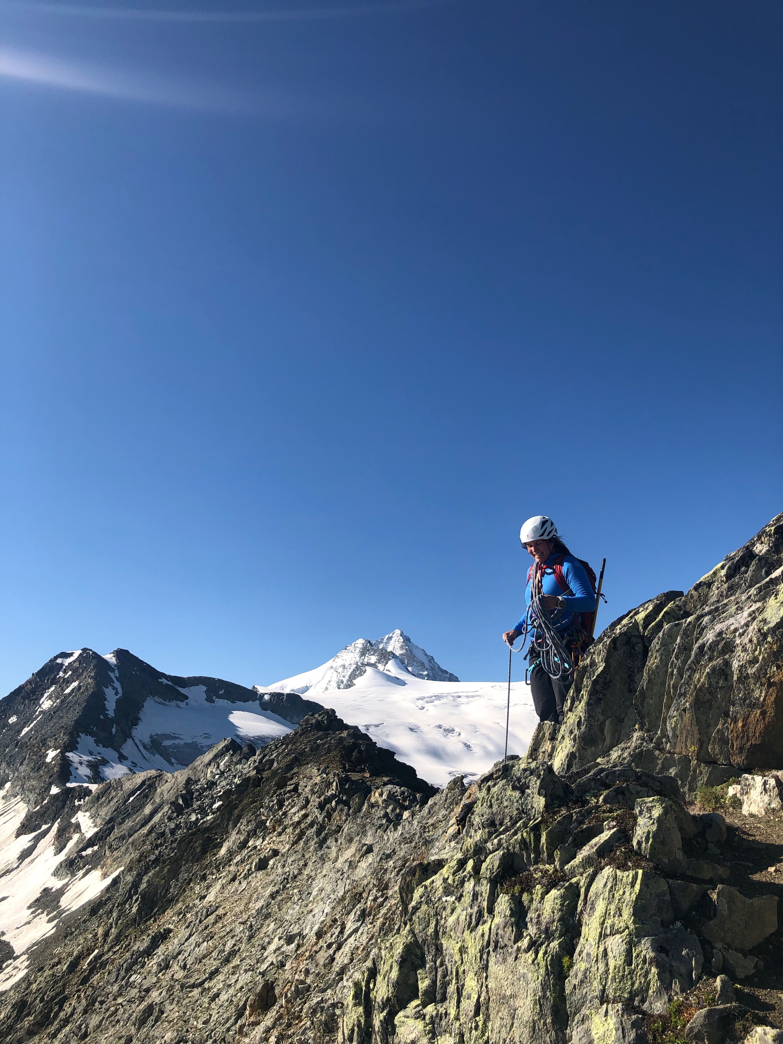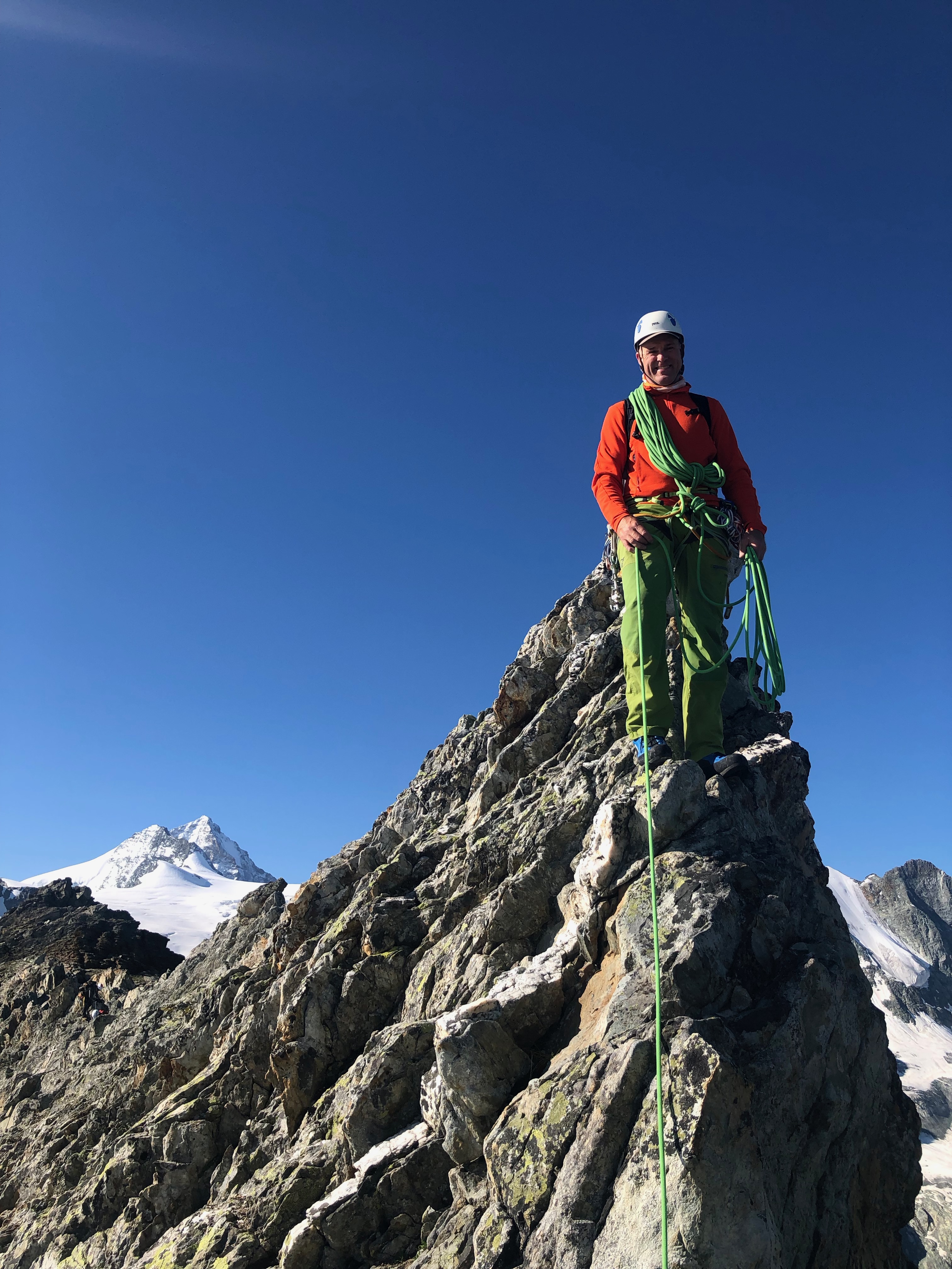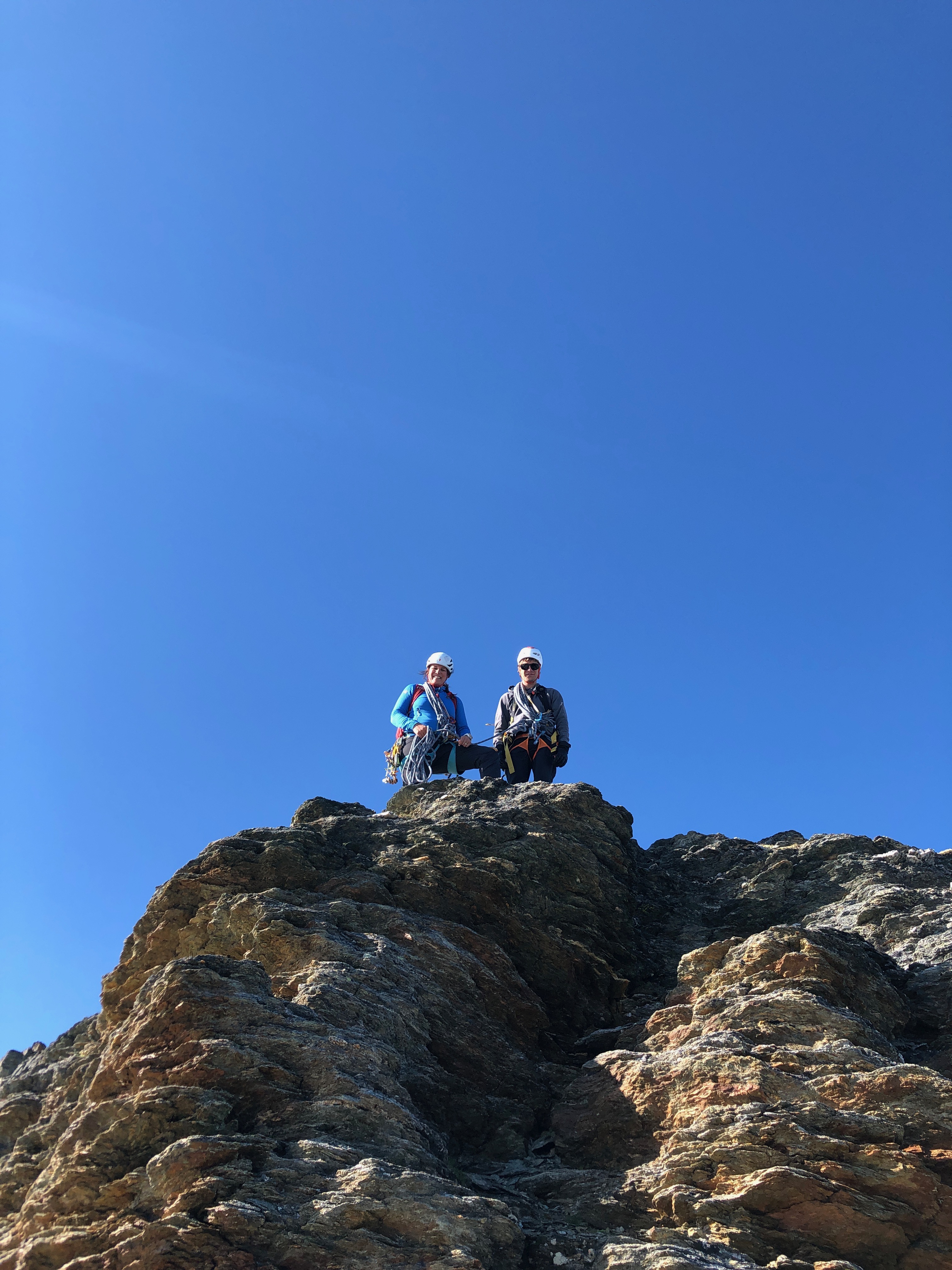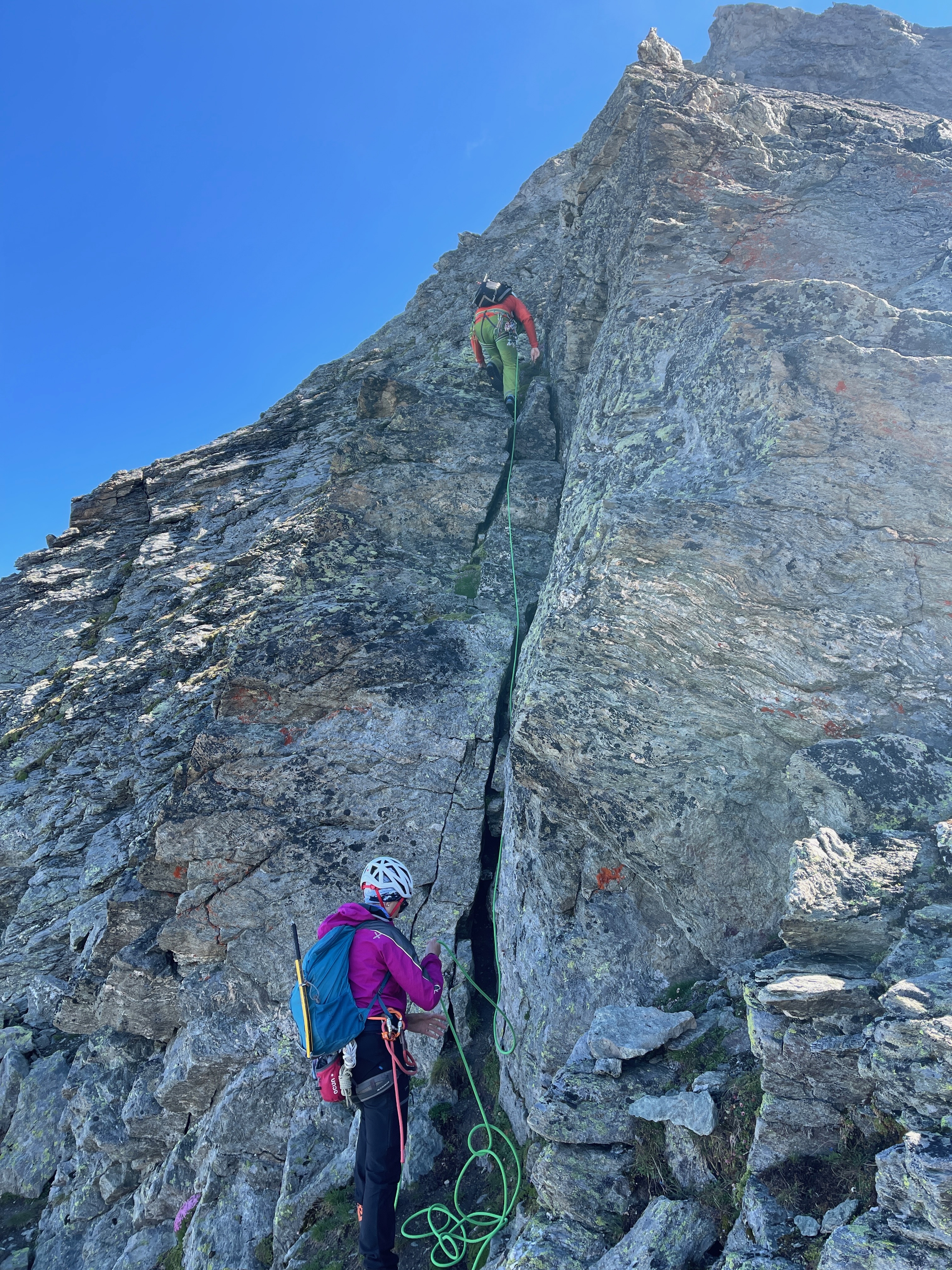 Le début est tout facile et on se met gentiment dans le bain. Pål et Claudia ont le feu aux fesses et avancent super vite, alors que Dylan et moi on prend notre temps. Heureusement ils font régulièrement des pauses pour profiter du paysage et nous attendre. On fait une petite pause au Col des Aiguilles avant d’attaquer la deuxième partie. L’escalade depuis le col est vraiment très chouette, puis on arrive sur une belle arête horizontale et effilée. Les bancs de brouillard vont et viennent et donnent une atmosphère bien particulière, on passe vraiment une belle journée.