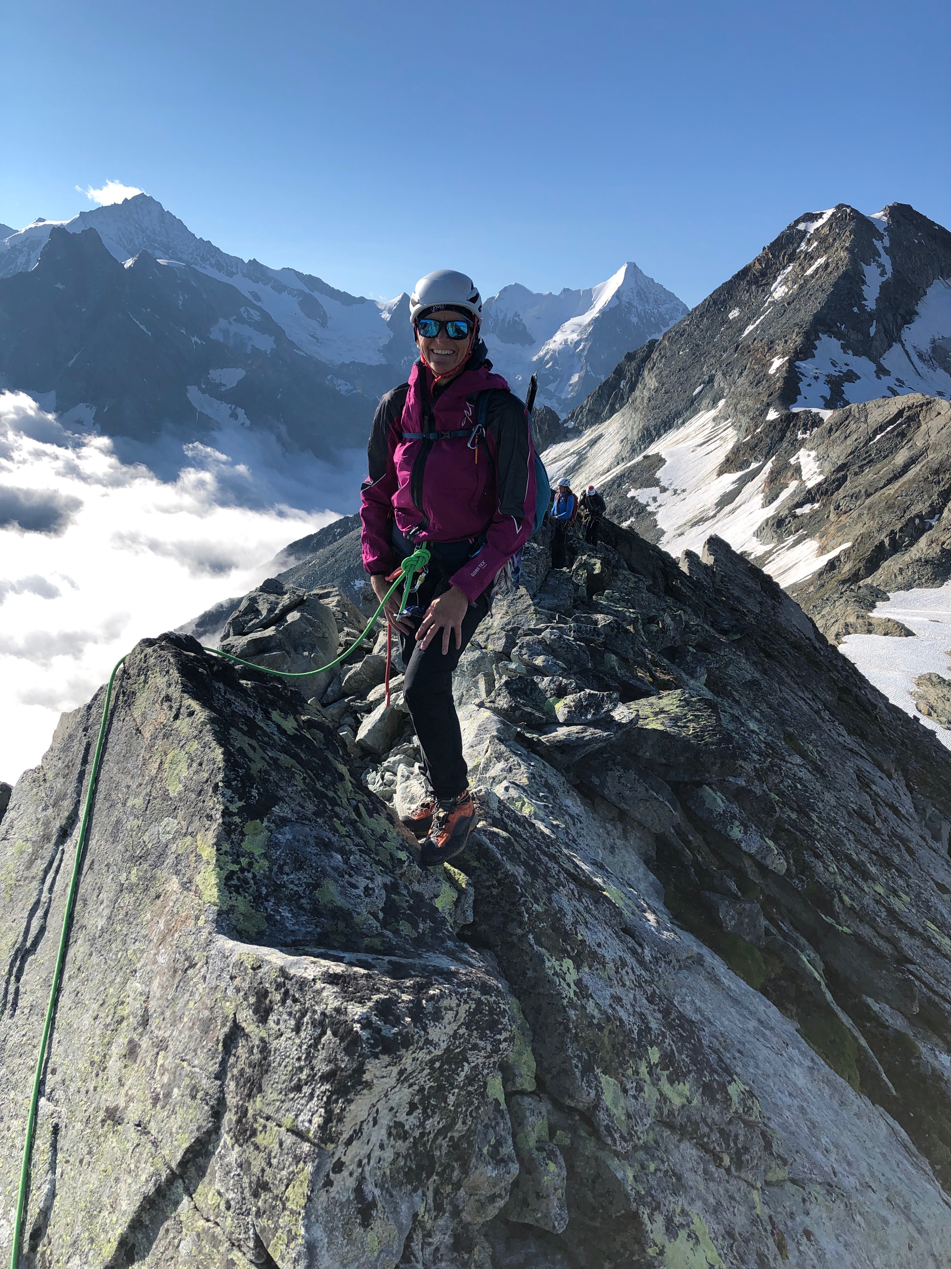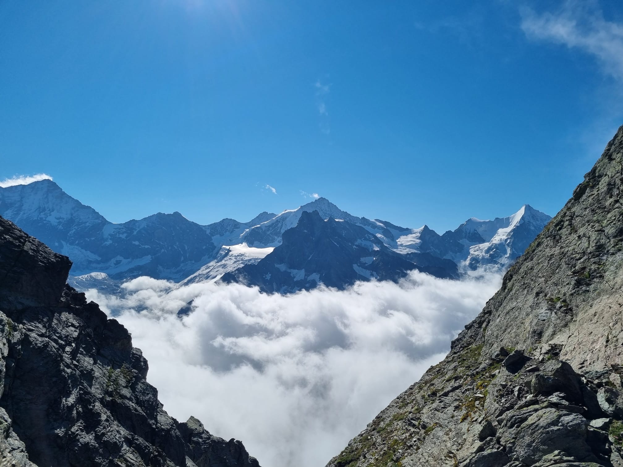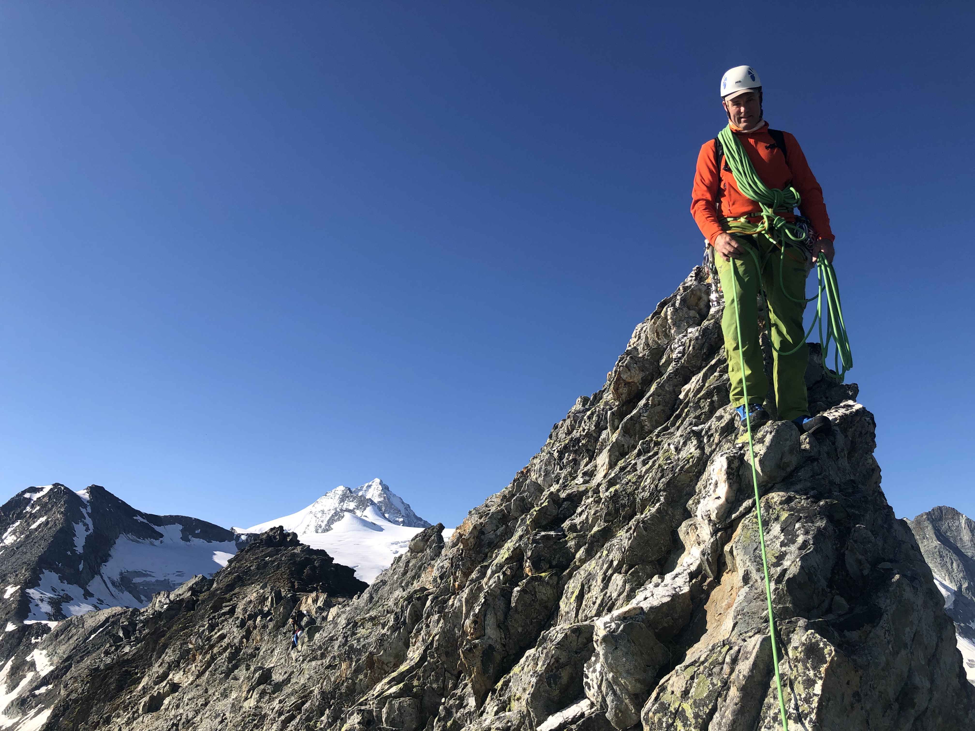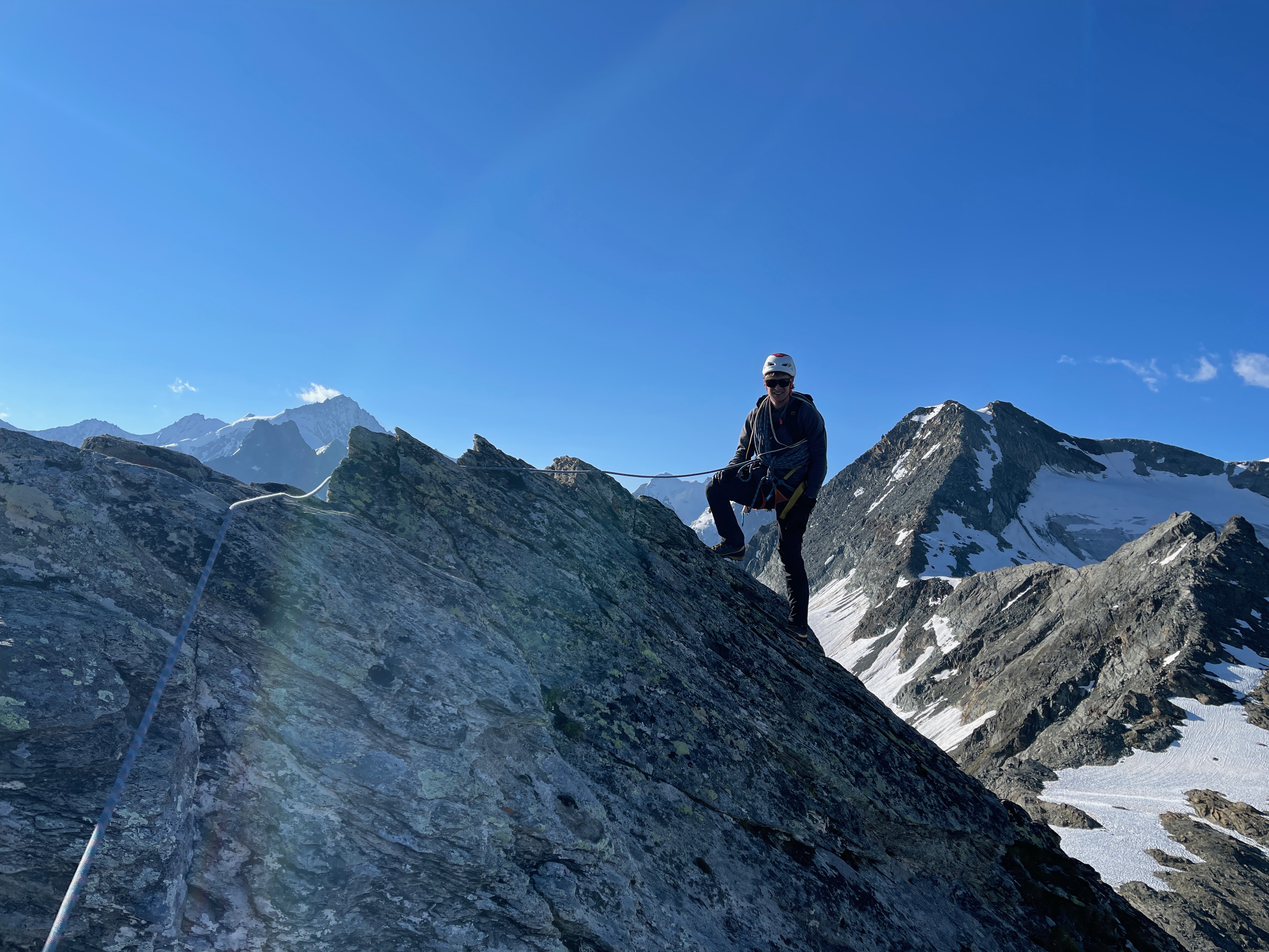 Le début est tout facile et on se met gentiment dans le bain. Pål et Claudia ont le feu aux fesses et avancent super vite, alors que Dylan et moi on prend notre temps. Heureusement ils font régulièrement des pauses pour profiter du paysage et nous attendre. On fait une petite pause au Col des Aiguilles avant d’attaquer la deuxième partie. L’escalade depuis le col est vraiment très chouette, puis on arrive sur une belle arête horizontale et effilée. Les bancs de brouillard vont et viennent et donnent une atmosphère bien particulière, on passe vraiment une belle journée.