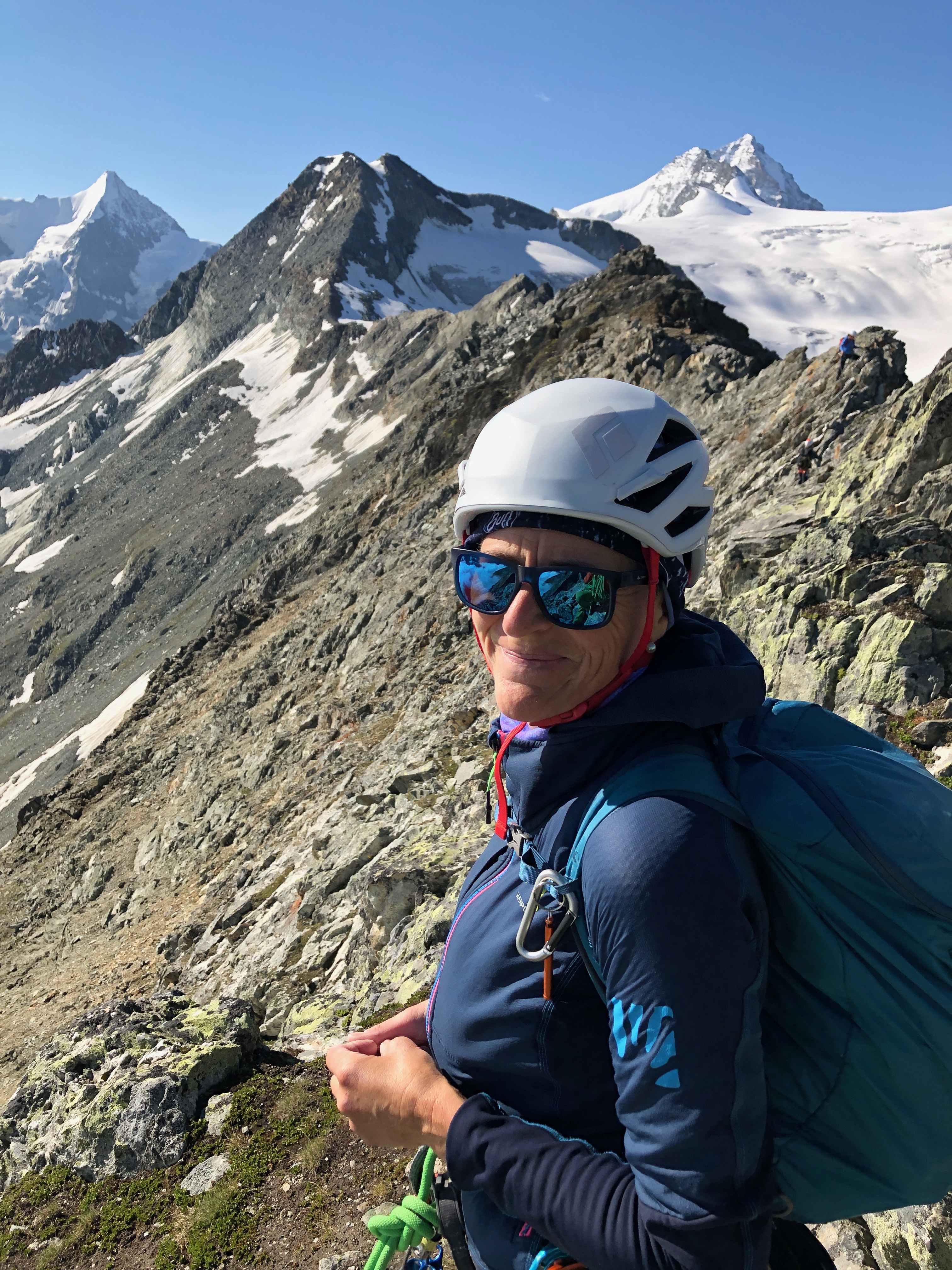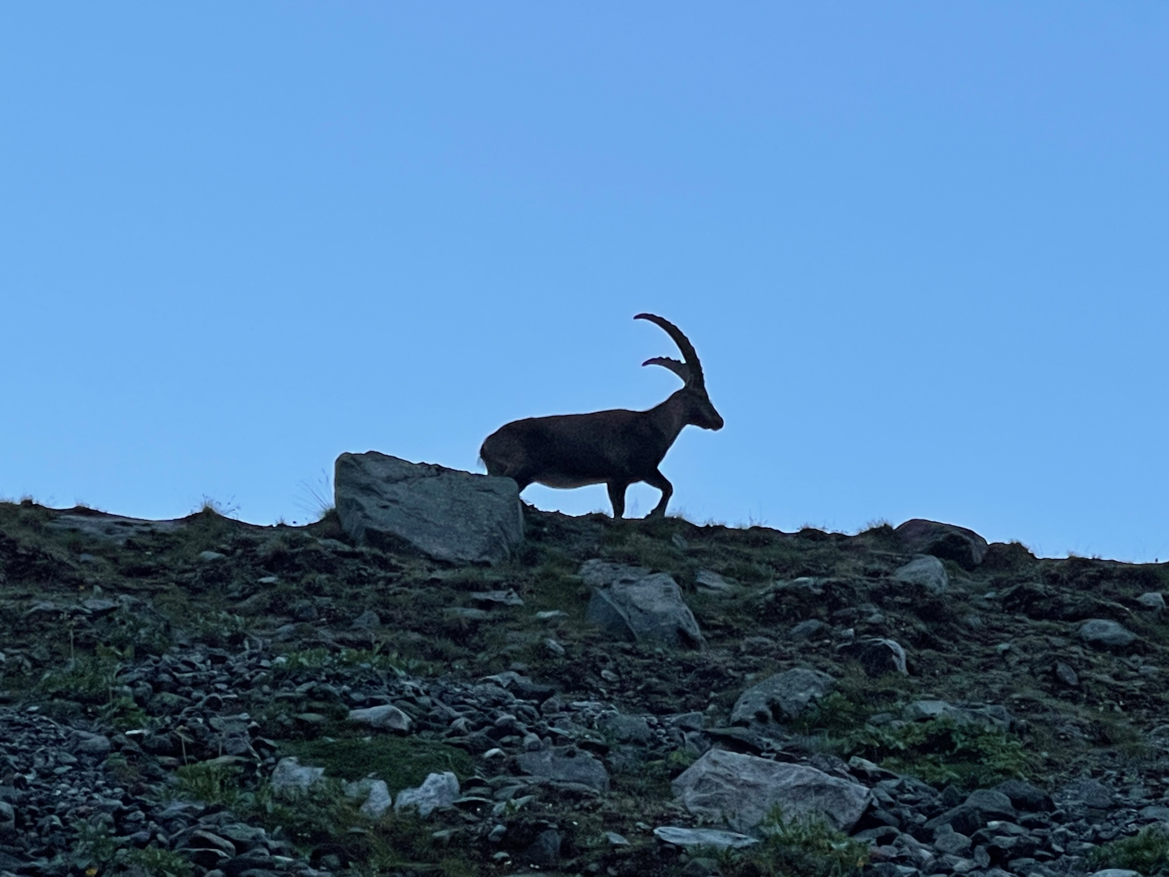 On arrive à Moiry un peu avant 6h, le parking, que dis-je, le camping, est squatté par les camping-cars et les vans, c’est hyper bucolique comme spot. On se met en marche en direction de la cabane et on admire un magnifique bouquetin qui évolue tranquillement sur la moraine, quel beau cadeau. L’approche depuis la cabane se fait dans un pierrier un peu casse-pattes. On s’équipe peu avant le col où l’on retrouve le soleil et le vue sur la couronne impériale. Quel régal pour les yeux. On débute notre cheminement sur l’arête.