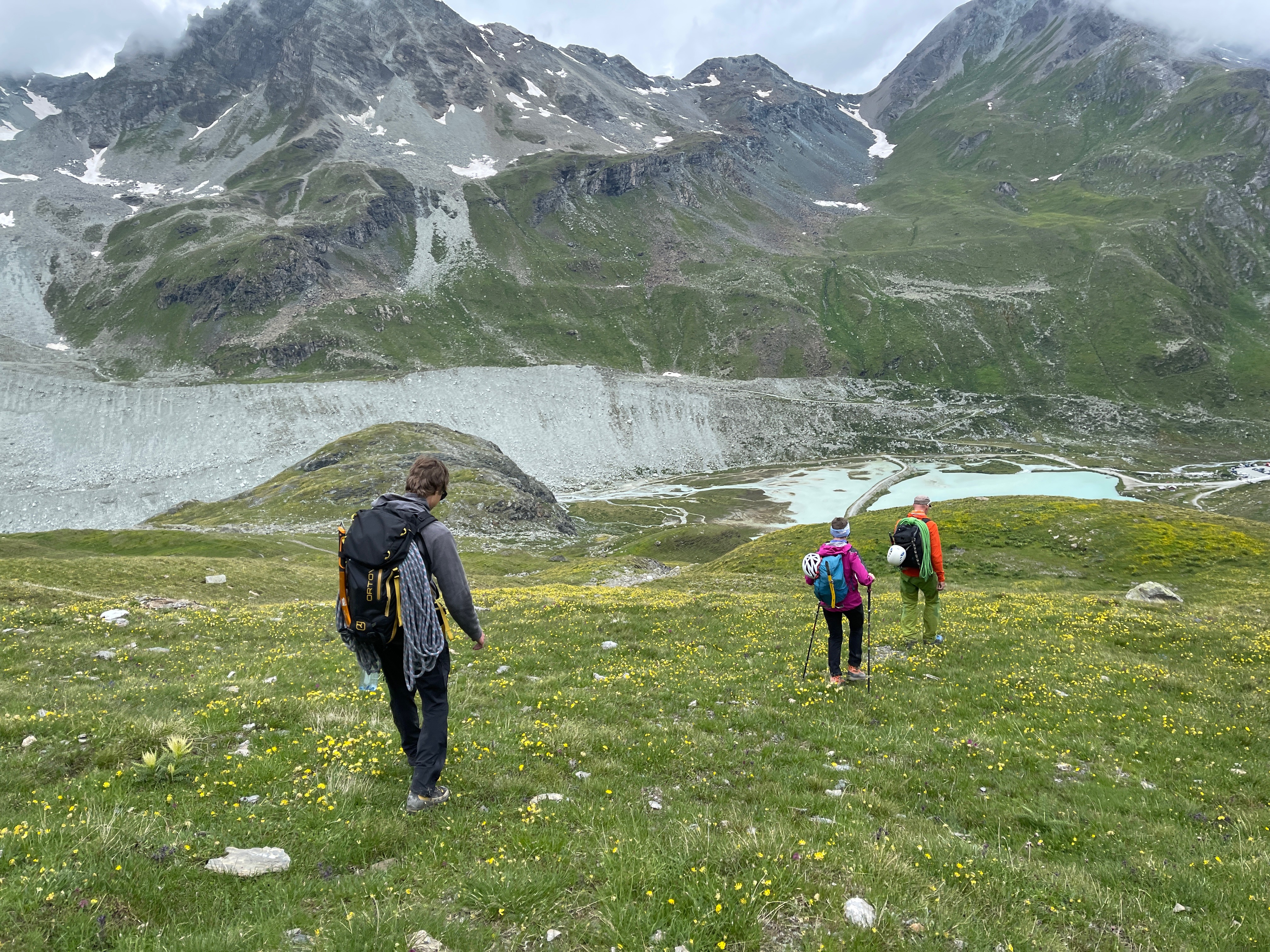 On arrive au sommet et on jète un petit coup d’oeil au radar météo. La pluie est annoncée dans 1h30 ! On se barre sans demander notre reste. Un peu de désescalade facile d’abord, puis un chemin hyper instable où l’on s’envoie des cailloux les uns sur les autres, avant de remonter au Col de la Lé. On n’est pas encore au bout de nos peines, il y a encore un couloir de graille et de boue à descendre et on est super heureux de retrouver l’herbe fraîche des pâturages de Moiry. Et contre toute attente on arrive même à la voiture avant la pluie, c’est beau ça !