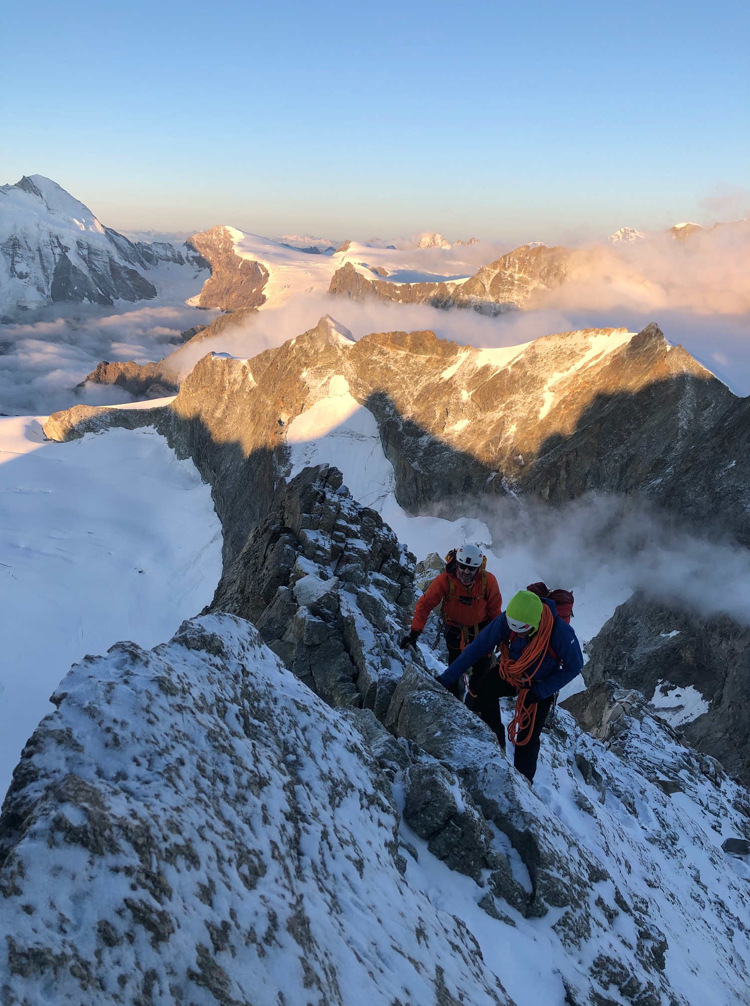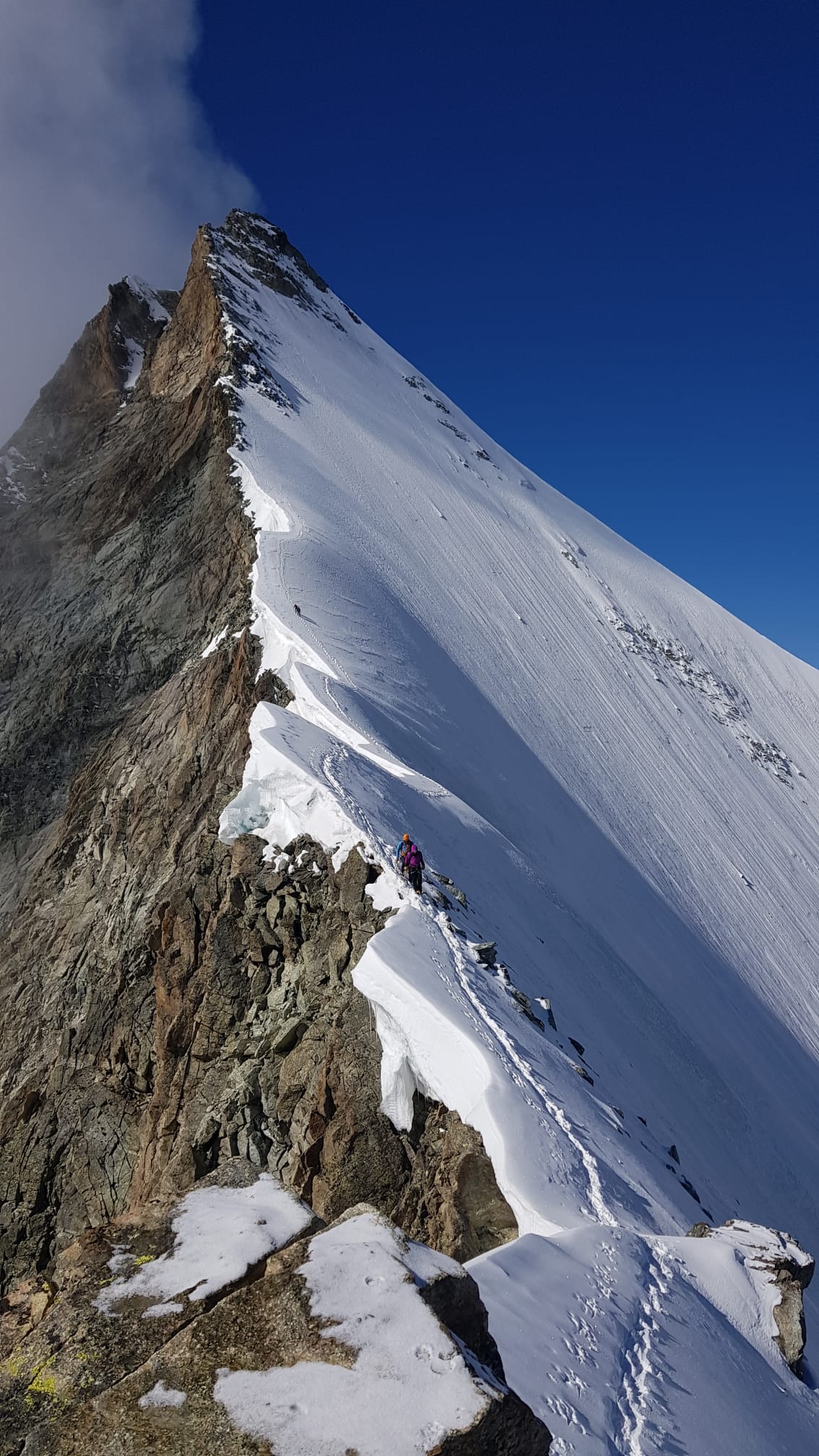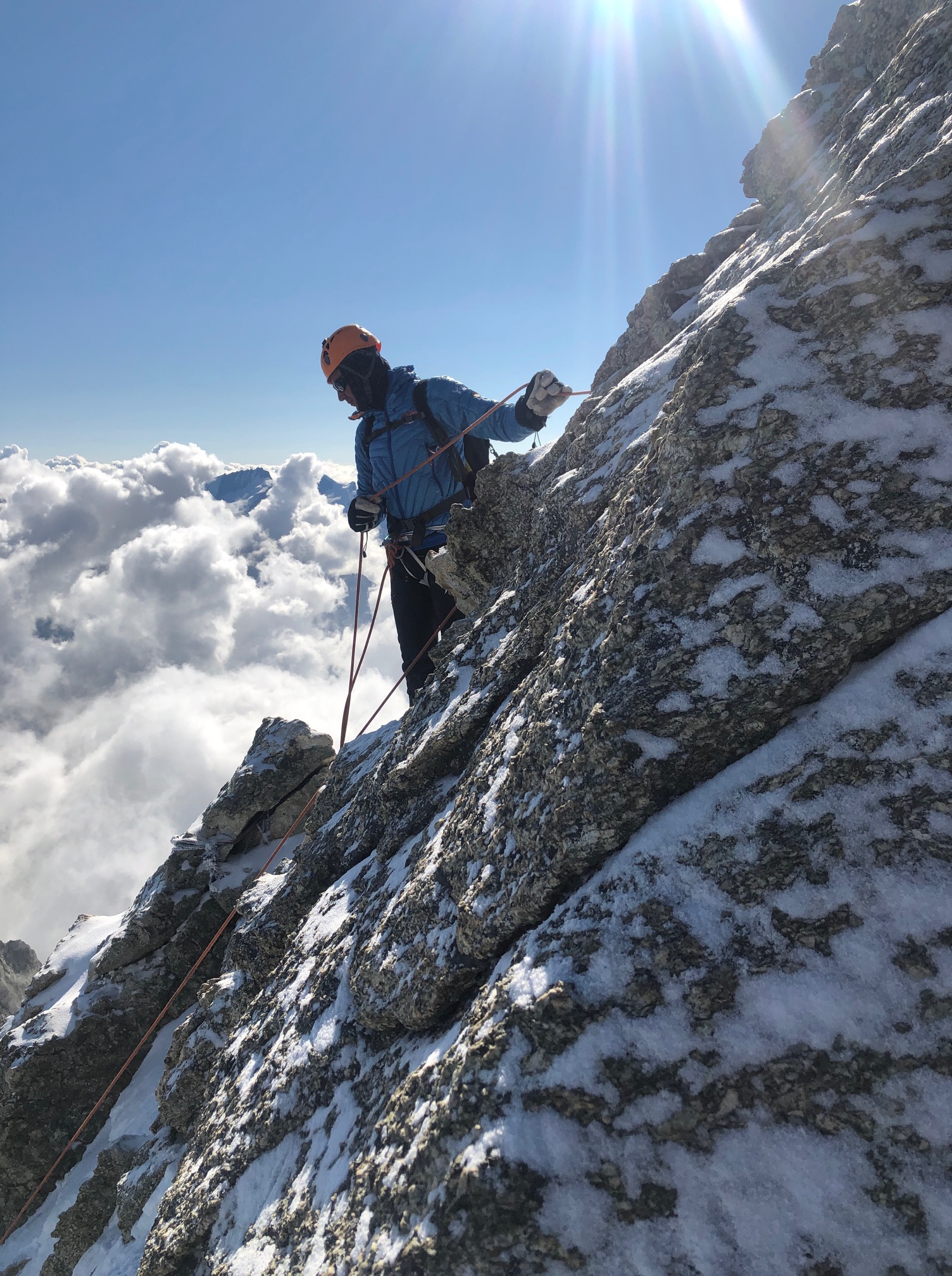 On arrive sur l’arête. La face NW est bien enneigée, mais ça va encore un p’tit bout sans crampons, jusqu’à ce qu’on parte vraiment dans la face sous un gendarme. Ça caille méchamment, j’ai les doigts gelés mais j’ai la flemme de chercher mes gros gants dans mon sac. Je continue avec mes p’tit gants pleins de trous qui plus est et je me prend une onglée de douze, mais je n’ai pas vraiment le temps d’avoir mal. Je suis bien accaparée par la grimpe, le gaz, la cordée d’allemand qui fait n’importe quoi, la beauté des lieux, Pål et son sourire jusqu’aux oreilles, Manu et son optimisme (« encore 10 minutes et pis bam, on est au sommet »), la cabane du Mountet 10’000 km plus bas où je suis censée être demain soir….