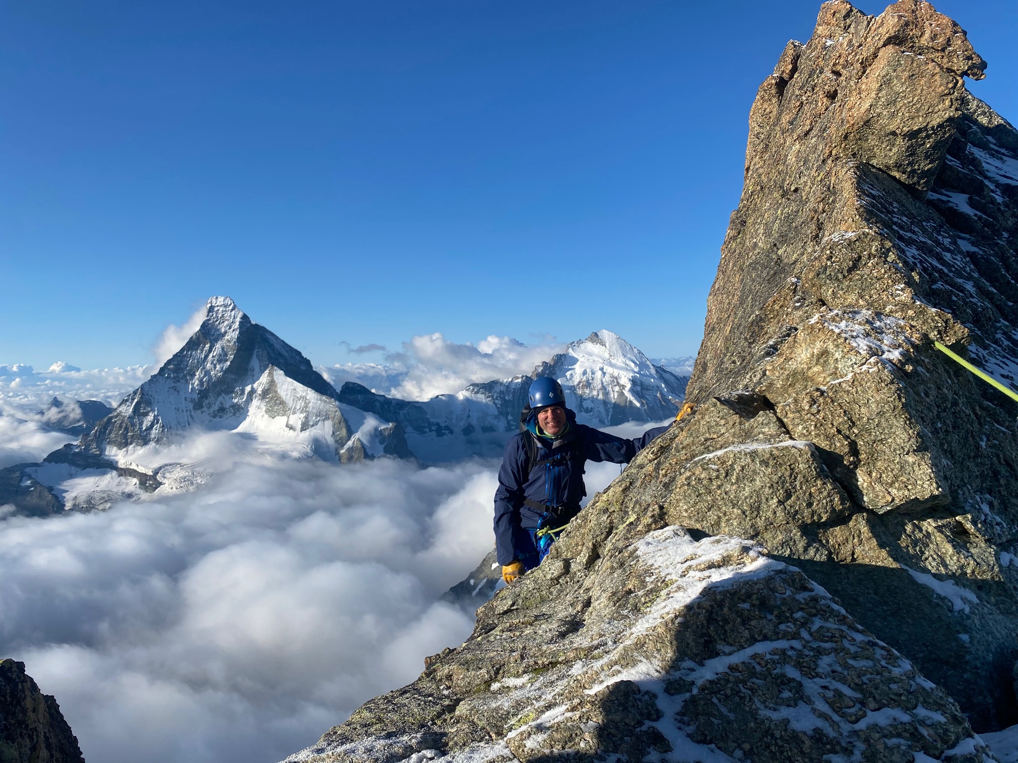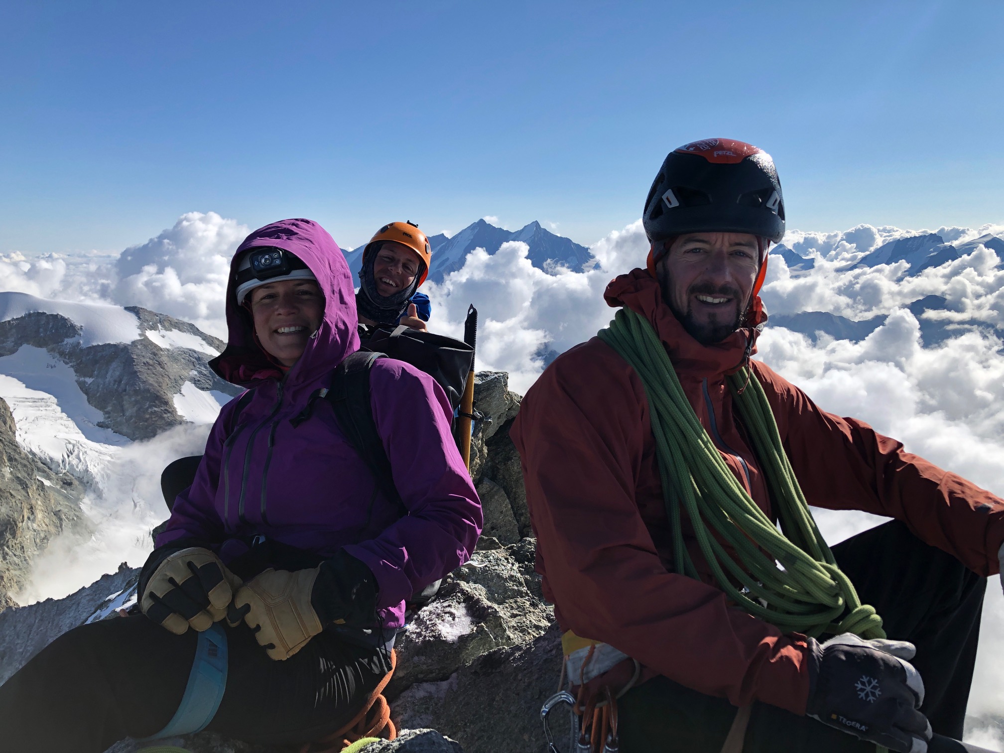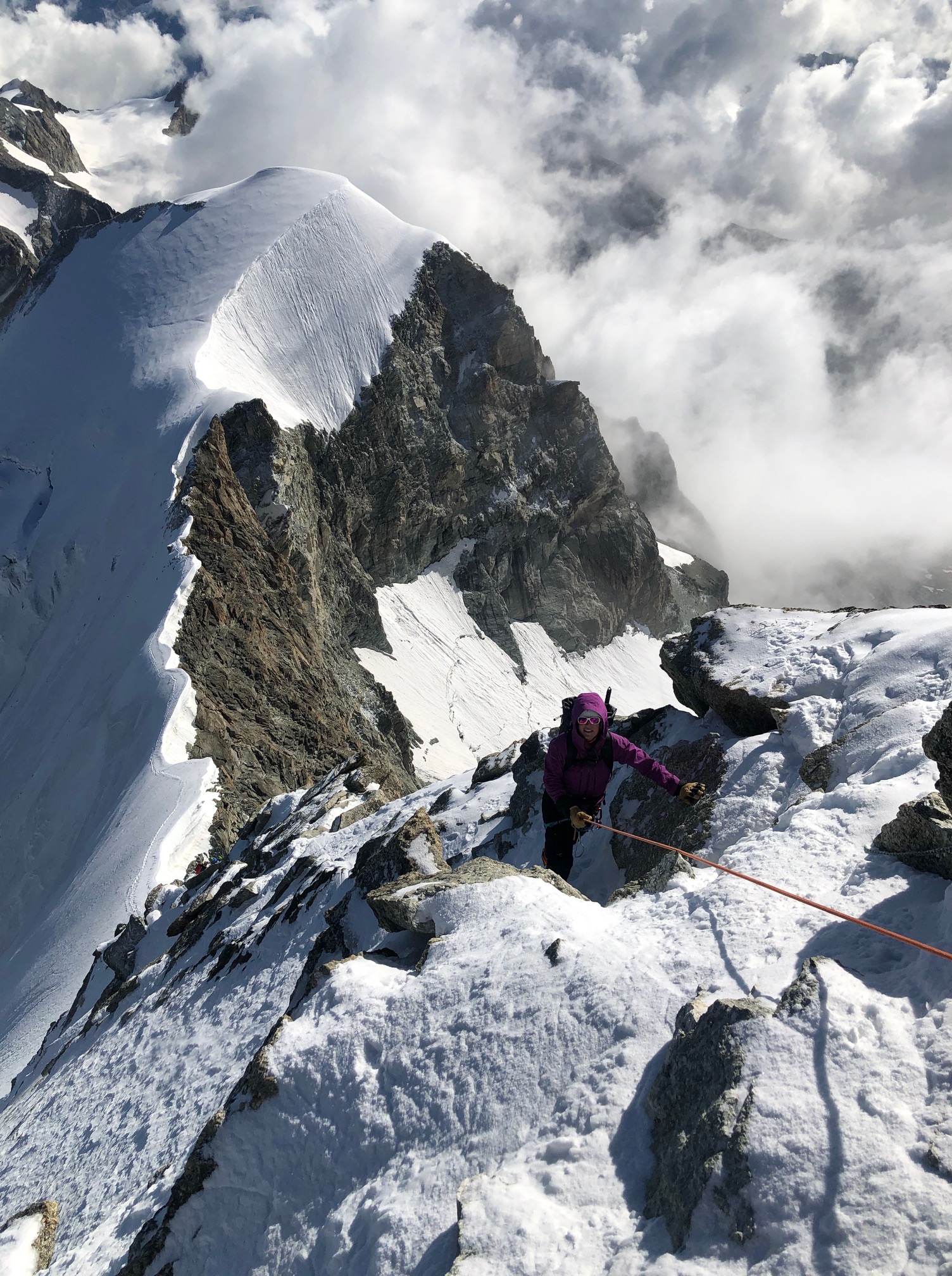 On arrive sur l’arête. La face NW est bien enneigée, mais ça va encore un p’tit bout sans crampons, jusqu’à ce qu’on parte vraiment dans la face sous un gendarme. Ça caille méchamment, j’ai les doigts gelés mais j’ai la flemme de chercher mes gros gants dans mon sac. Je continue avec mes p’tit gants pleins de trous qui plus est et je me prend une onglée de douze, mais je n’ai pas vraiment le temps d’avoir mal. Je suis bien accaparée par la grimpe, le gaz, la cordée d’allemand qui fait n’importe quoi, la beauté des lieux, Pål et son sourire jusqu’aux oreilles, Manu et son optimisme (« encore 10 minutes et pis bam, on est au sommet »), la cabane du Mountet 10’000 km plus bas où je suis censée être demain soir….