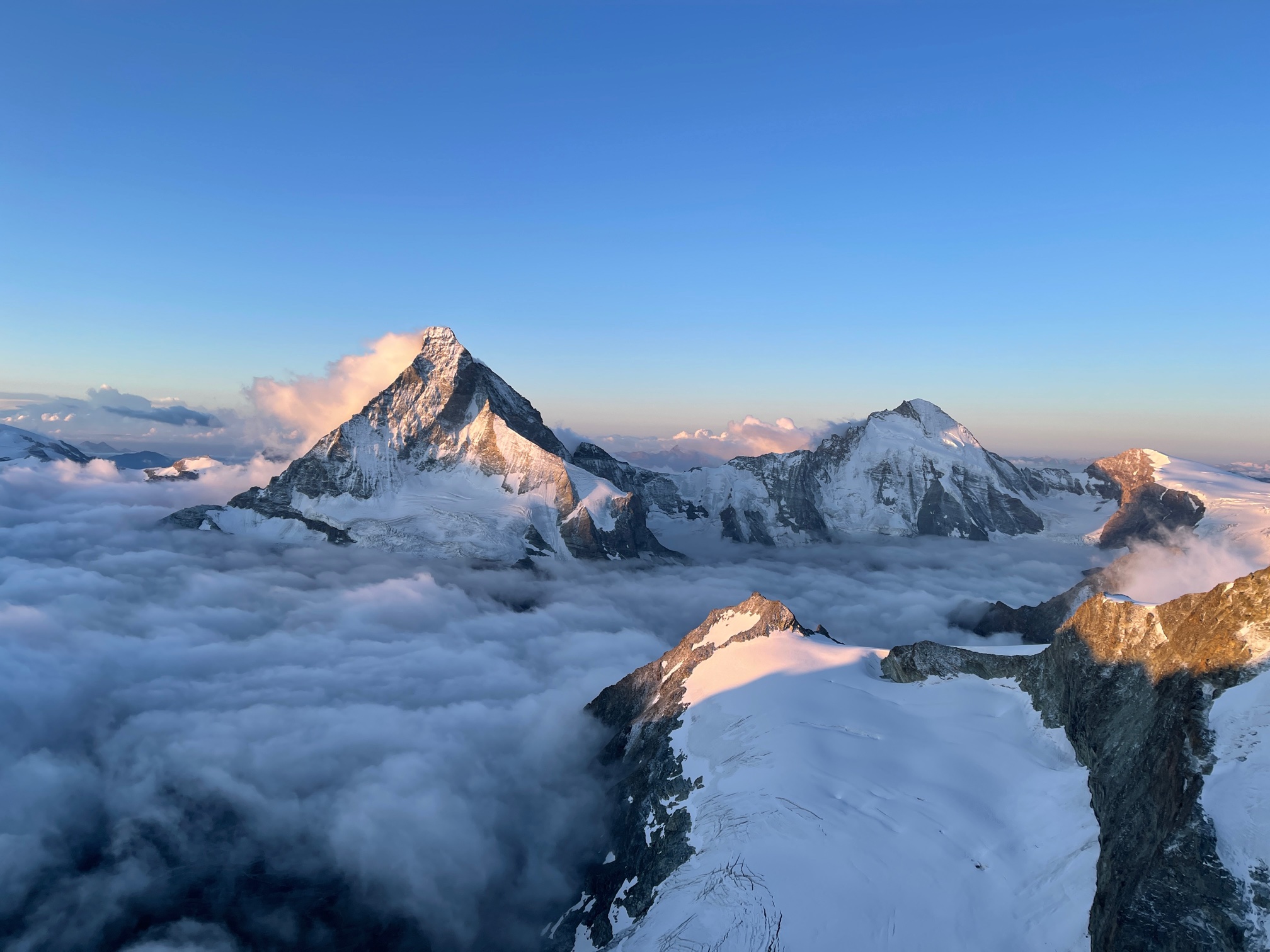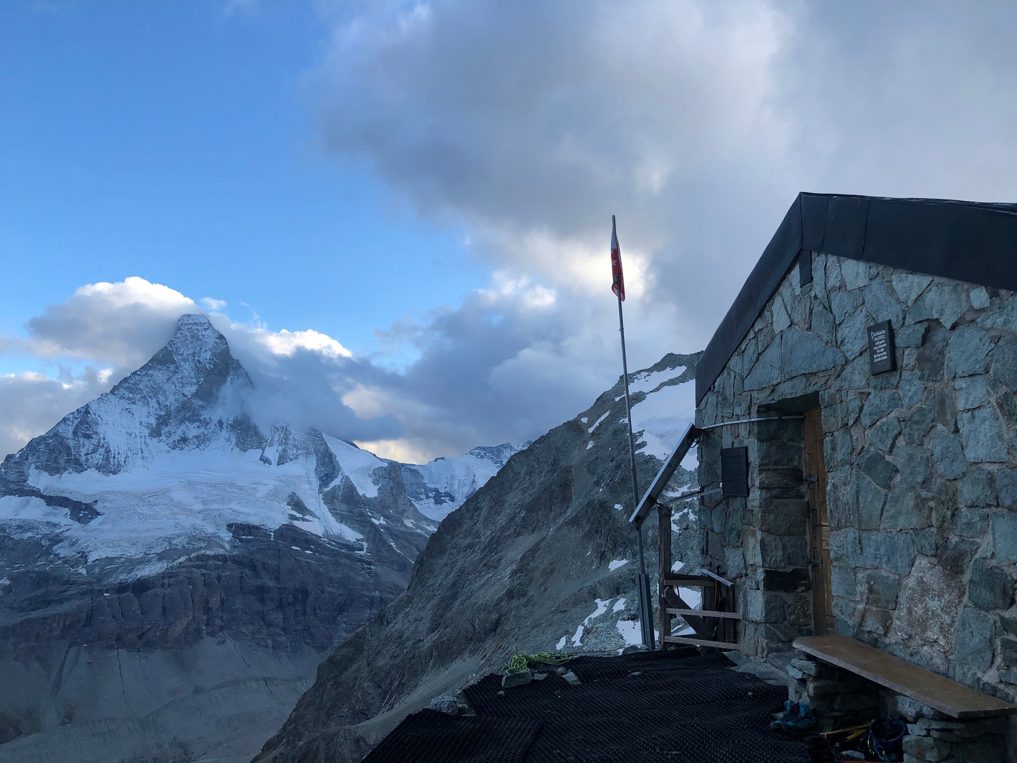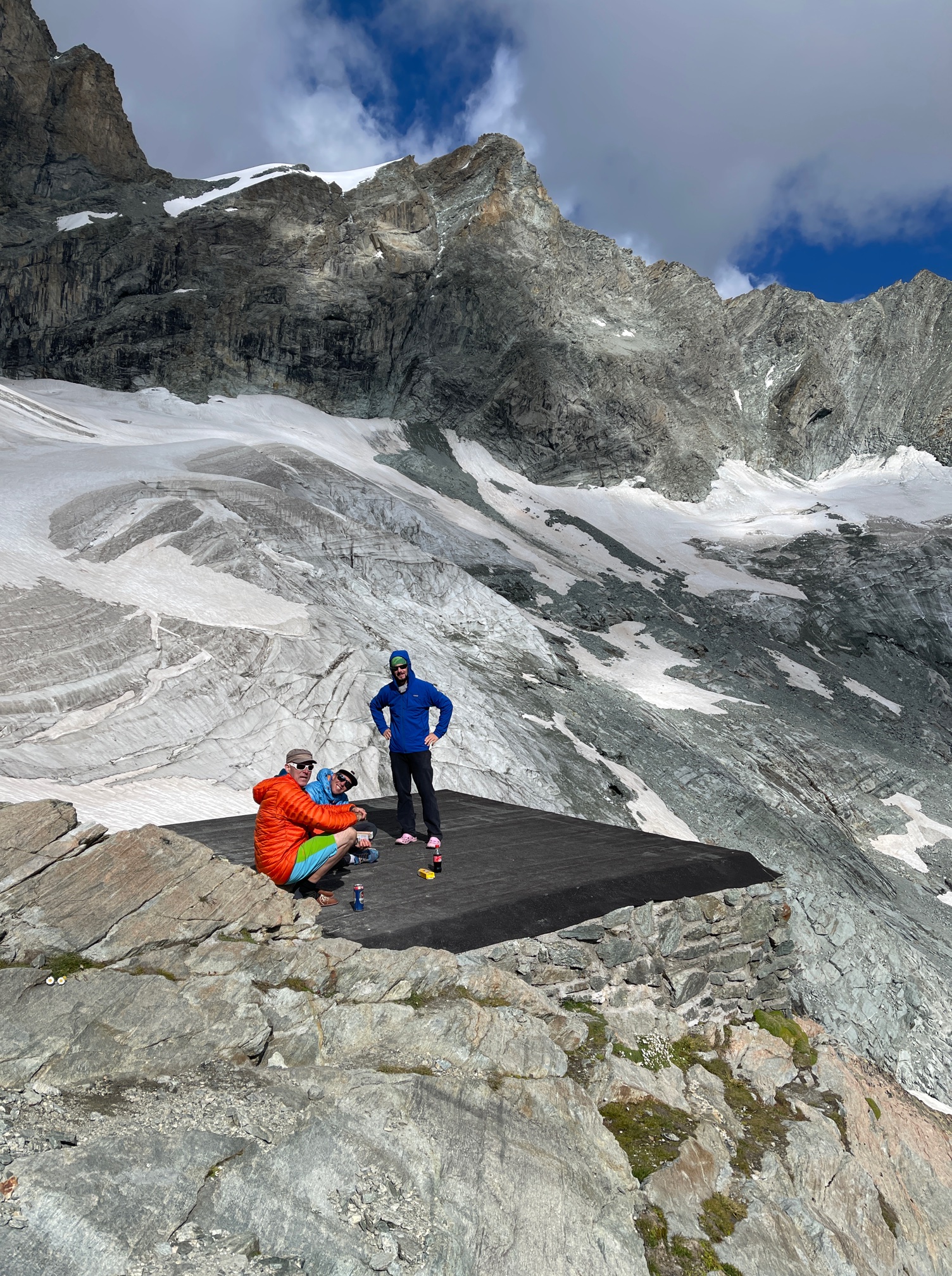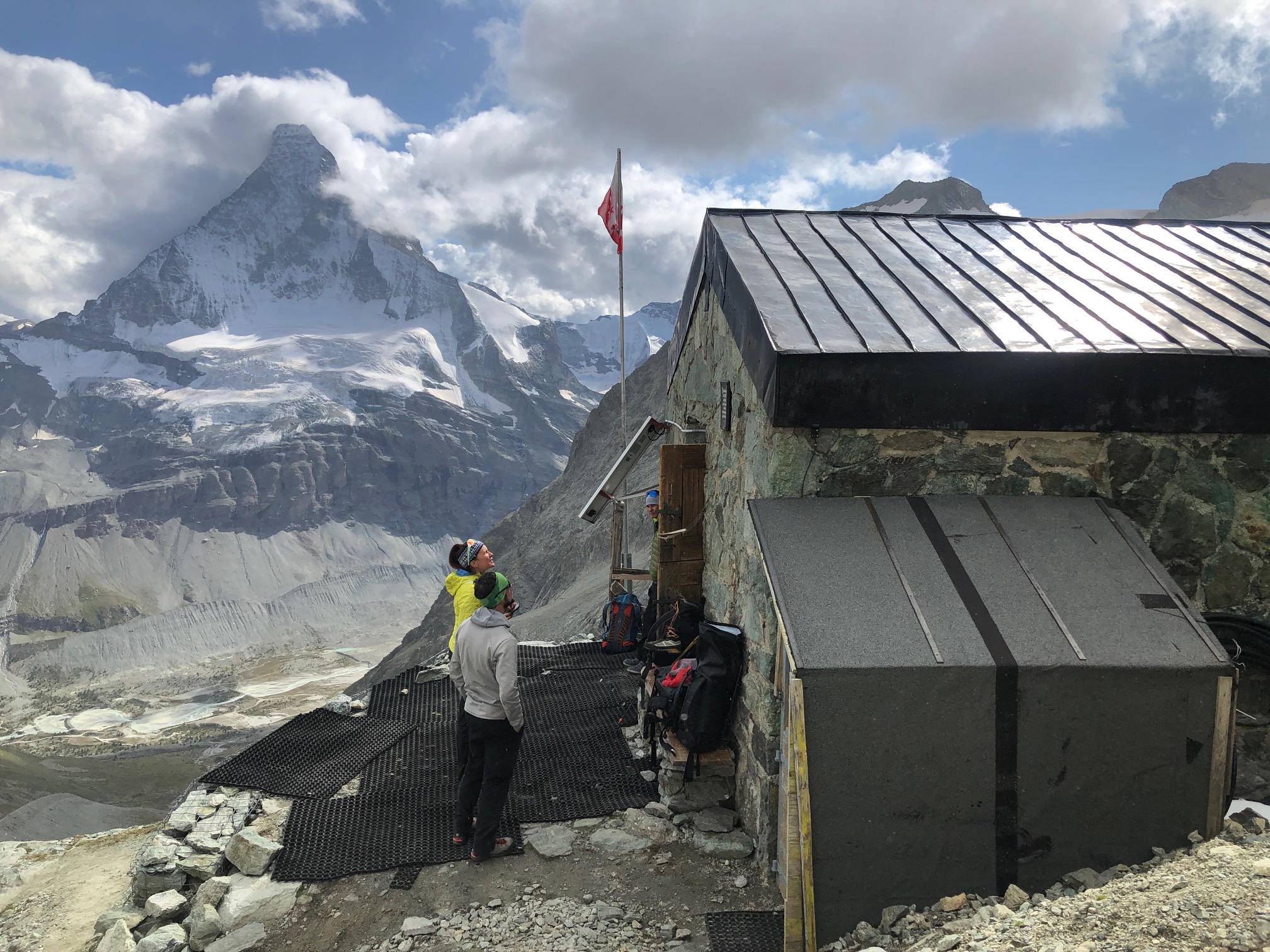 La montée au bivouac face à l’imposante face nord du Cervin passe assez vite finalement, c’est efficace comme chemin. Et la dernière petite partie dans une espèce de via ferrata ajoute un p’tit supplément ludique à l’histoire. On prend l’apéro sur le toit de la réserve avant de manger nos pâtes à la tomate. Y a une sacrée bonne ambiance dans ce bivouac, notamment grâce à Ophélie et Camille, dites les schnuggettes, qui nous ont bien fait marrer avec leurs histoires d’étudiantes en sciences du sports et leurs exploits en patinage, en hockey et en plongeon. Le temps d’un repas elles m’auront fait oublier ma peur.