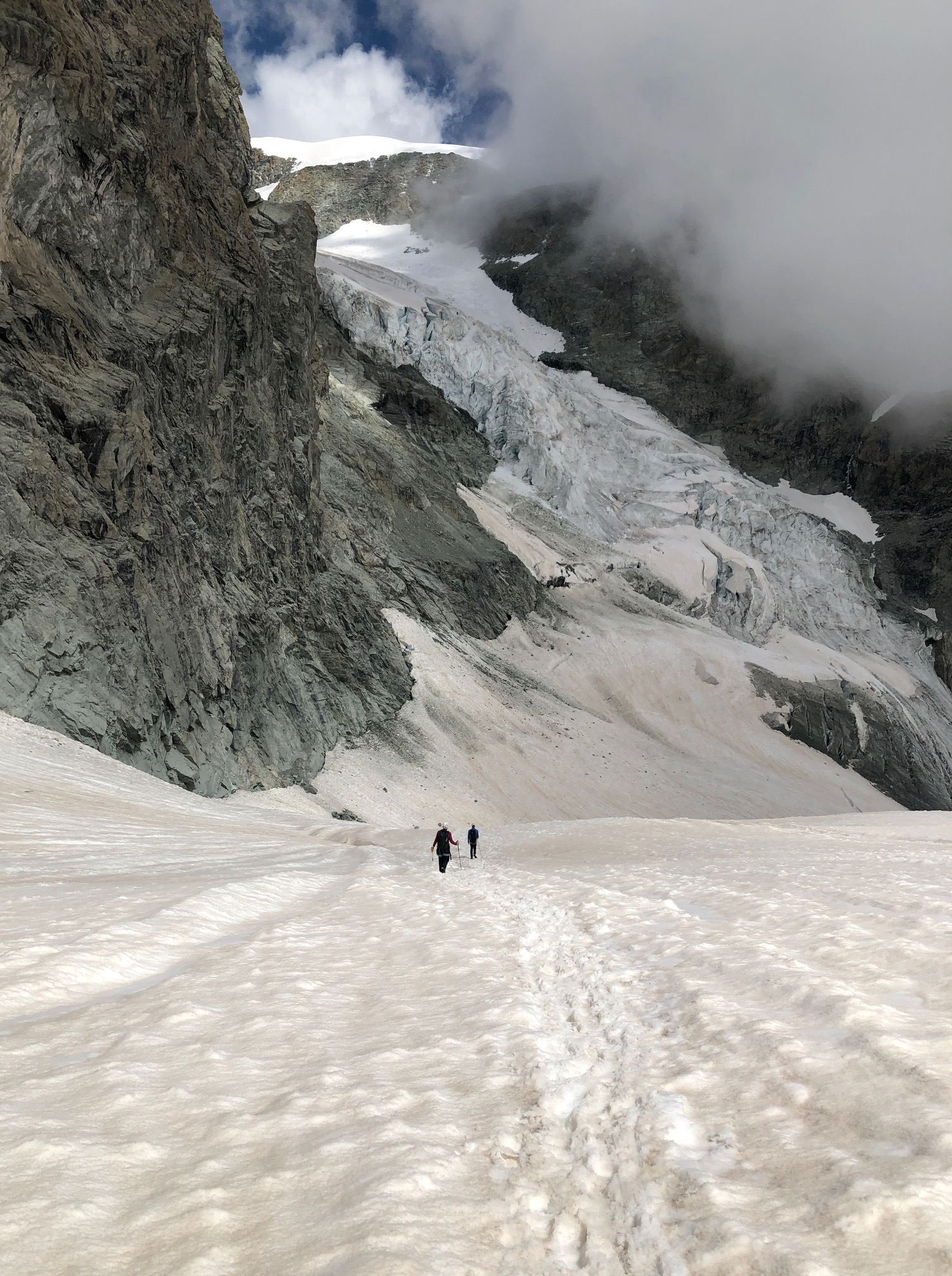La descente de la Wellenkuppe est sans fin, quand on crois qu’on y est ben … y a encore un ressaut ! Je suis pas mal soulagée de mettre les pieds sur le glacier qui est super bouché et en bonnes conditions, on arrive bien vite à la cabane pour le rösti et la panaché. Quelle journée !