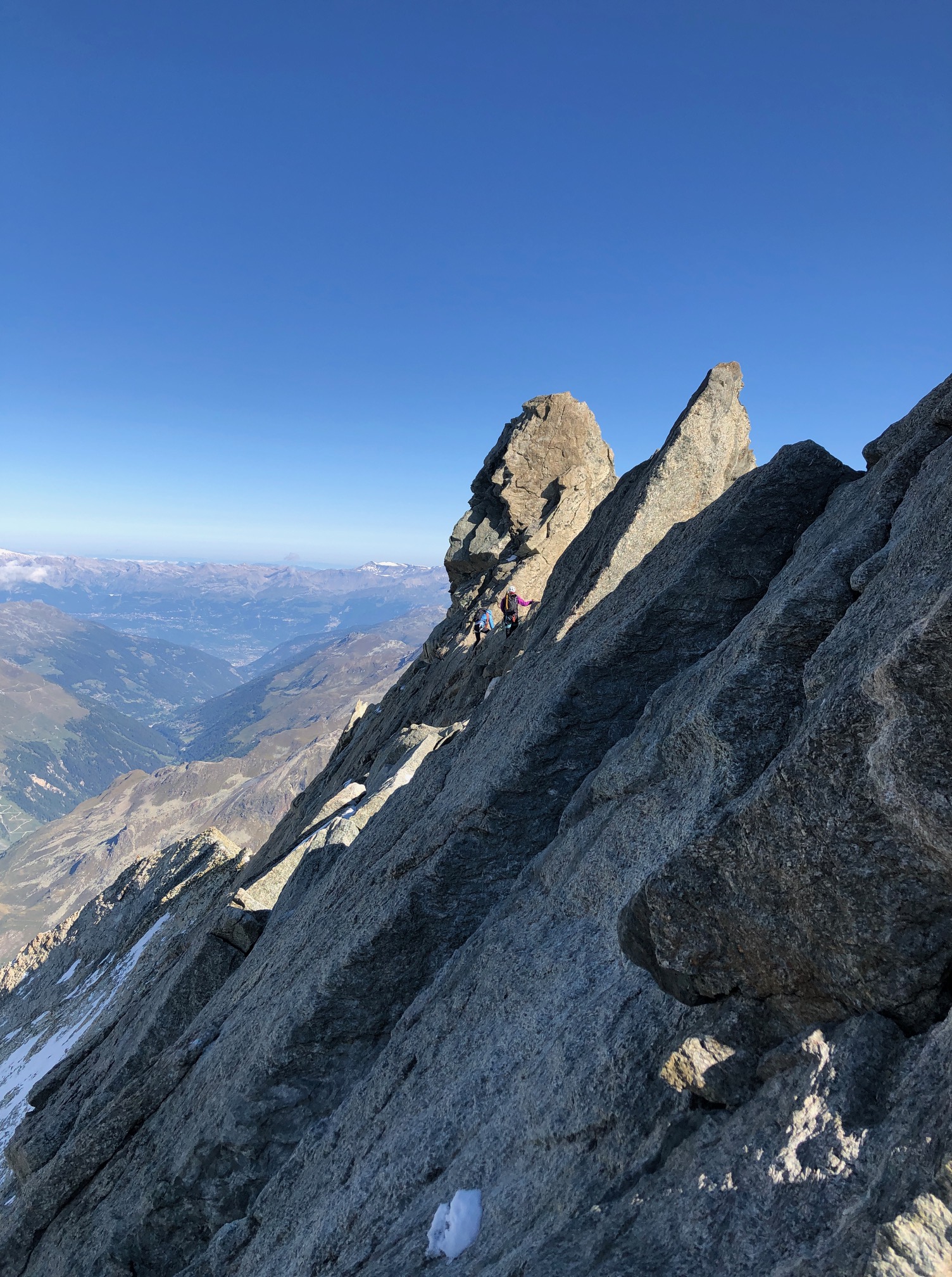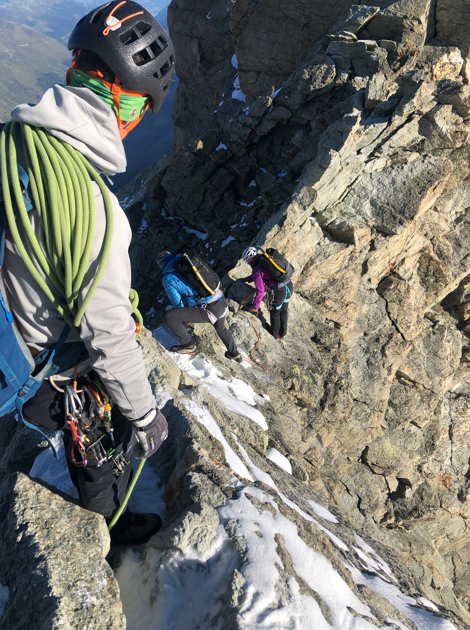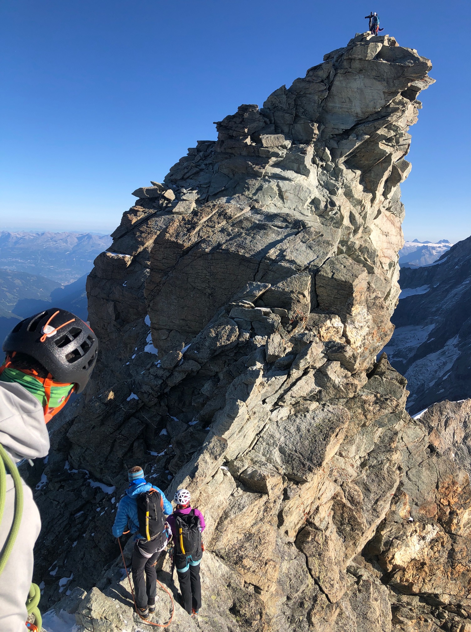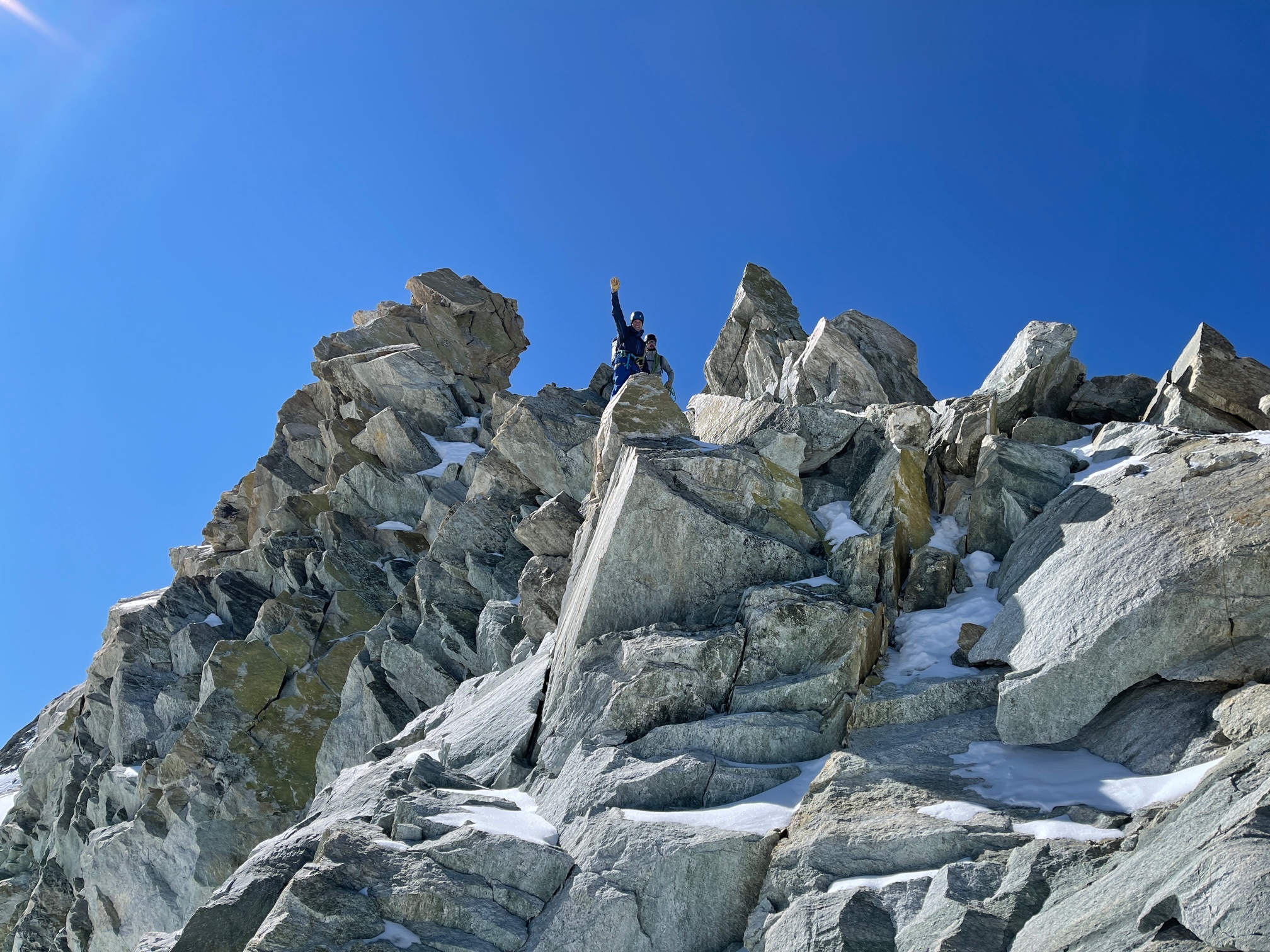 On garde encore les crampons pour traverser dans la face sud jusqu’au pied du couloir de la Gabel. La grimpe est facile et ludique, j’ai vraiment du plaisir. On fait une mini pause avant d’arriver sur l’arête pour profiter du soleil encore un peu. Après il fait nettement plus frisquet de l’autre côté, mais c’est toujours aussi plaisant. Un p’tit pas de bourrin et on arrive au sommet !