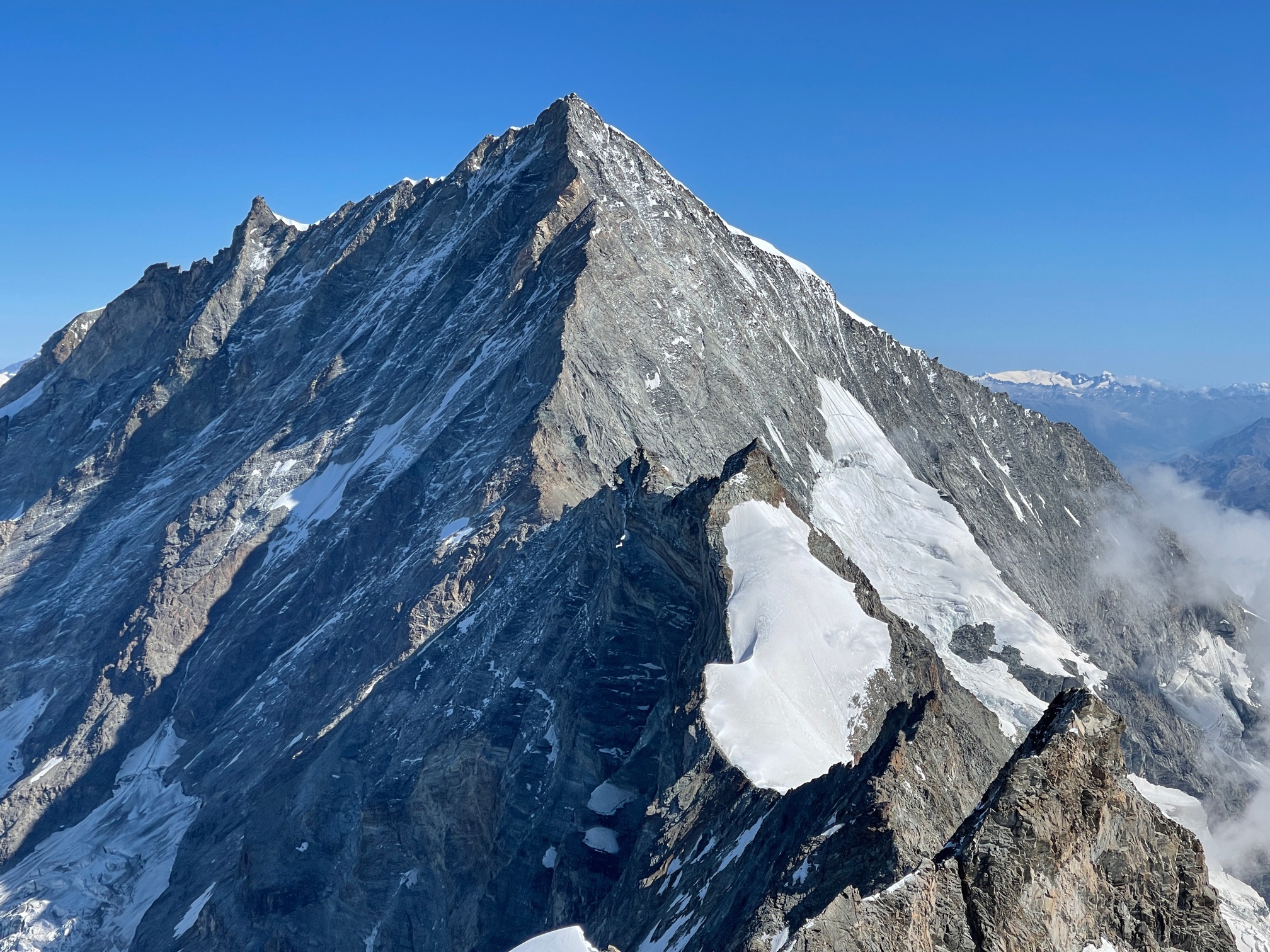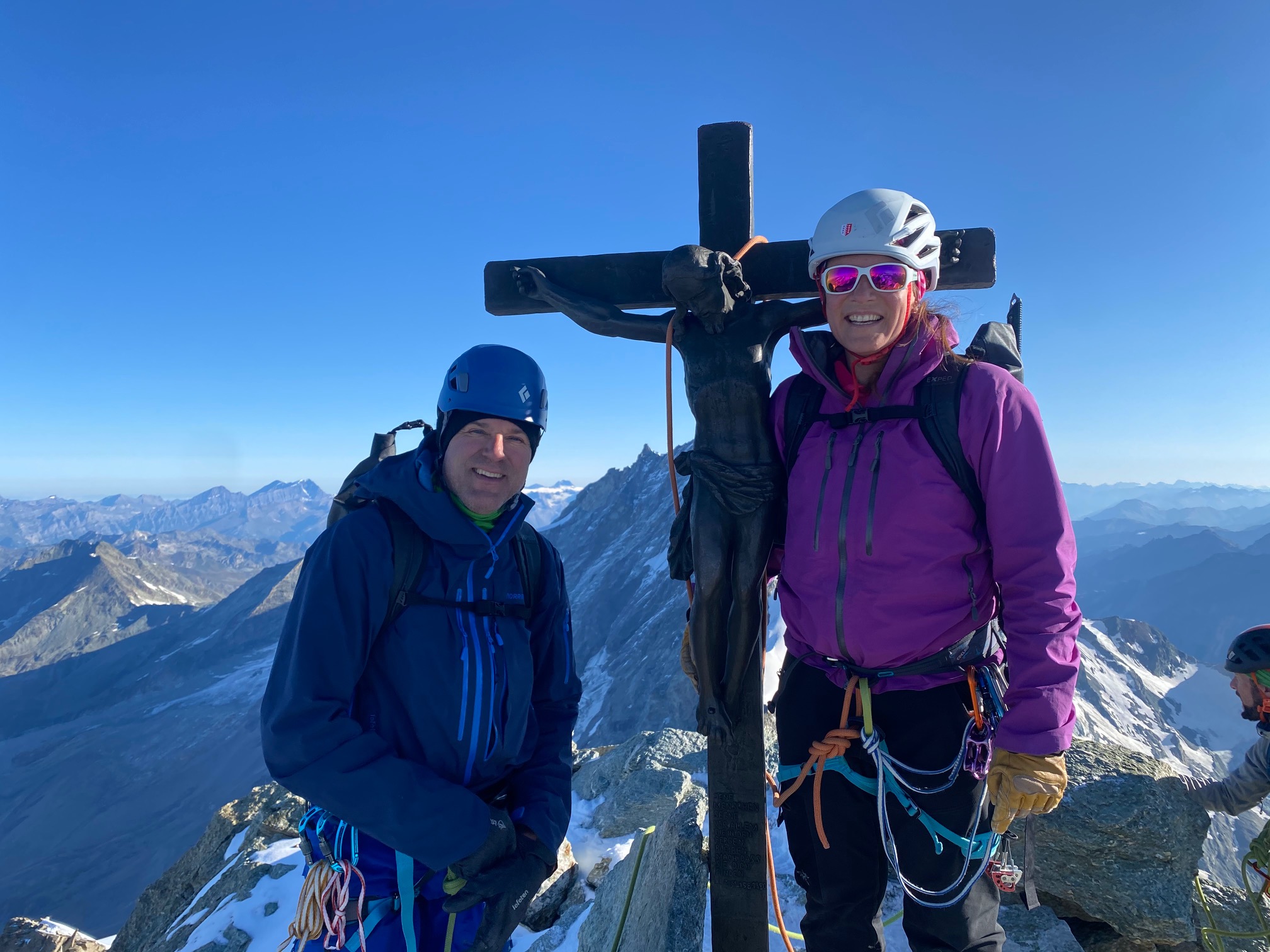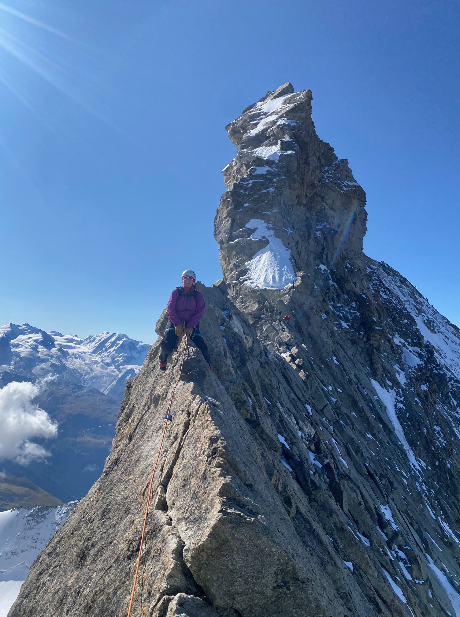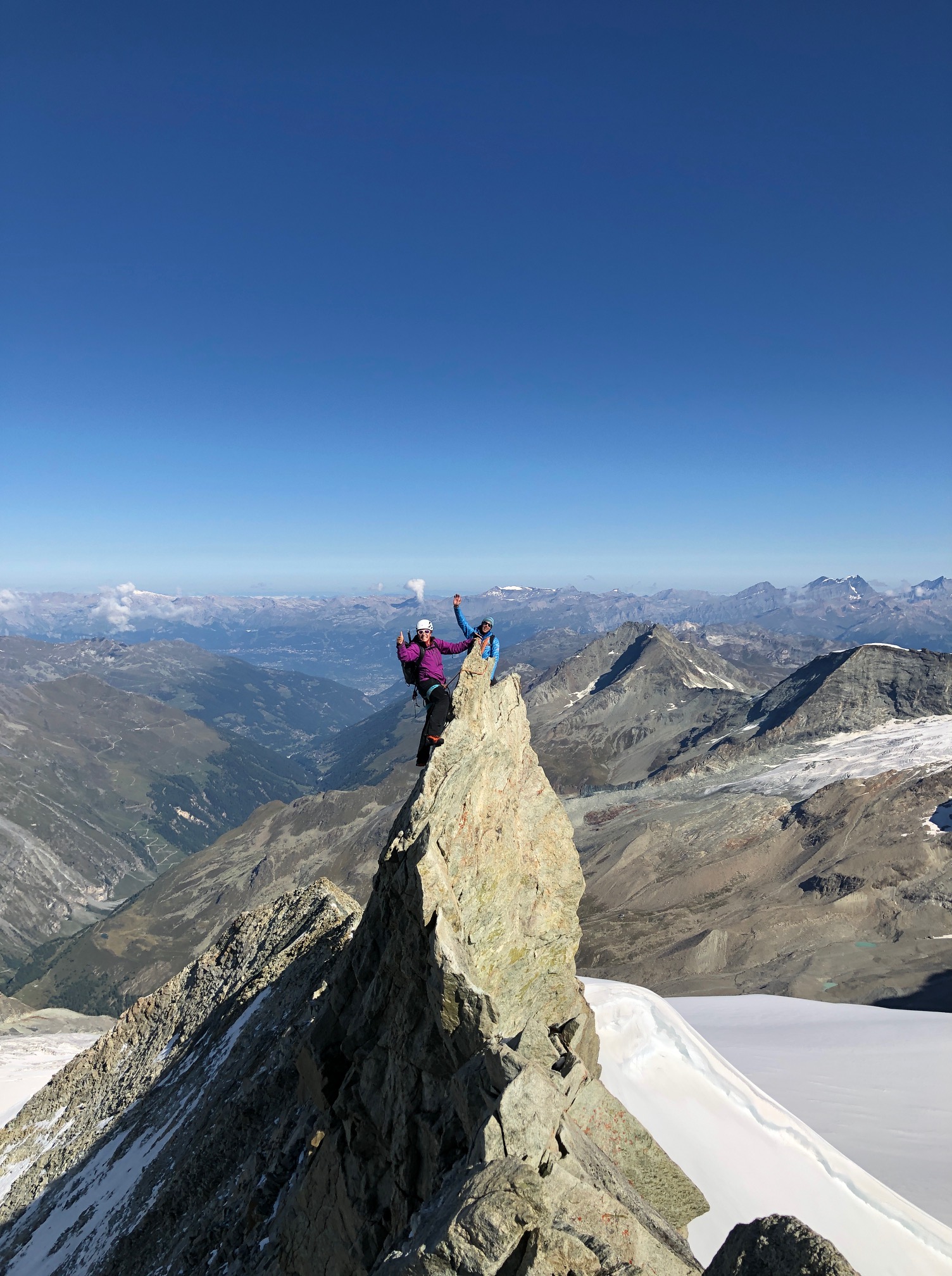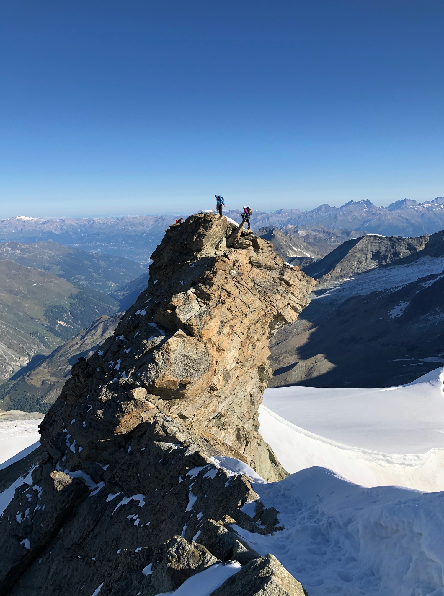 On garde encore les crampons pour traverser dans la face sud jusqu’au pied du couloir de la Gabel. La grimpe est facile et ludique, j’ai vraiment du plaisir. On fait une mini pause avant d’arriver sur l’arête pour profiter du soleil encore un peu. Après il fait nettement plus frisquet de l’autre côté, mais c’est toujours aussi plaisant. Un p’tit pas de bourrin et on arrive au sommet !