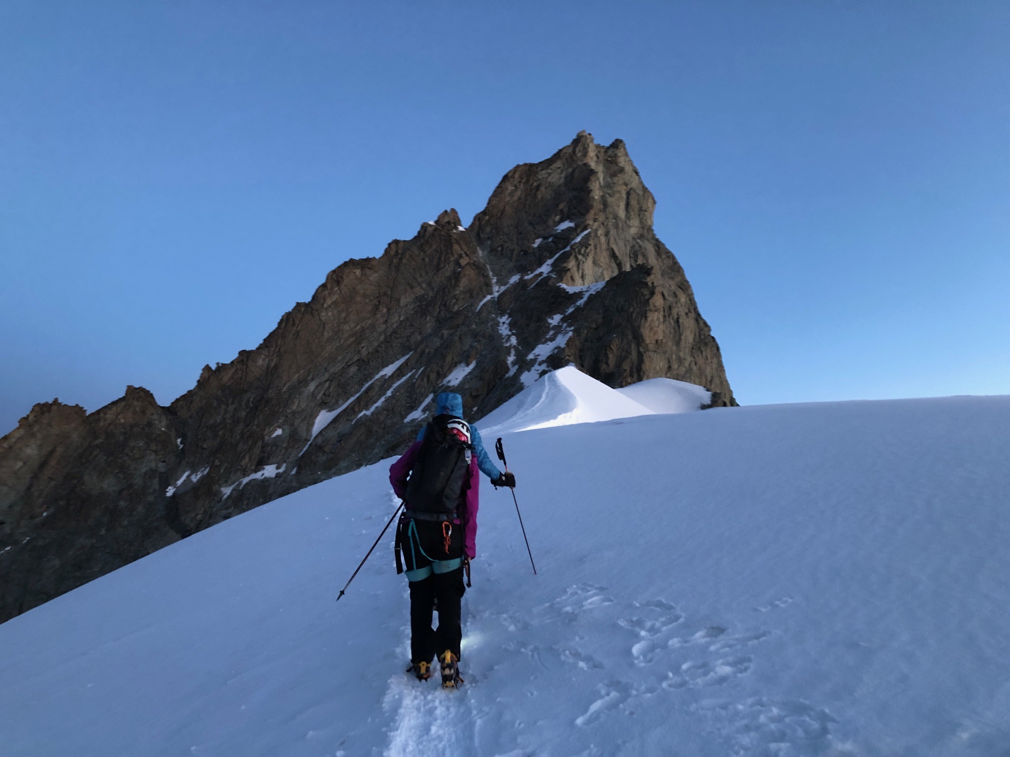 Le lendemain de notre mémorable traversée de l’Ober, on repart pour un joli petit morceau. P’tit déj à 4h, départ sur les chapeaux de roue à 4h30. Les guides nous avaient prévenus, il fallait partir vite pour être devant pour le passage du dièdre…. Pfff j’avais beau être avertie, je déteste toujours autant ça de devoir me stresser le matin et de jouer des coudes pour passer le passage avant les autres. Décidemment moi et l’esprit de compétition, ça fait deux.