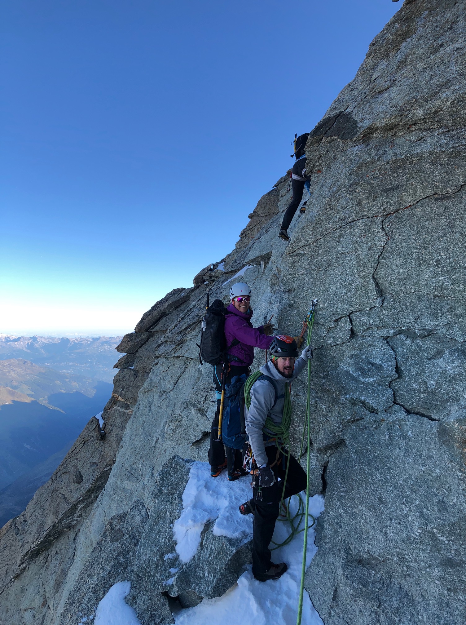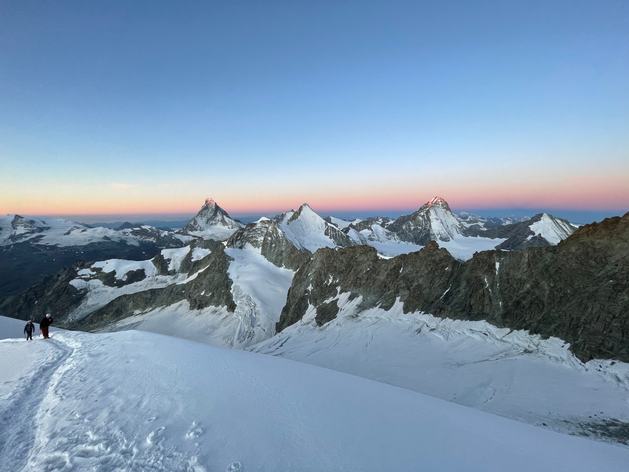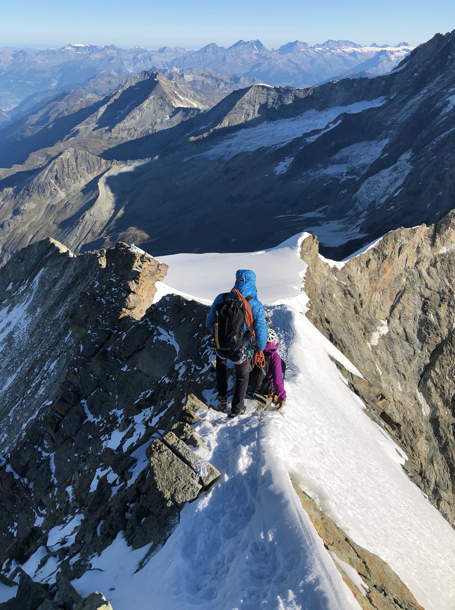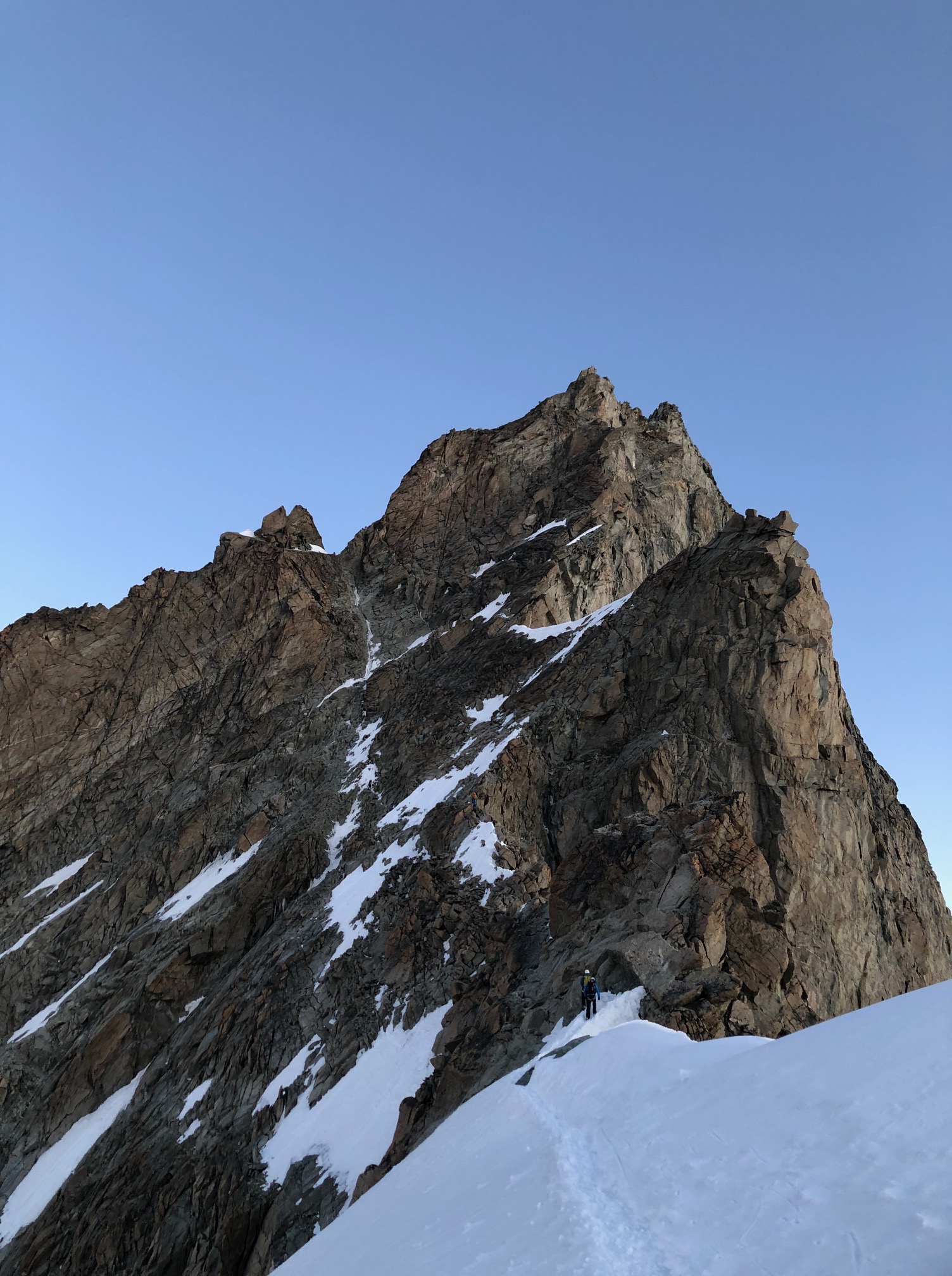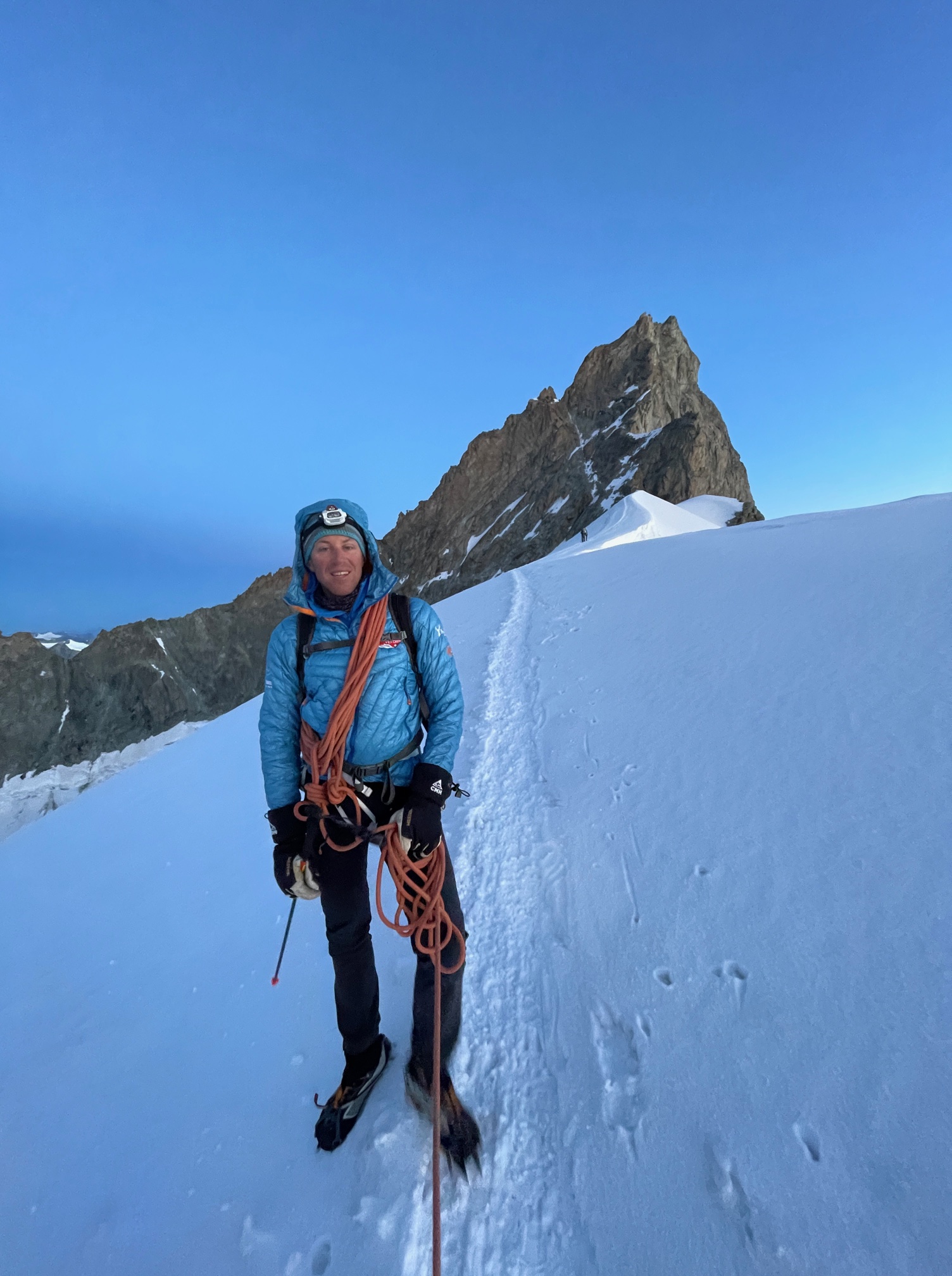 Finalement ça se passe comme ils l’avaient souhaité, on se retrouve à l’avant avec la cordée de Cyrille et de son client jurassien super sympa. On monte la belle pente de neige avec une vue de dingue sur les sommets environnants qui émergent dans une lumière incroyable. Quel bonheur d’être ici, ça vaut (presque) toutes les courses poursuites matinales.
