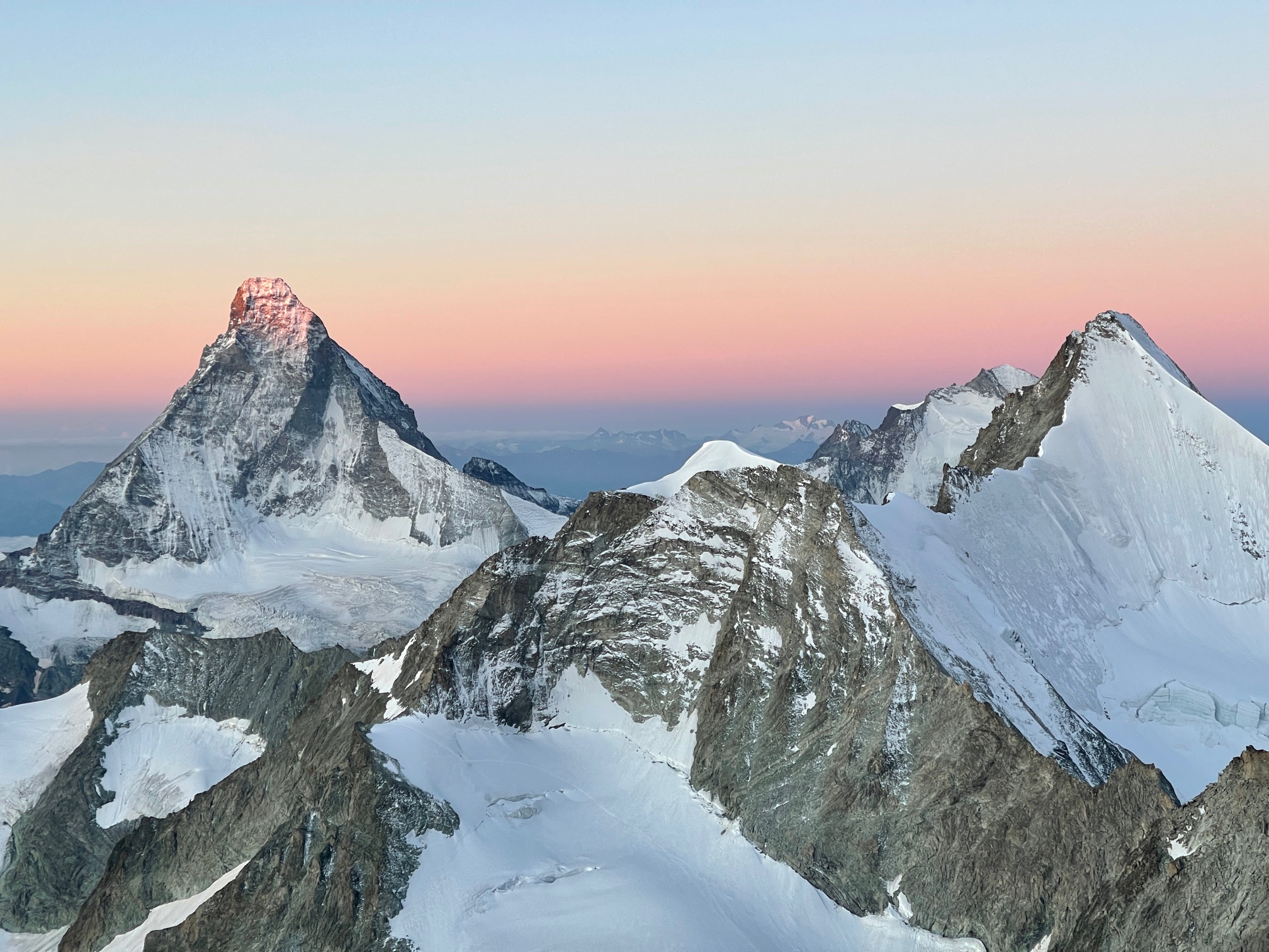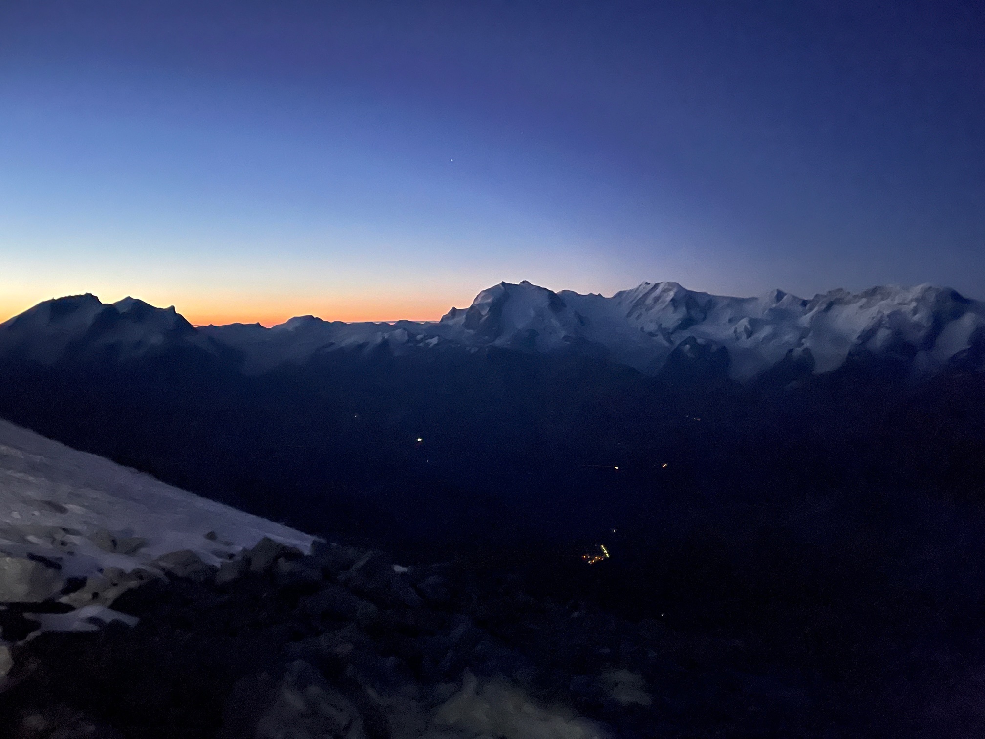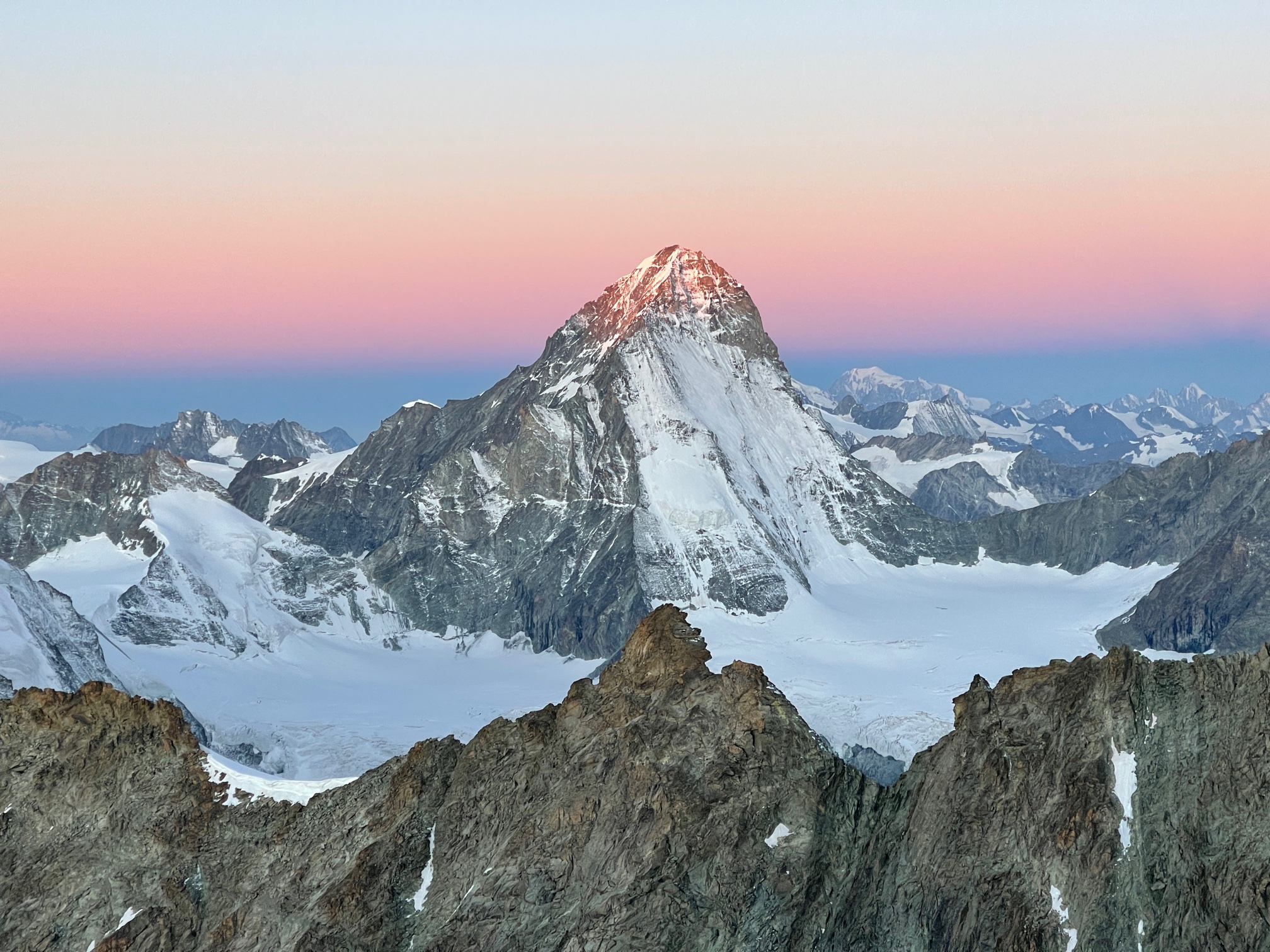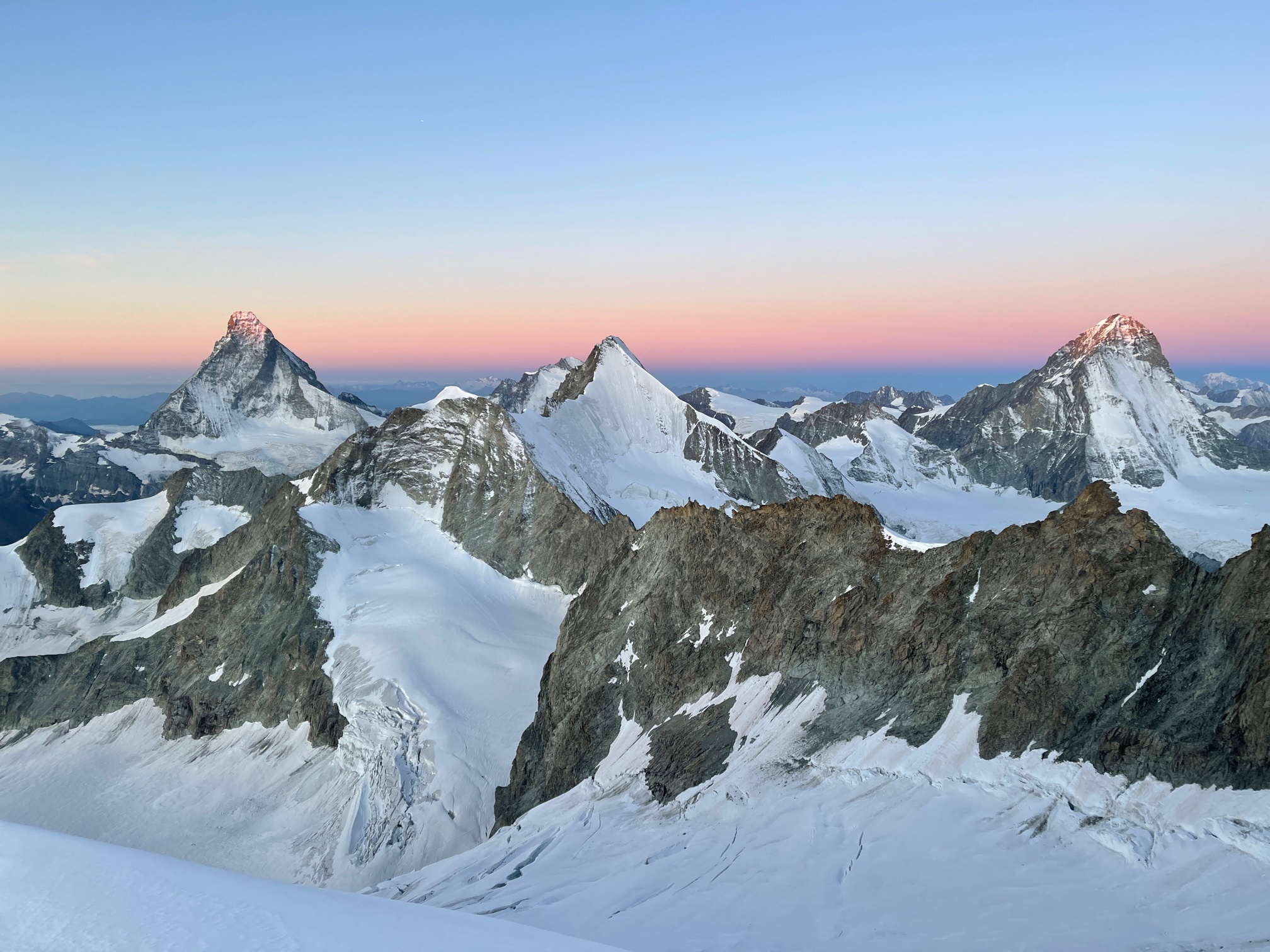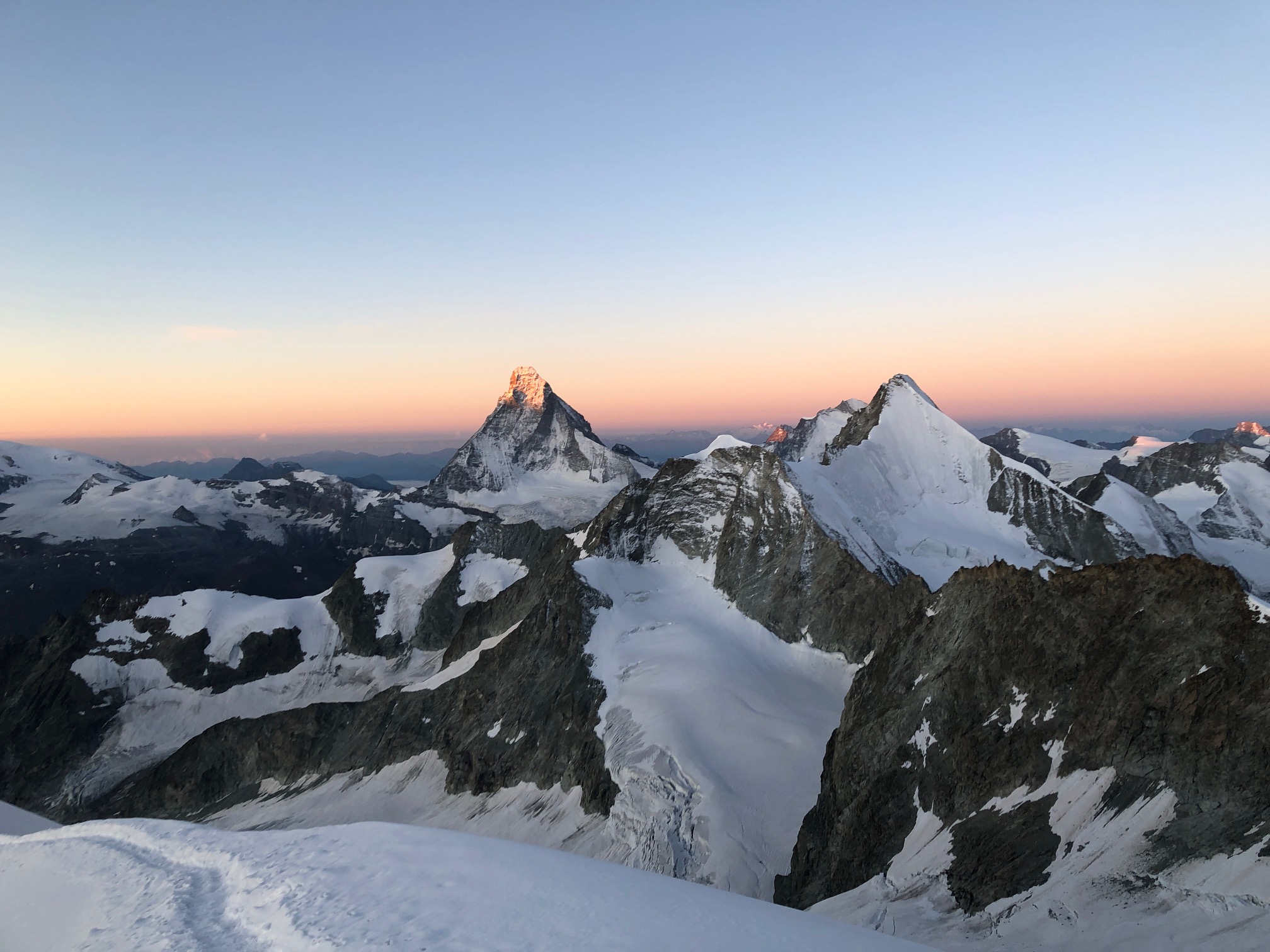 Finalement ça se passe comme ils l’avaient souhaité, on se retrouve à l’avant avec la cordée de Cyrille et de son client jurassien super sympa. On monte la belle pente de neige avec une vue de dingue sur les sommets environnants qui émergent dans une lumière incroyable. Quel bonheur d’être ici, ça vaut (presque) toutes les courses poursuites matinales.