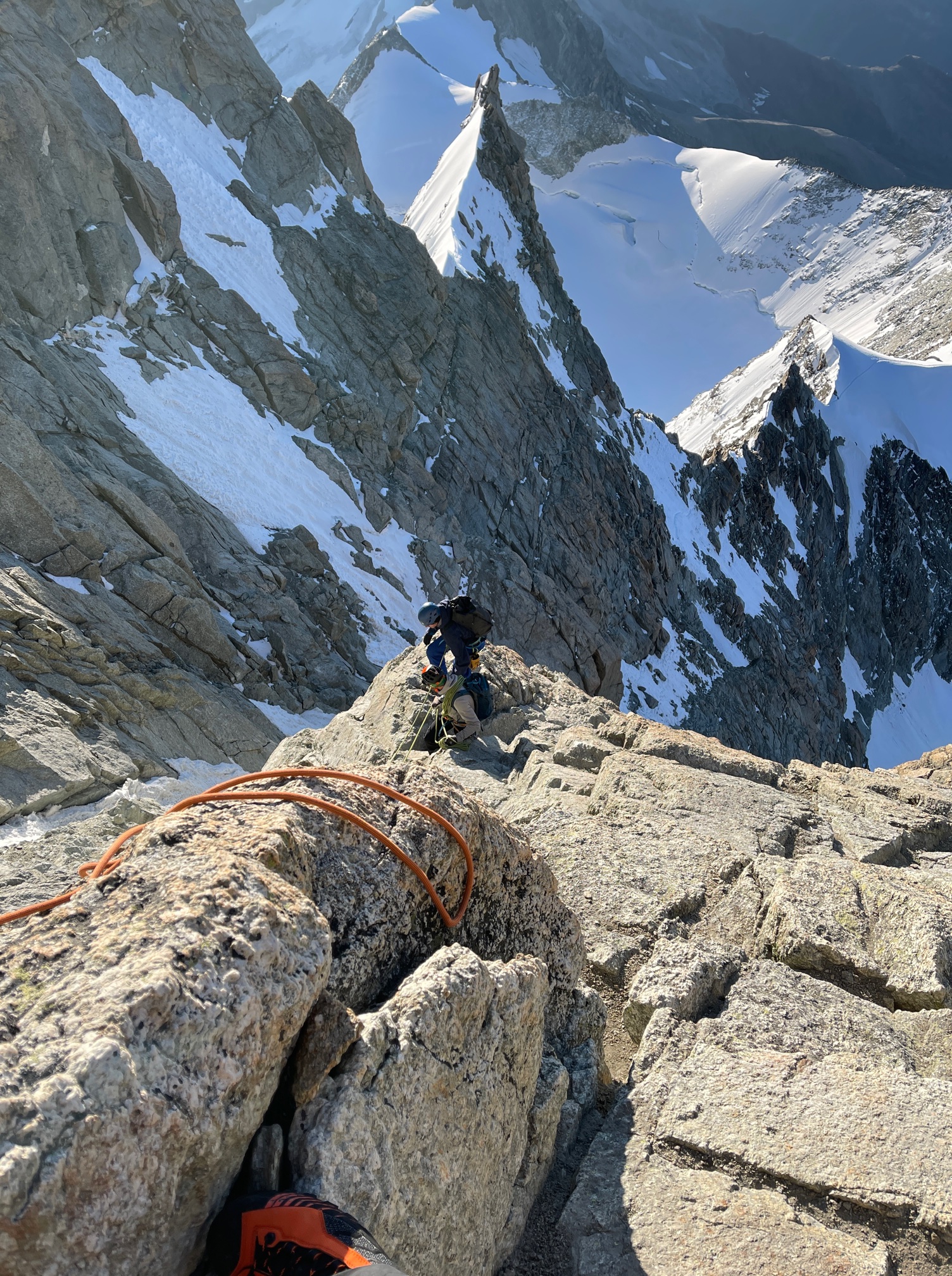 J’appréhende la descente par cette mythique arête nord. Le début est en neige, on met les crampons mais malgré ça je n’ai pas vraiment envie de me mettre debout sur ce fil minuscule. Je descends un bout sur le cul, ce qui fait bien marrer mes trois compagnons de route. Ben chacun sa technique les gars ! La mienne est tout sauf élégante mais on s’en fiche. Ensuite il y a des rappels, de la crapahute d’arête …. La seule chose qui m’obsède et à laquelle je pense depuis le début de la journée, c’est le fameux passage du rasoir. Le passage de la bourrique et du Sphinx se passent nickel, mais ça m’est égal, je continue de m’inquiéter pour le rasoir.