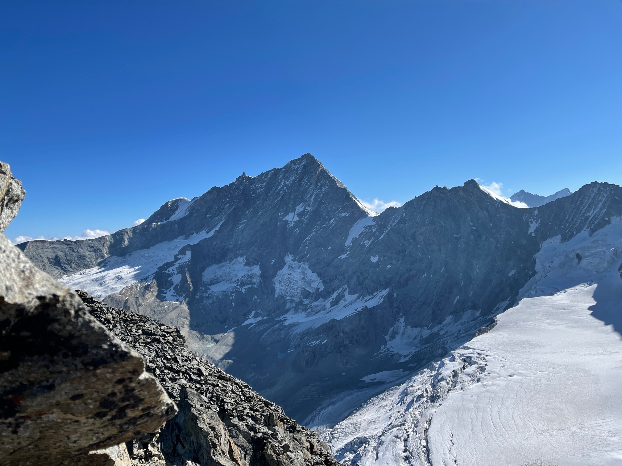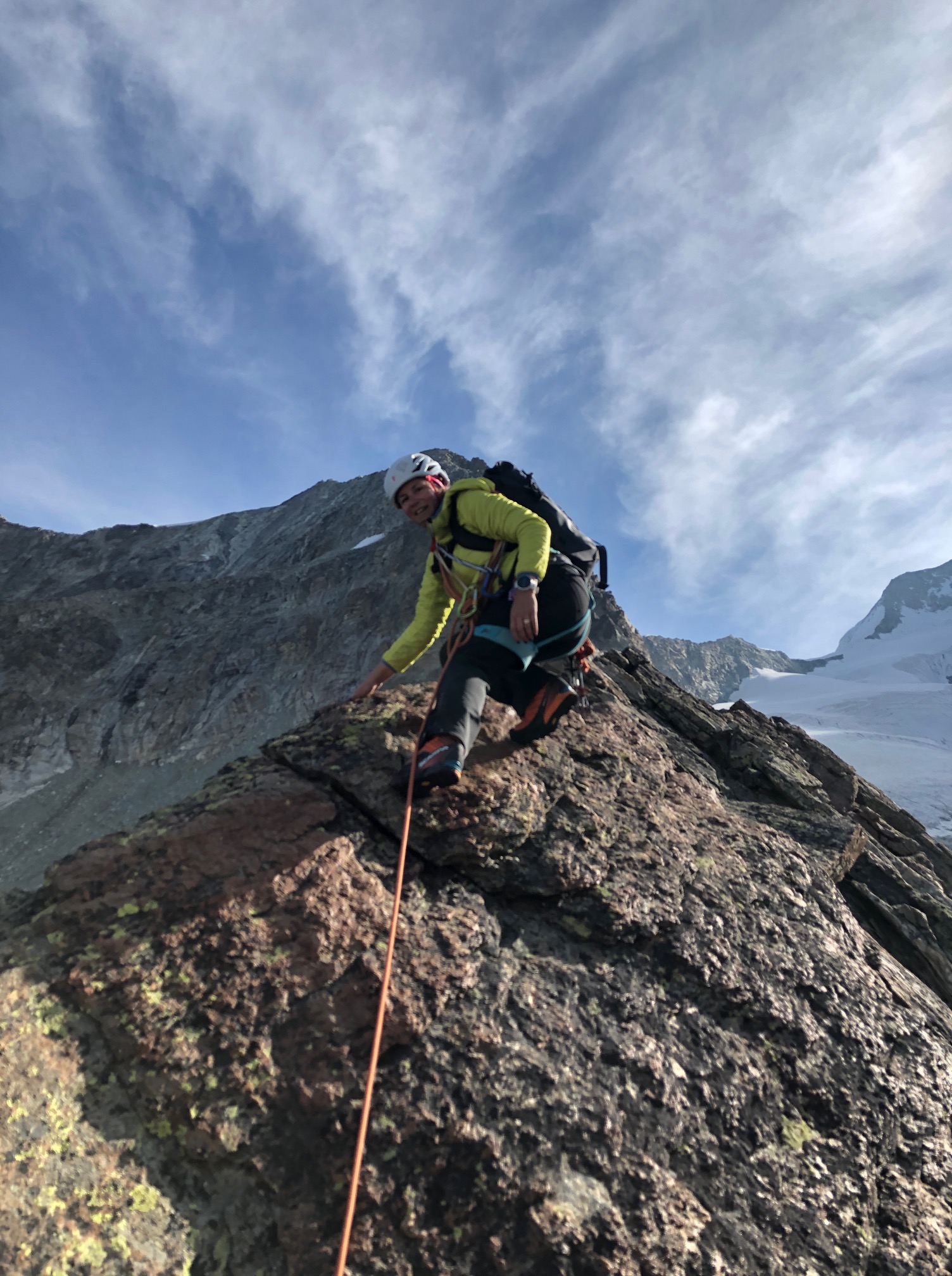 Le dernier ressaut est super chouette, j’ai un super plaisir à être là. On fait une pause au sommet et on est quand même soulagés de voir notre kamikaze arriver à son tour au sommet sain et sauf.