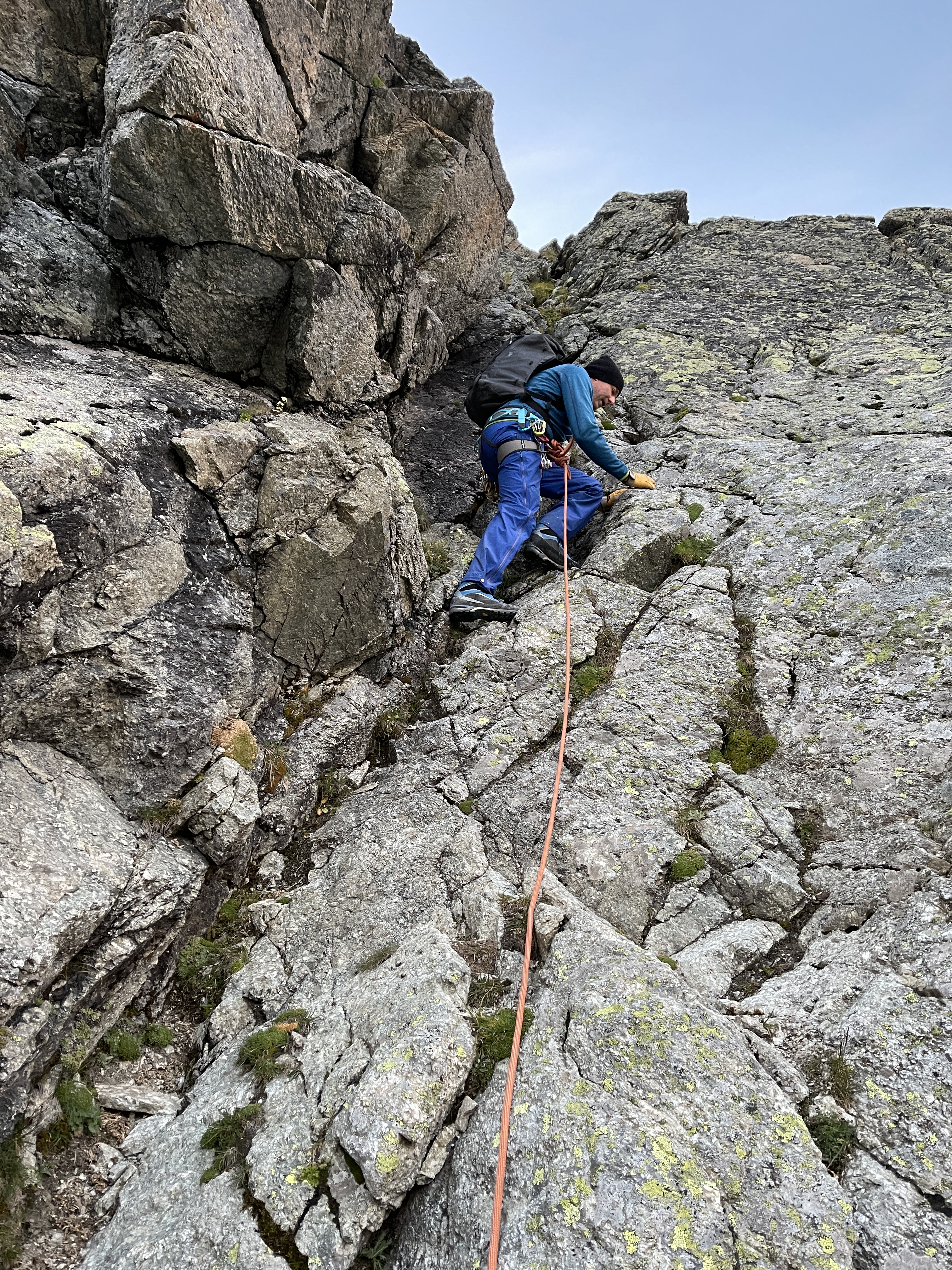 On suit les points rouges pour accéder à l’arête, on doit remettre l’autre gars sur le droit chemin, tant il a du plaisir à nous suivre. Il part complètement aux fraises et on le voit à distance, bien loin du cheminement sur lequel il devrait se trouver, en bien mauvaise posture au milieu de la face.