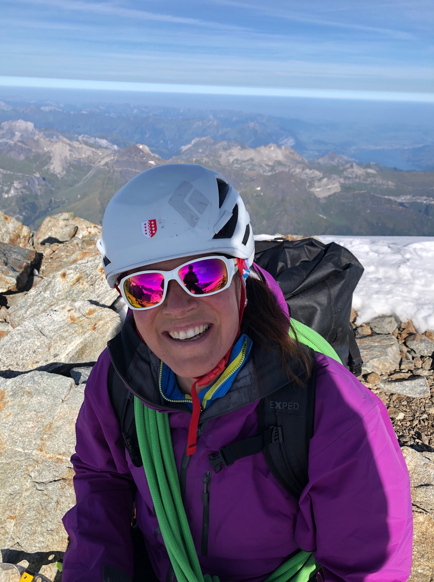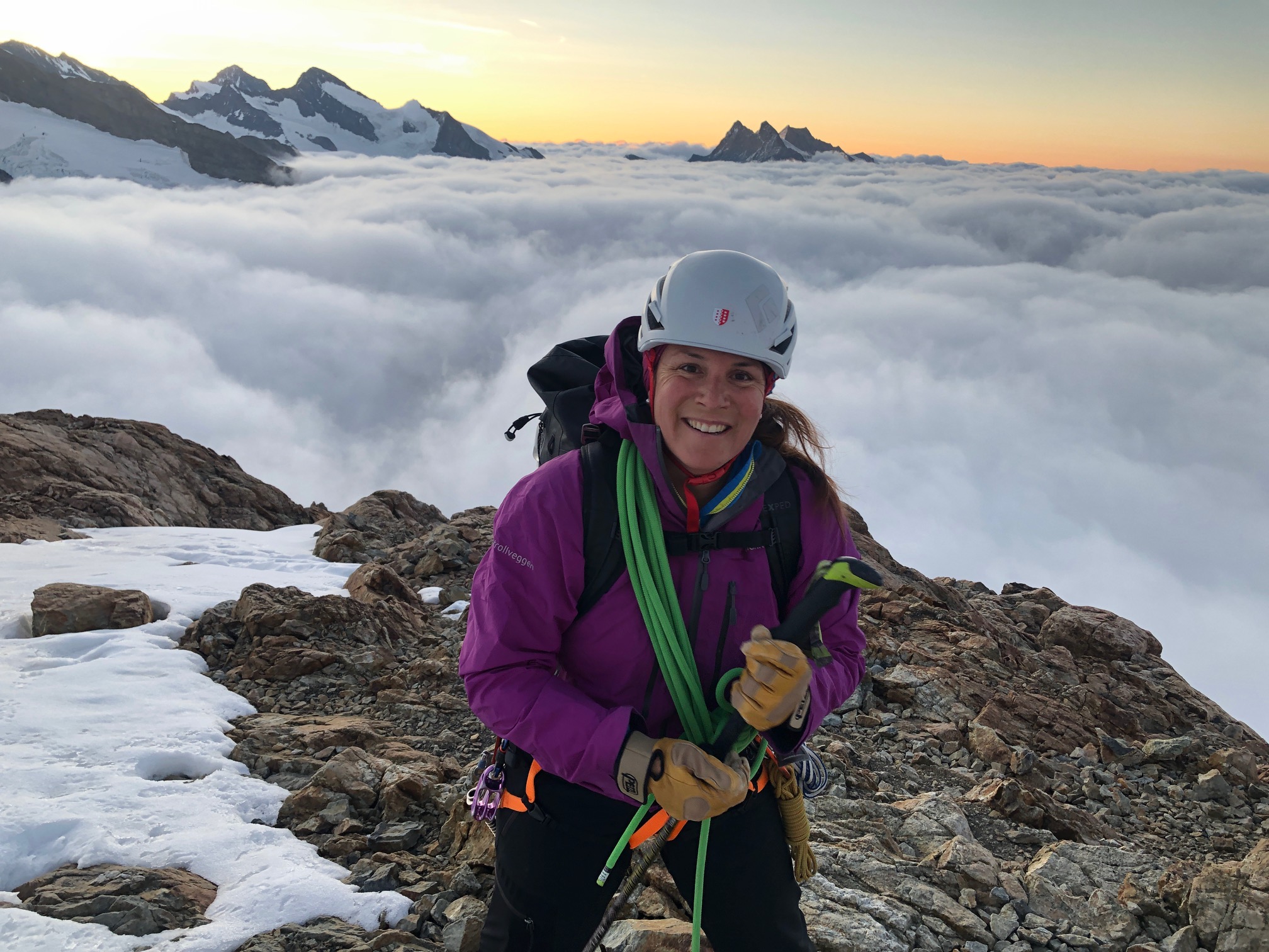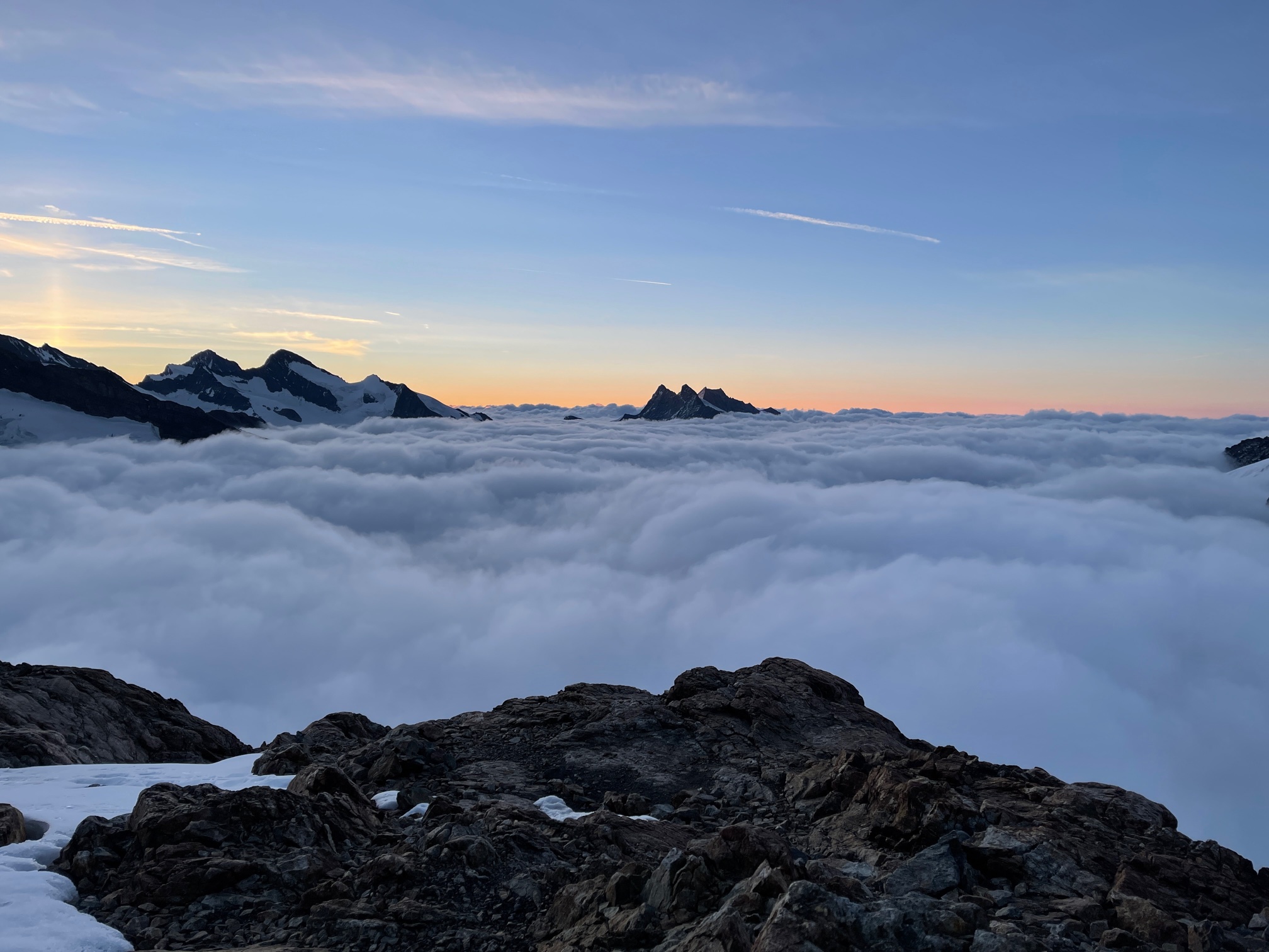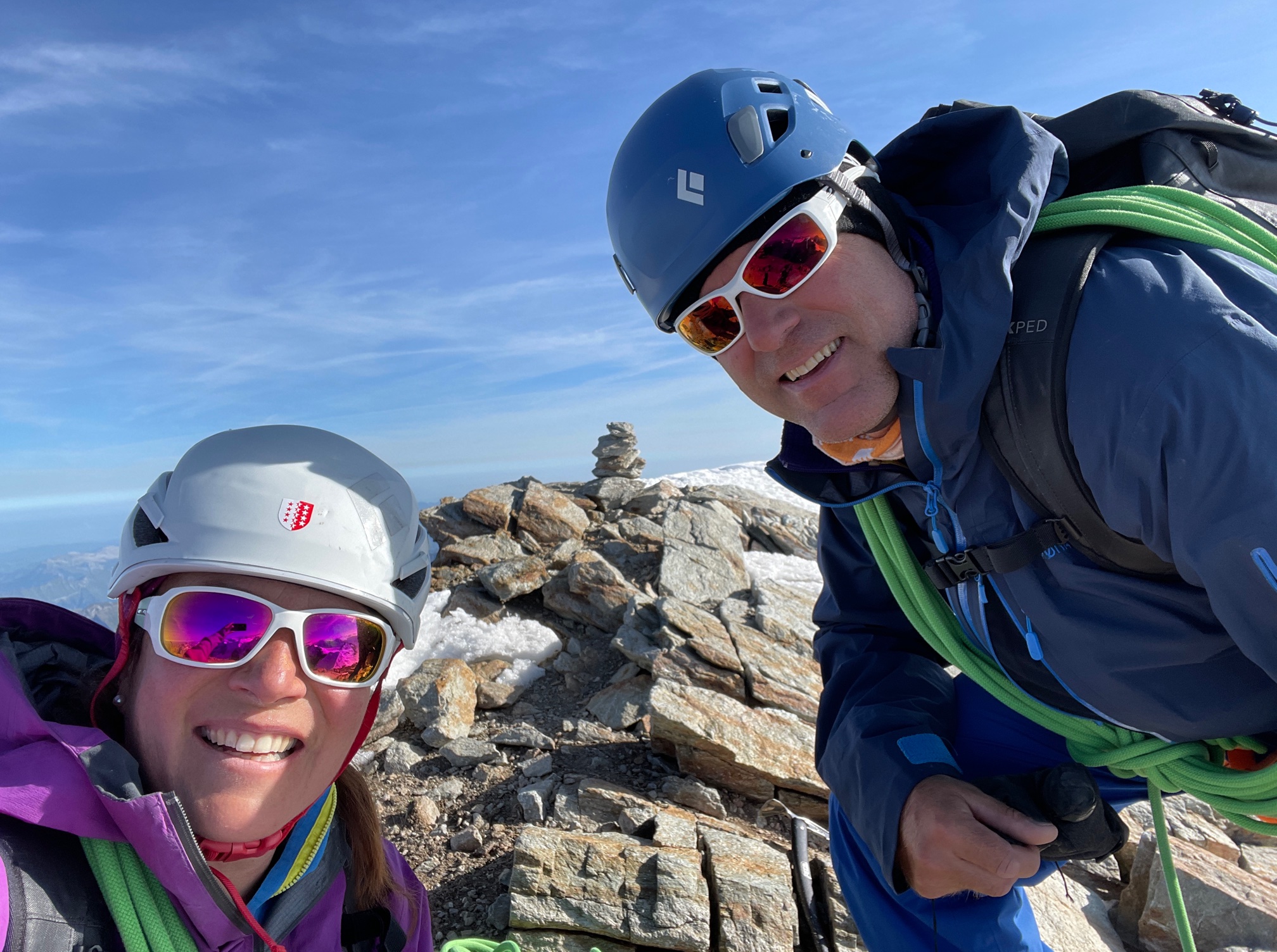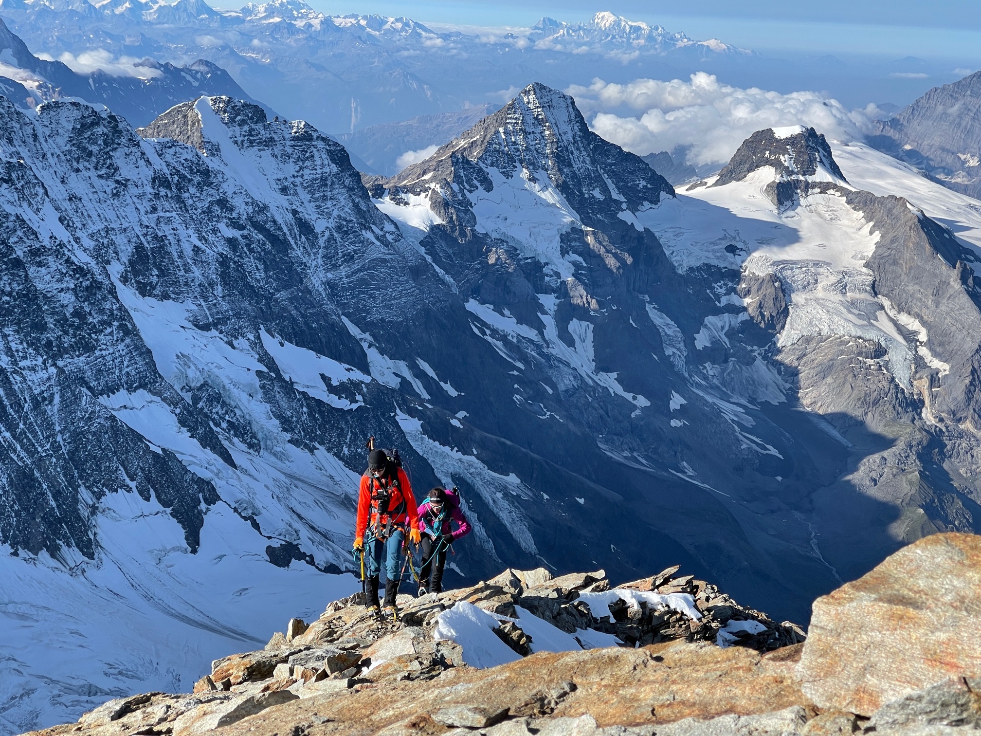 Les derniers 20 mètres sous la Rottalsattel sont bien raides et la glace n’est pas loin. Mais cela ne pose aucun problème à Pål qui monte et m’assure depuis le haut. Ensuite on traverse à gauche et on fini de monter tranquille, franchement ça va bien. On est seuls au sommet, il y a quelques cordées derrière mais ce n’est pas la foule.