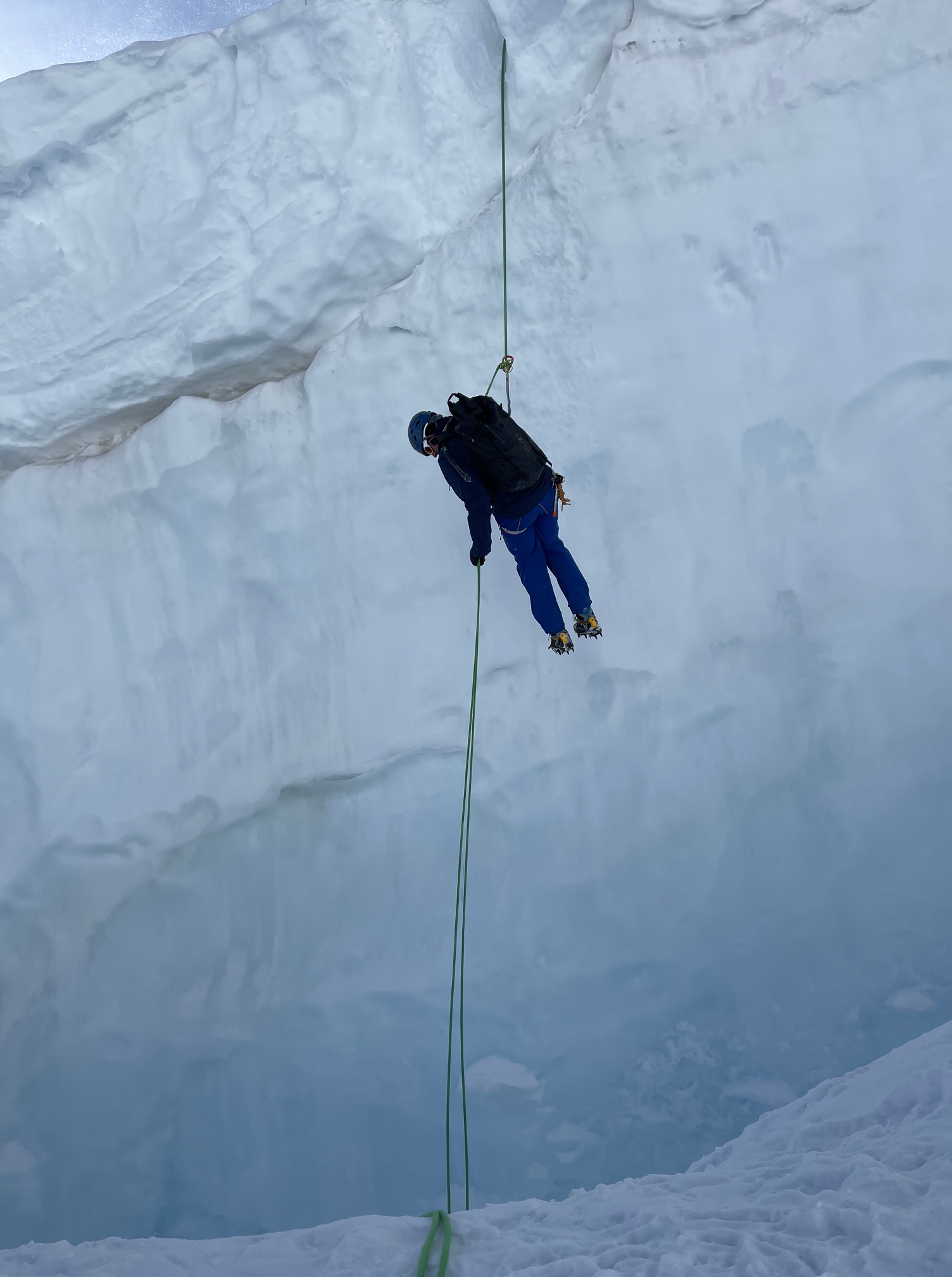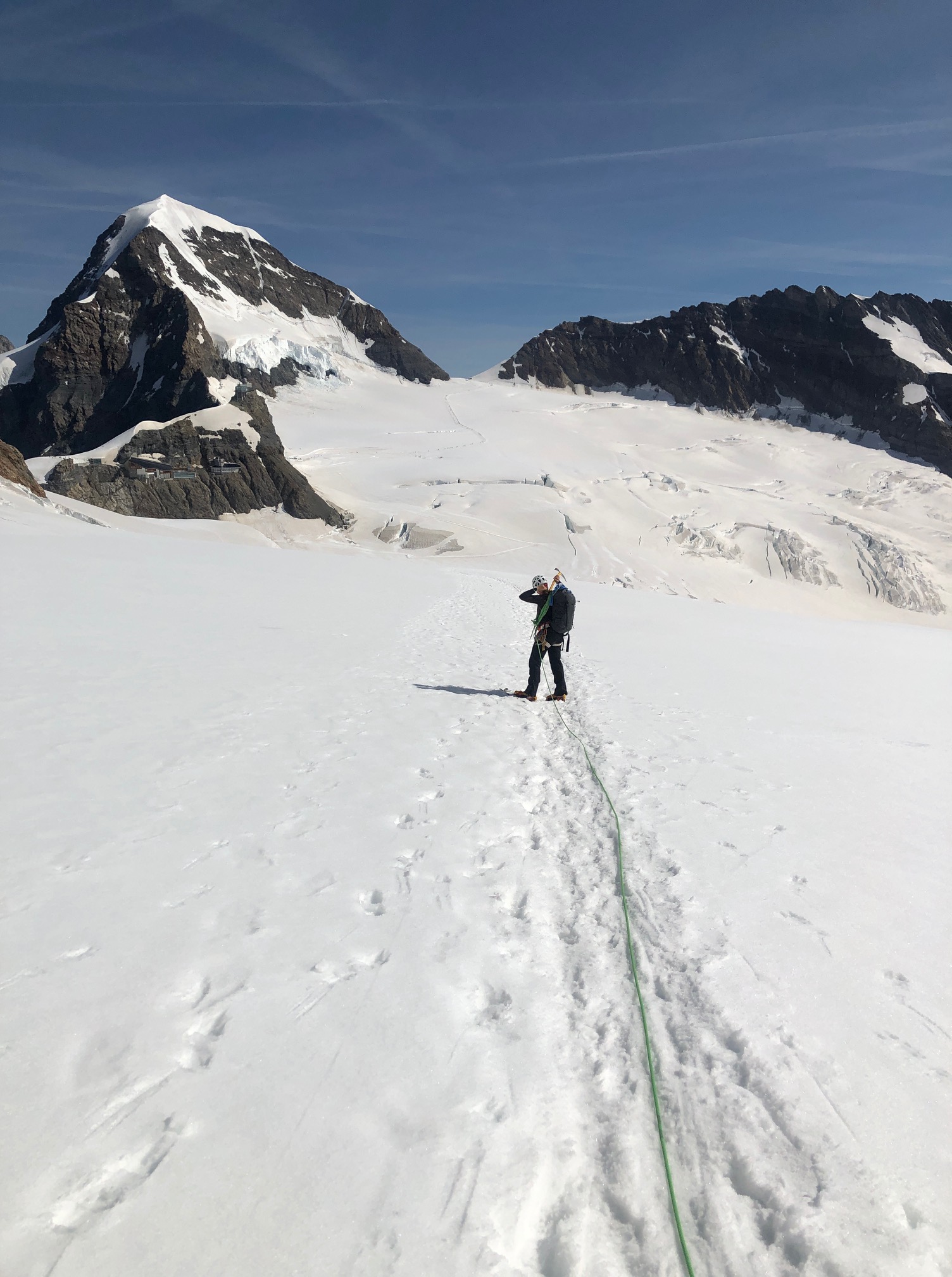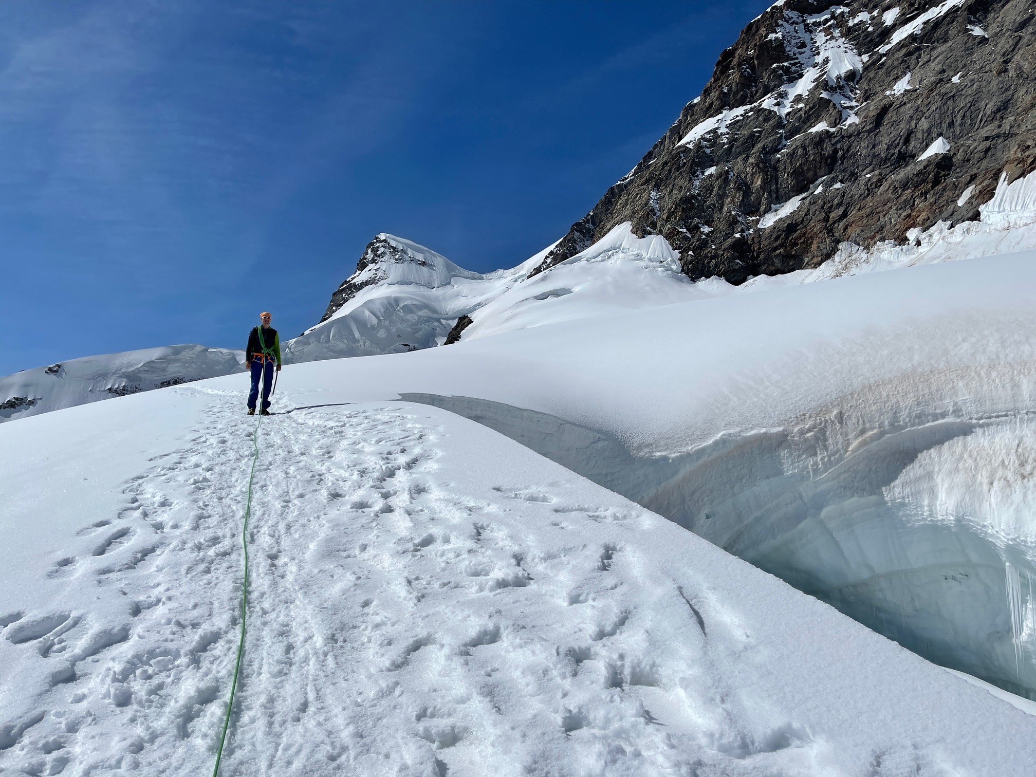 On décide de descendre par la variante directe et son rappel dans les séracs. Même si on nous a dit que c’est en bonnes conditions cette année, je n’ai pas vraiment envie de faire de vieux os par là et je prends sur moi pour liquider ce rappel au plus vite. Il faut reconnaître que c’est vraiment très beau et vu que je dois de toute façon attendre Pål, j’en profite pour faire quelques photos. Ensuite on dégage sans demander notre reste et on fait une belle pause plus bas sur le glacier, avant de remonter au Jungfraujoch.