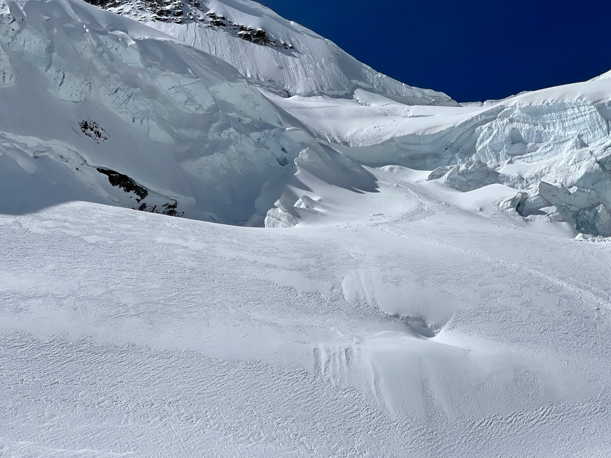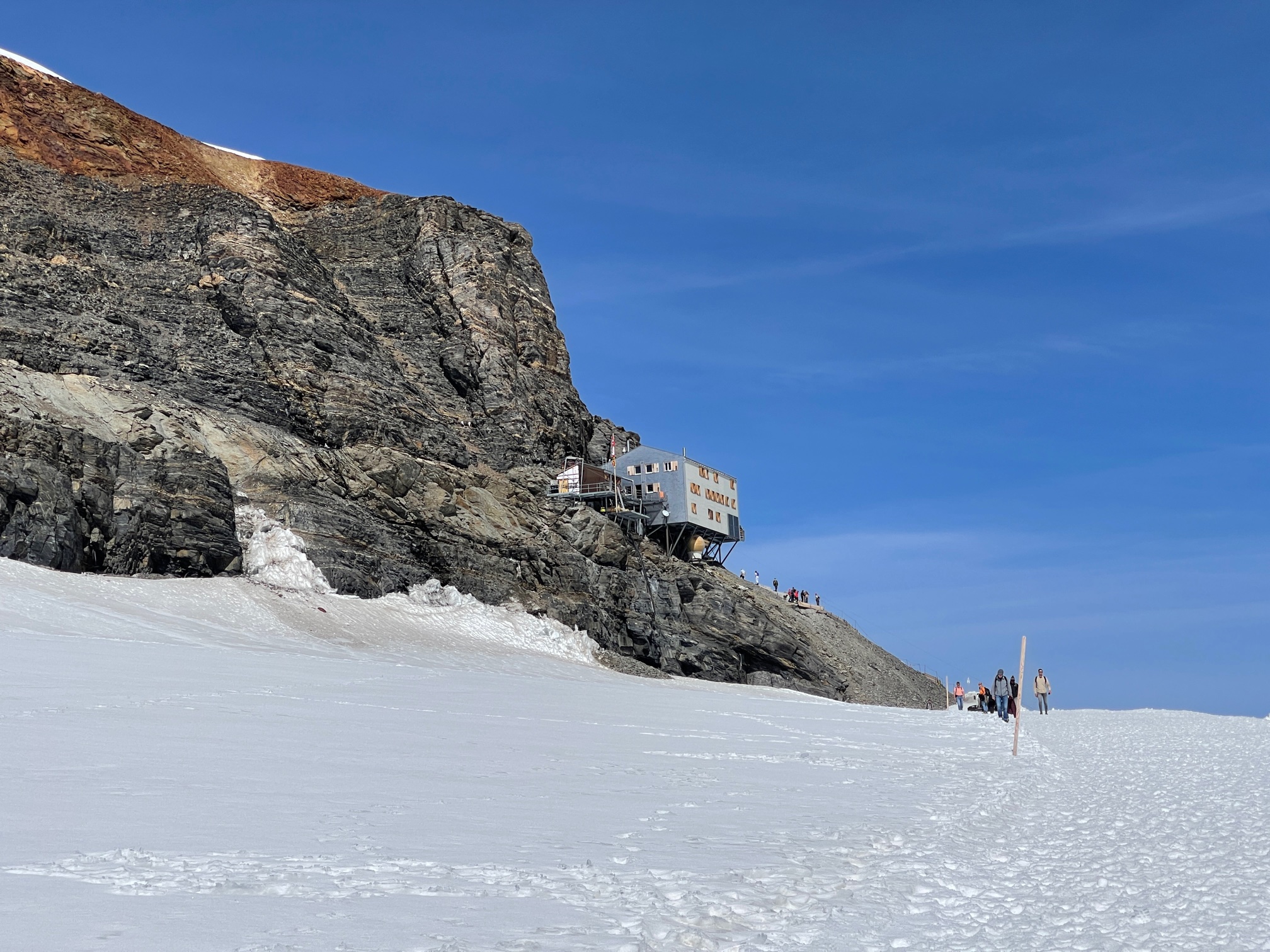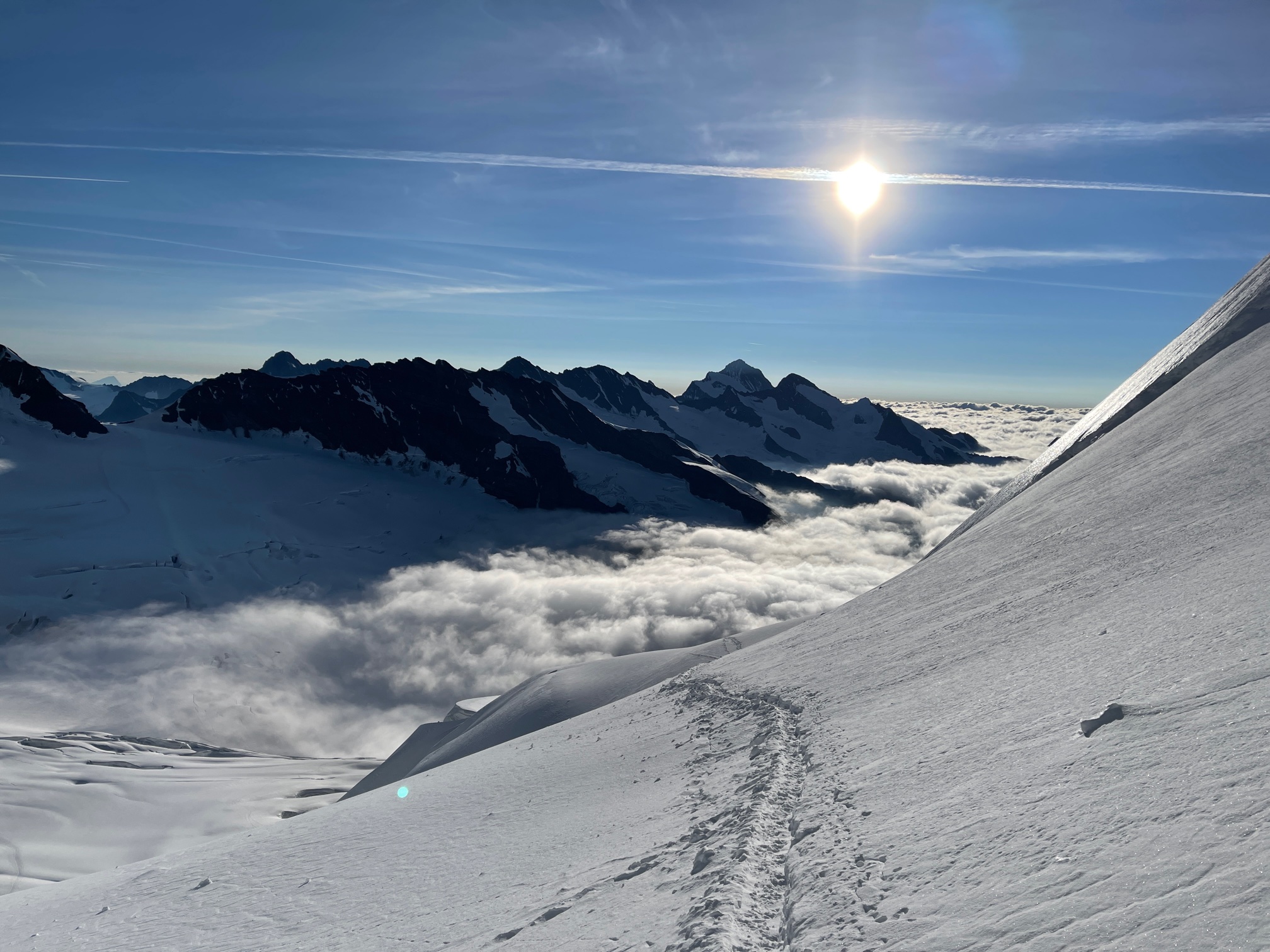 La montée en cabane est magnifique et correspond à mon cahier des charges : Grasse mat + approche ridiculement courte. Bon soyons honnêtes, il faut mettre le prix. 95 balles l’aller-retour de Grindelwald au Jungfraujoch avec le demi-tarif. Après c’est une longue piste damée pleine de touristes, on ne risque pas de se perdre.
