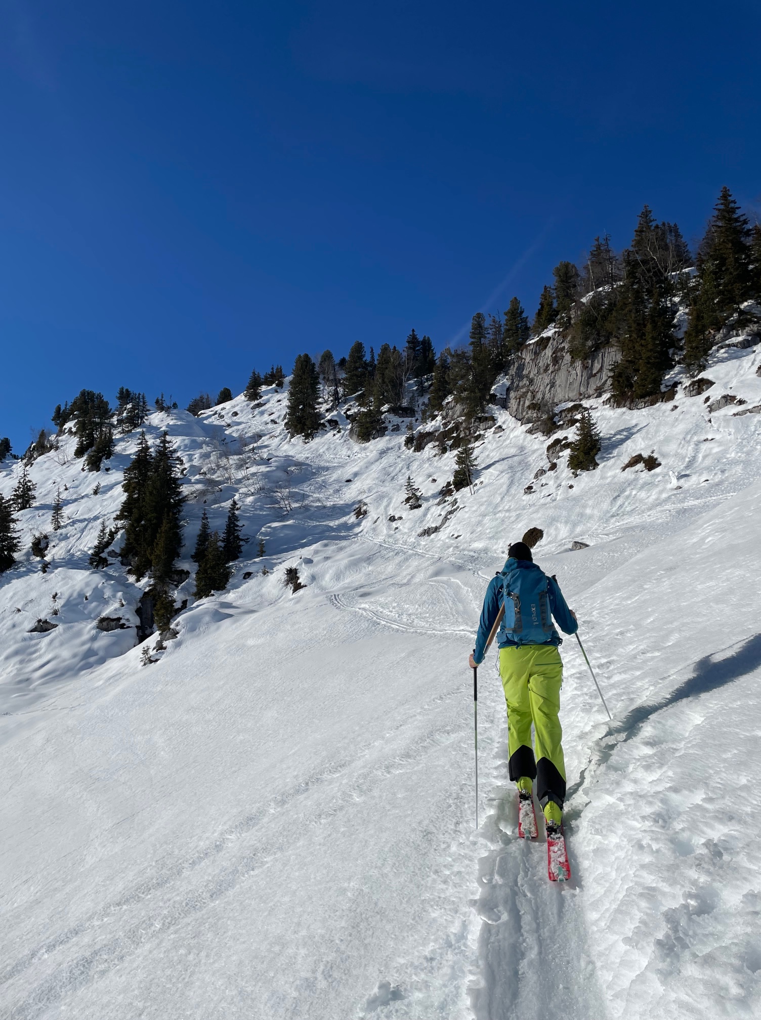Le cheminement est sans difficultés jusqu’aux voies de grimpe, après il faut êtes attentifs aux monstres gouffres karstiques. Certains sont entièrement cachés, d’autres laissent apparaître des failles énormes dans lesquels on n’a pas vraiment envie de tomber. On laisse les skis quelques mètres sous le sommet et on fini à pieds, c’est sympa.