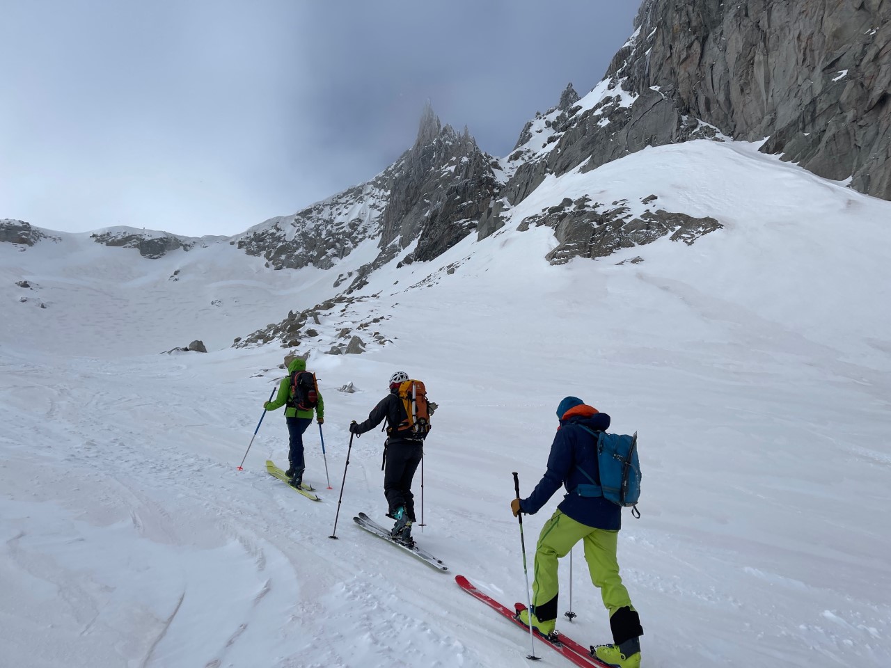 Le dimanche, on se réveille sous la neige. Entendons-nous, il n’est pas tombé 10 cm de fraîche, mais il neigeote et la visibilité est moyenne. On entame la descente de la cabane, non sans avoir vérifier 12 fois que personne n’a oublié ses peaux dans le réfectoire. On peaute au fond du vallon et on commence la montée pour le Passo di Valdeserta. La montée est efficace, y a quelques passages assez raides et nous mettons les couteaux. On arrive au col dans une tempête de tous les diables et on essaie d’être le plus efficace possible pour enlever nos peaux et dégager d’ici au plus vite. Derrière, le vent est nettement moins violent et on peut profiter du magnifique paysage dans lequel nous évoluons.