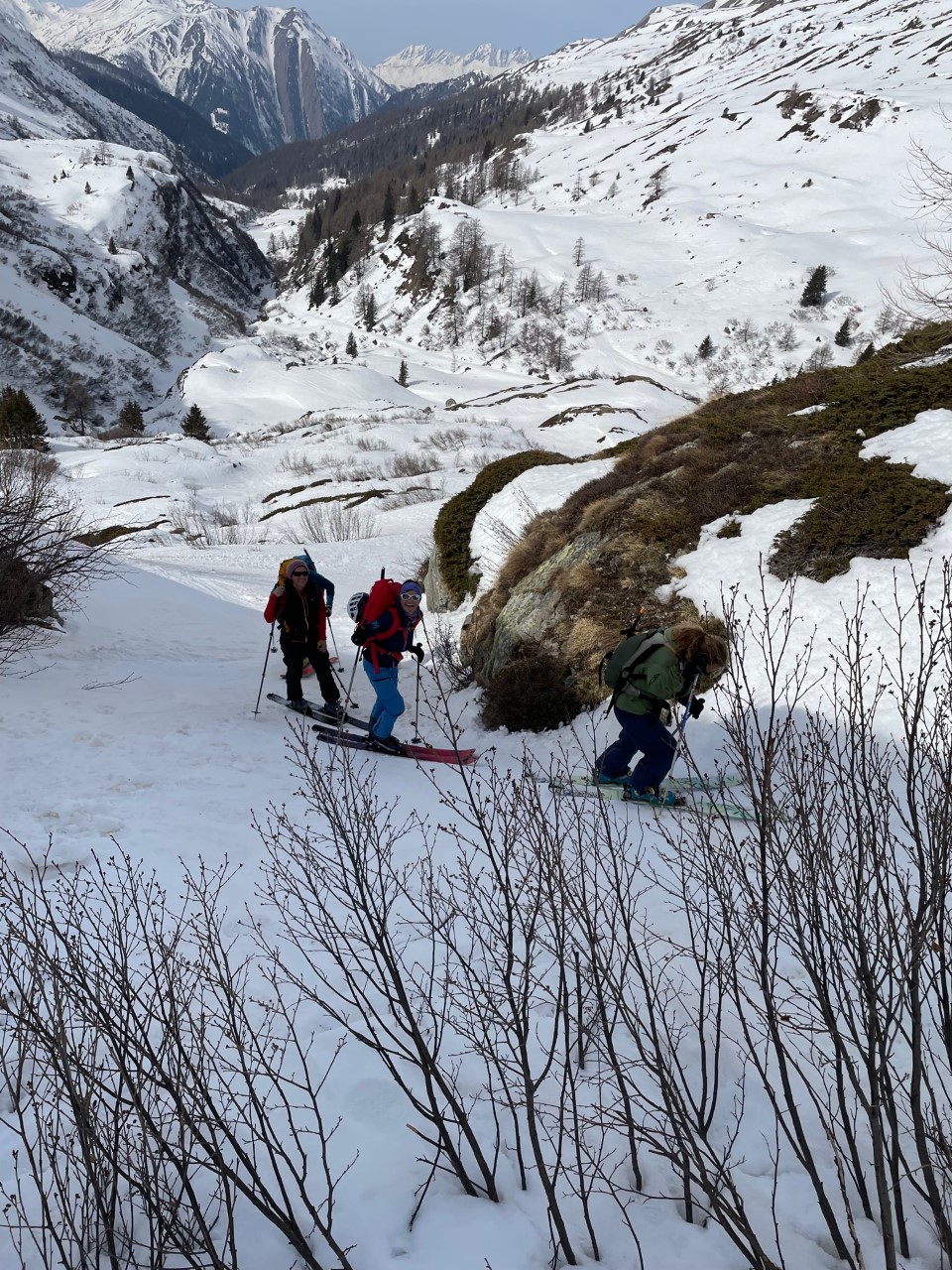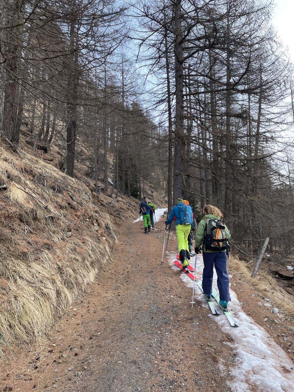 Le manque de neige criant de ce milieu d’hiver 2021-2022 nous décide à renoncer à passer par le Gandhorn pour monter à la cabane. On choisit la variante directe qui, même si elle réduit le portage à quelques minutes, est quand même bien chiante avec des kilomètres de faux plat montant sur une route. Bon, cela permettra aux pipelet(tes) que nous sommes de se raconter les derniers potins.