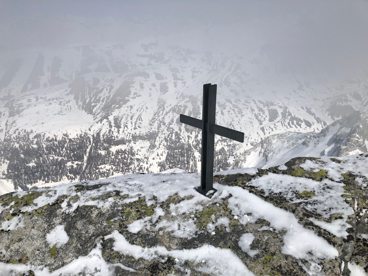 Mittelbergpass, deuxième col de la journée. On laisse nos skis et nos sacs au col et on file à pieds au sommet. Seuls les derniers mètres sous le sommet sont un poil aériens, mais sans difficultés.