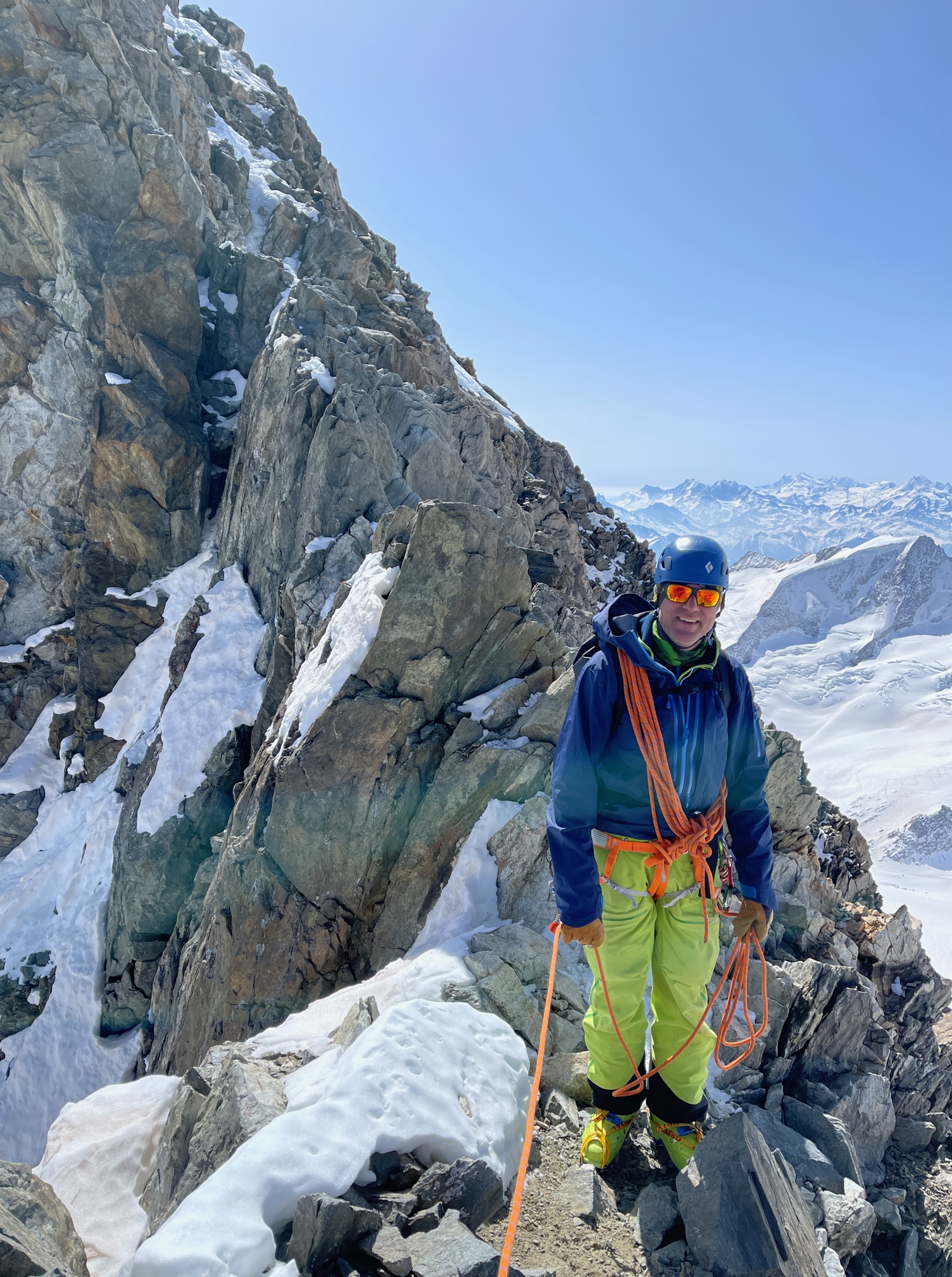 La montée jusqu’au Fieschersattel se passe sans encombres, ça fait du bien de débarquer là-haut au soleil. On commence logiquement par grimper au Grosses Fiescherhorn. Ce que je m’étais imaginé comme une promenade de santé grimpe quand même pas mal, surtout avec Pål devant qui, fidèle à son habitude, choisi les passages les plus beaux à grimper (alors que pç%&ç(/çtain y a une autoroute à côté 🤣) Bon il faut reconnaître que c’est très chouette et que le rocher est bon.