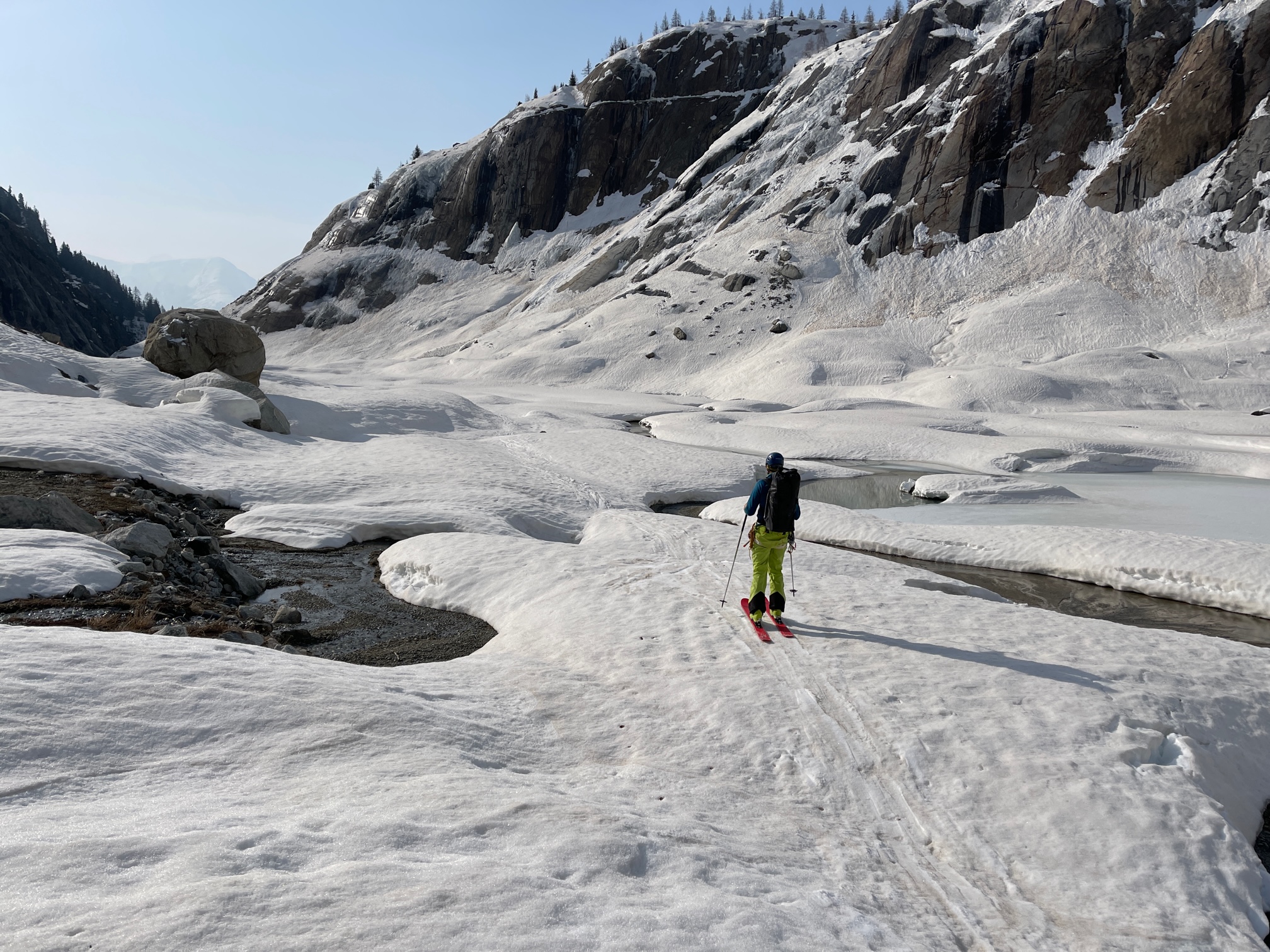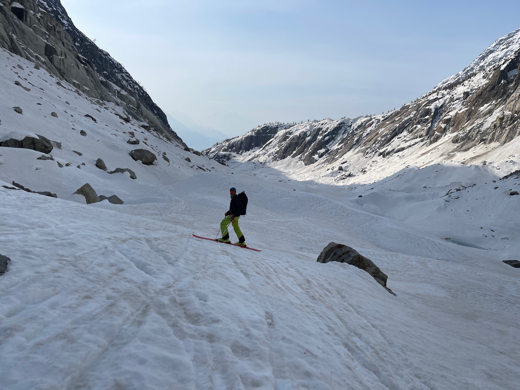 La descente est vite pliée, on n’a plus aucune cordée à croiser sur l’arête et la neige est magnifiquement décaillée et chouette à skier. Il faut juste faire gaffe aux cailloux sur le bas et étudier un peu l’itinéraire pour ne pas avoir à déchausser.