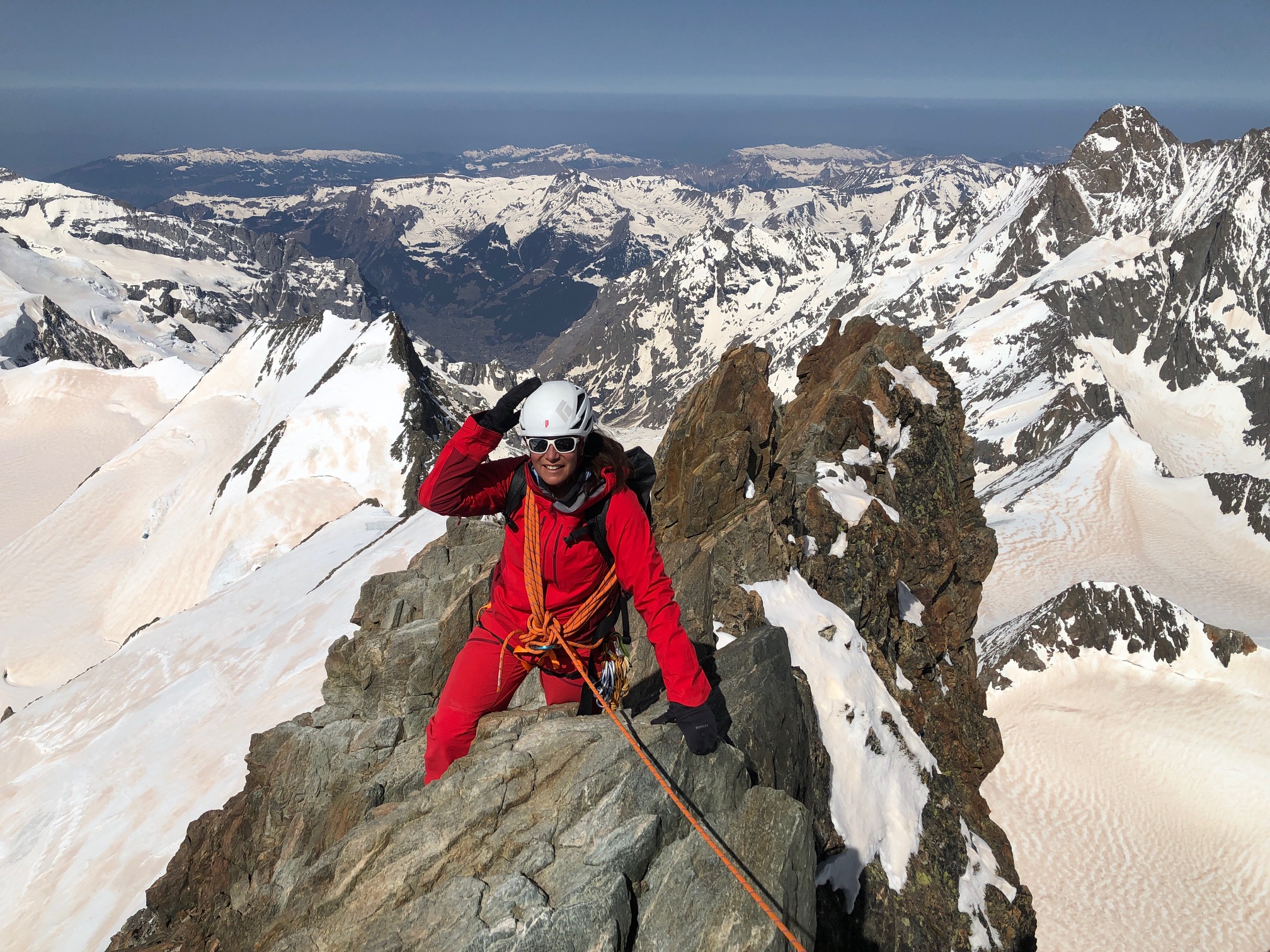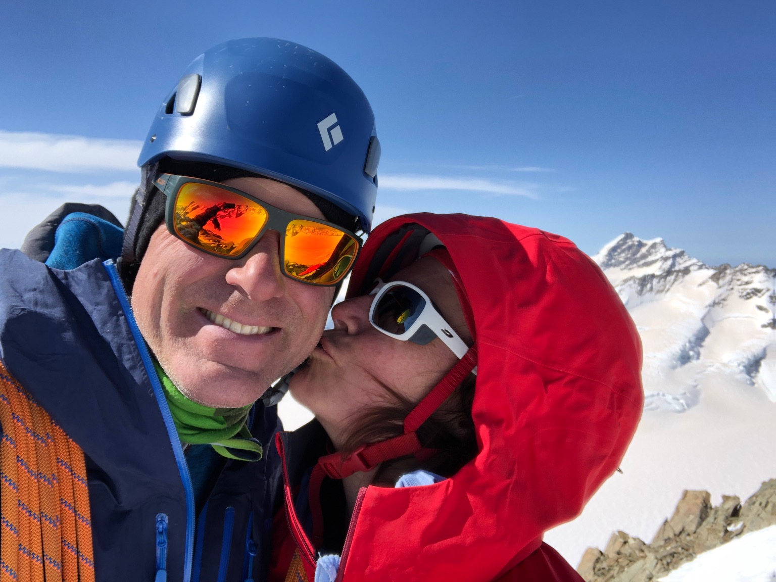 On met les crampons et on commence l’ascension. Le début est facile et me met bien à l’aise. Pål est magnifique, grimpe d’un pas assuré et m’assure trop bien, je suis super en confiance. Je dois reconnaître que la grimpe n’est pas dure et l’ambiance incroyable. On est seuls au sommet et on s’octroie quelques minutes pour profiter de la vue à 360° sur toutes les Alpes, c’est magique.