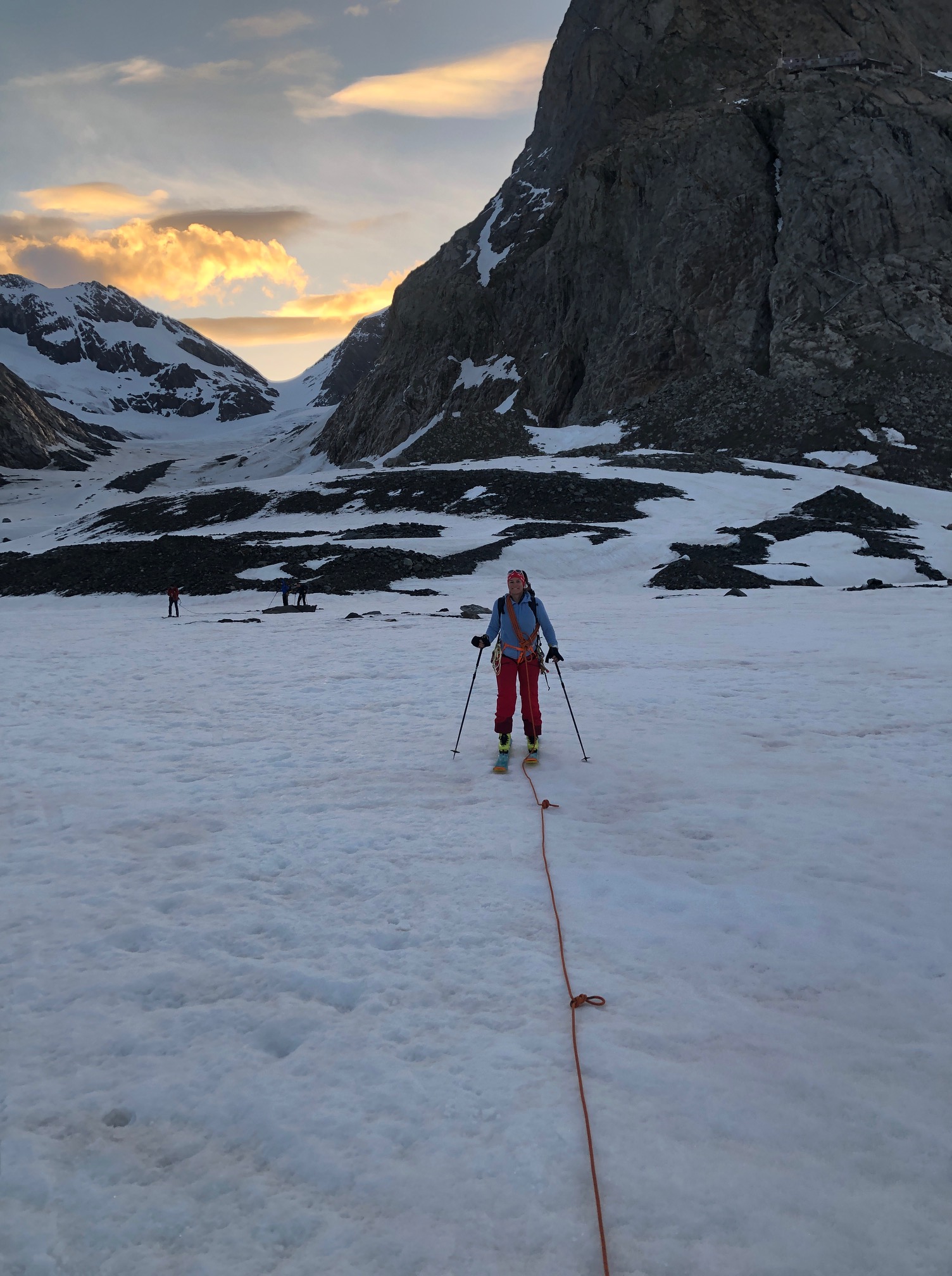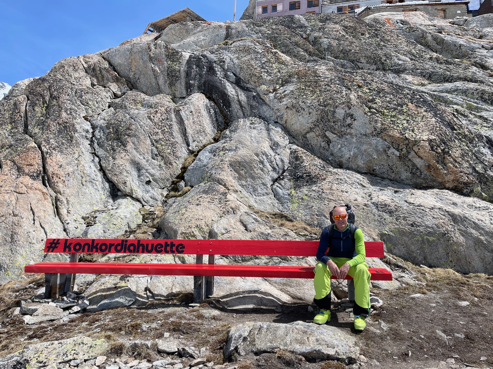 On reste bien concentrés pour la descente qui se passe sans encombre. On chausse les skis, le haut est encore assez dur et pas super agréable à skier, mais la suite est plutôt sympa. Il y a quelques beaux passages en moquette avant de s’aventurer dans la la dernière rampe, plus très large. On arrive aux pieds des échelles et on monte à Konkordia. J’adore cette cabane et son aide-gardienne Christine, un vrai rayon de soleil.