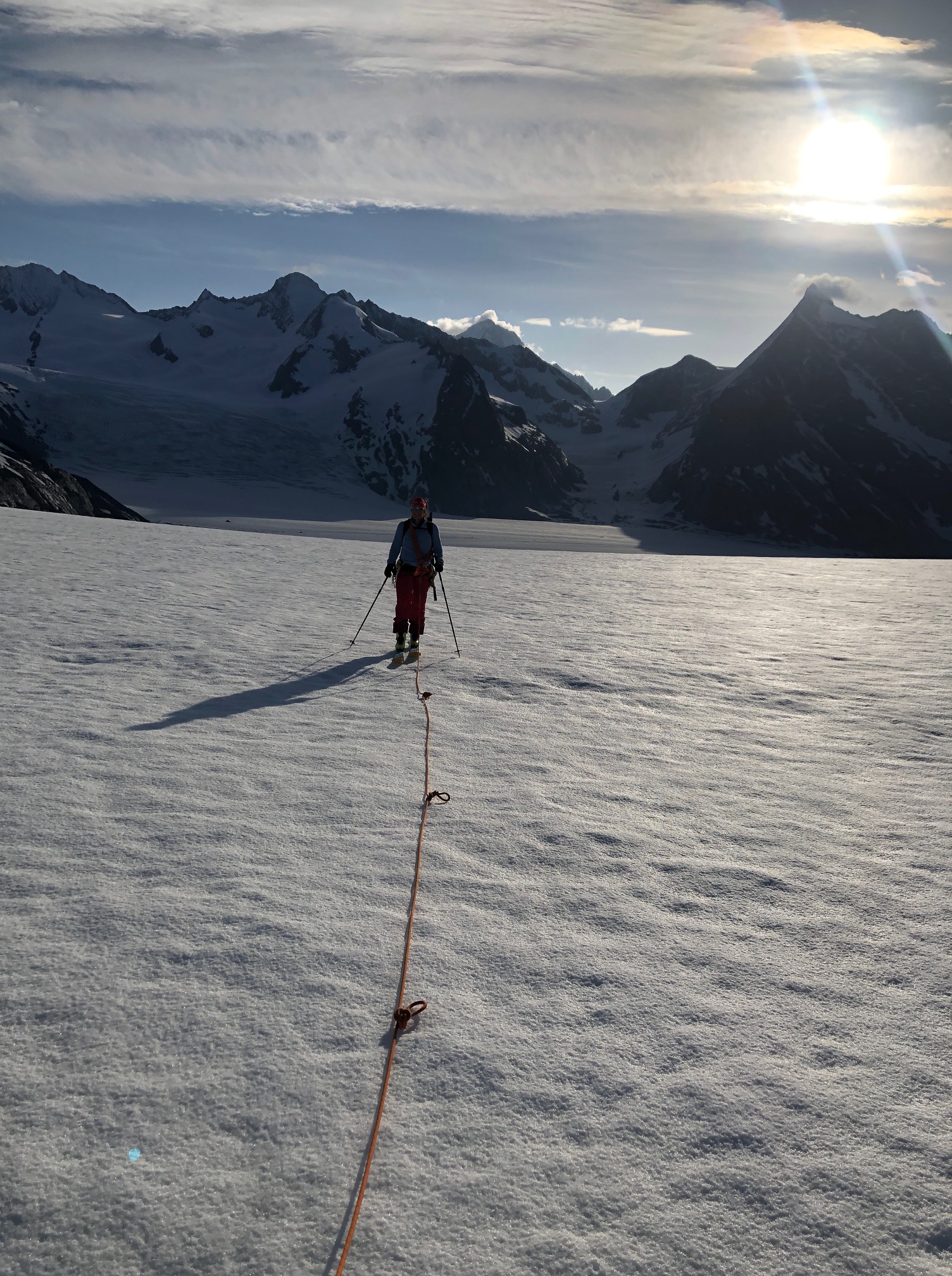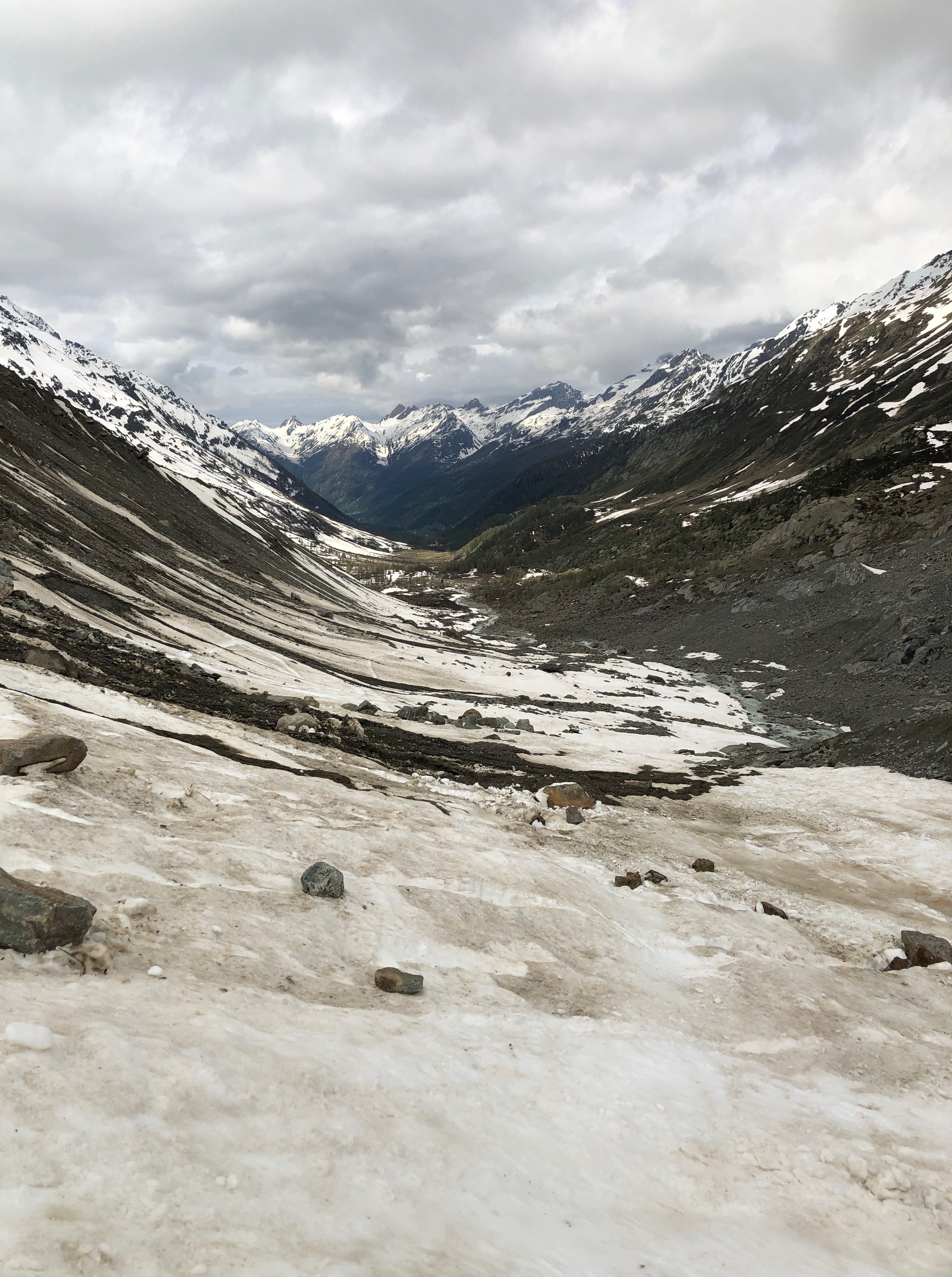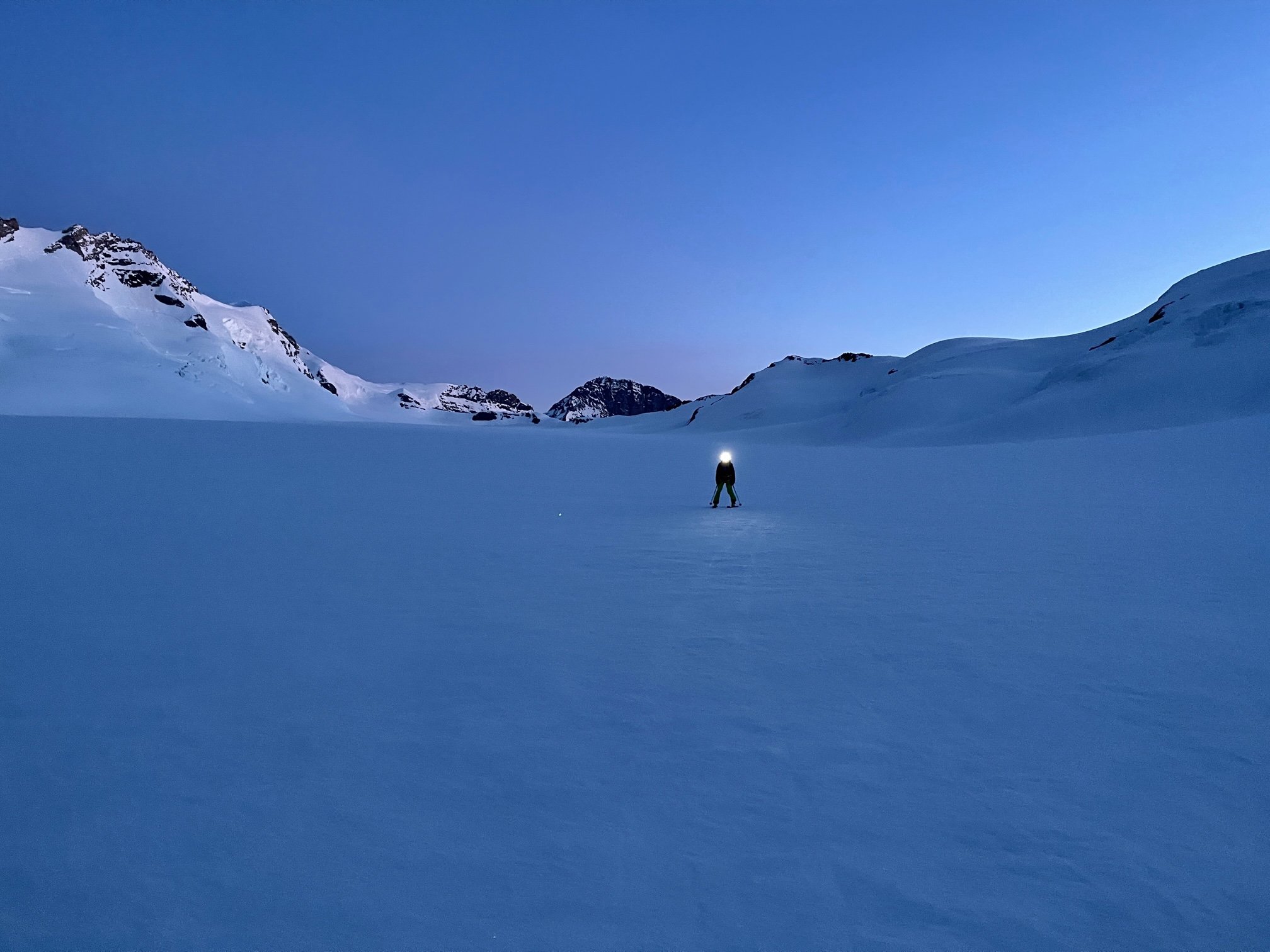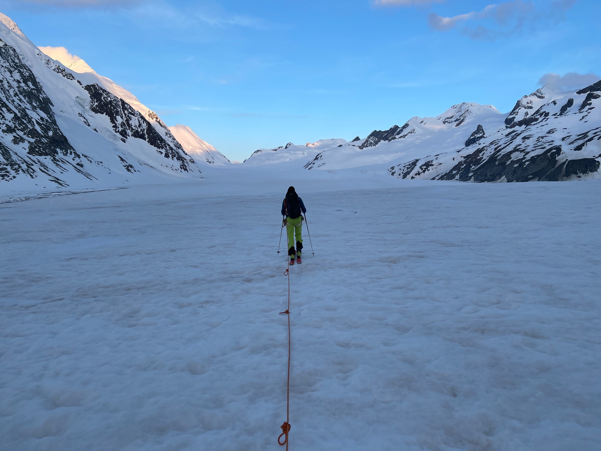 Après cette toute belle journée, j’avais un soucis: qu’est-ce que j’allais bien pouvoir vous raconter ? C’est pas drôle, une journée où tout se passe bien, sans galère et sans prise de tête, franchement…. Heureusement, on peut compter sur la descente dans le Lötschental pour remonter le niveau. Ça commence inlassablement par la remontée de l’Aletschfirn, 8km pour 450m de D+, la montée la plus plate de la Terre qui fait passer la montée à l’Hospice du Grand-Saint-Bernard pour du ski de pente raide. On a le temps de mettre de l’ordre dans ses pensées, c’est moins cher qu’une séance chez le psy et surement pas moins efficace.