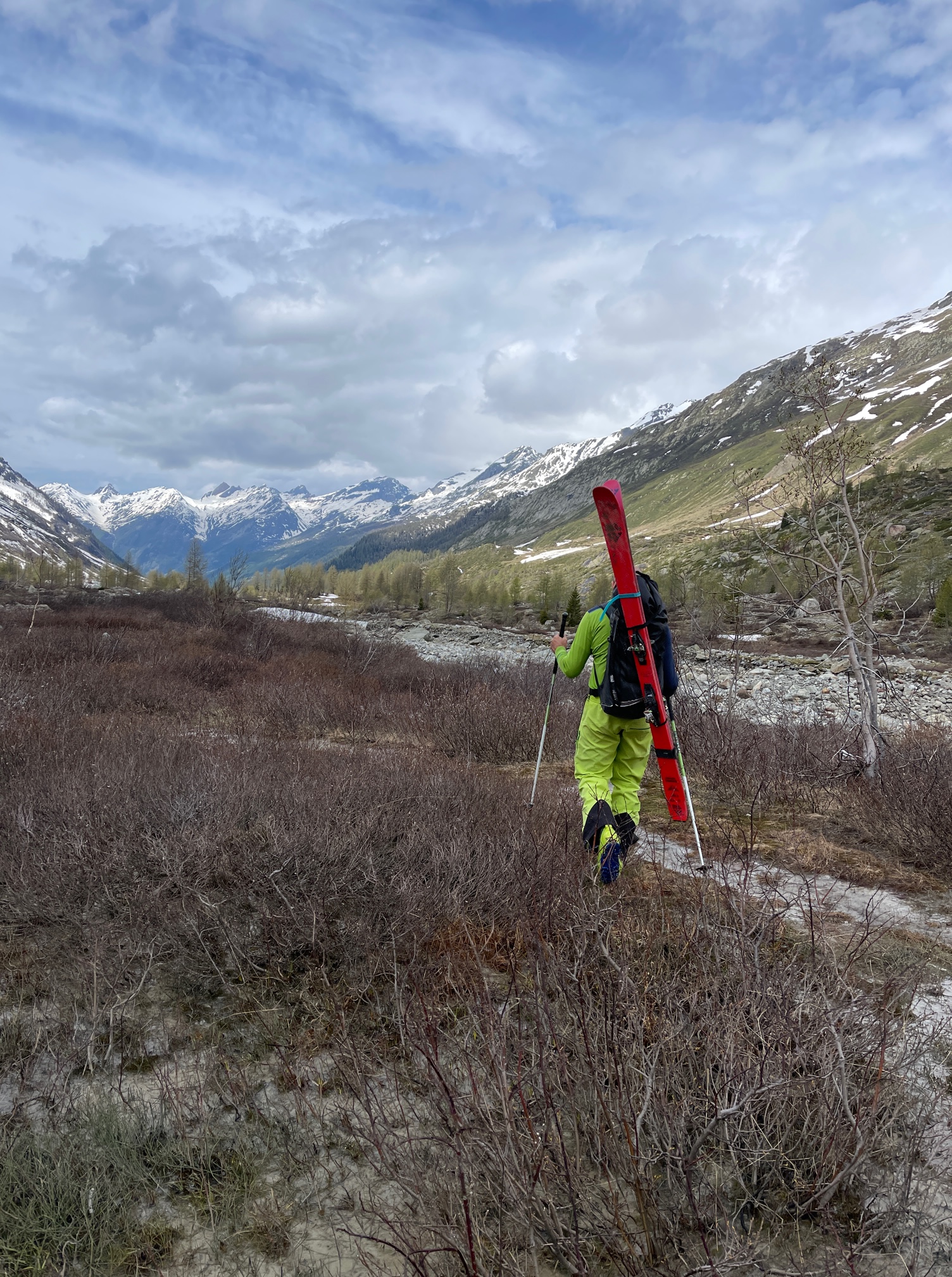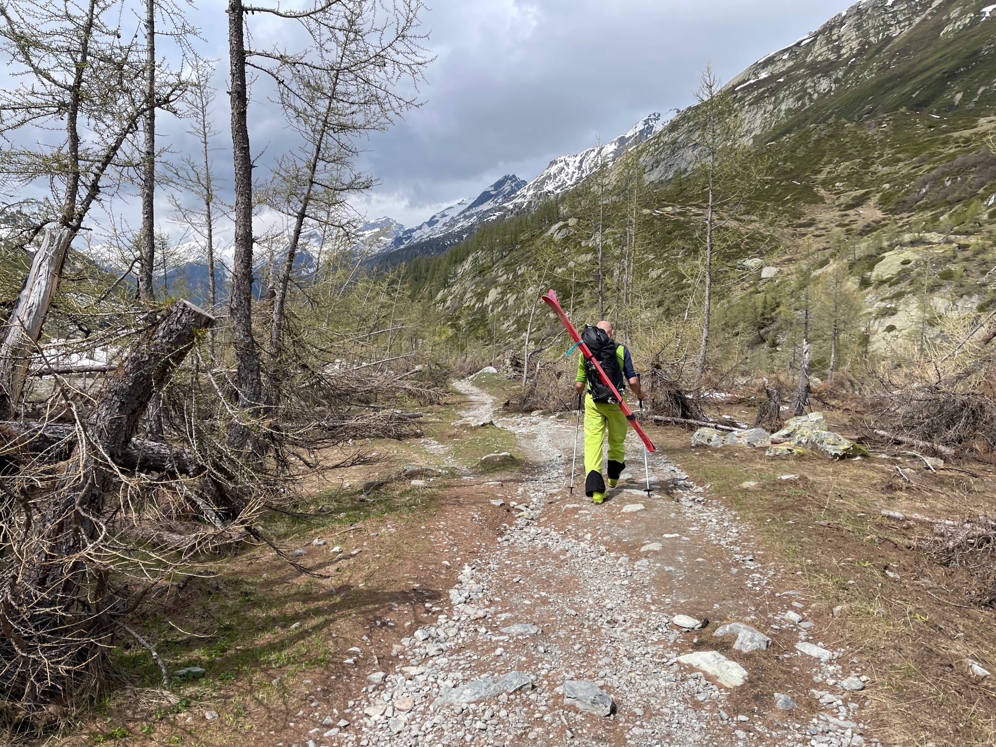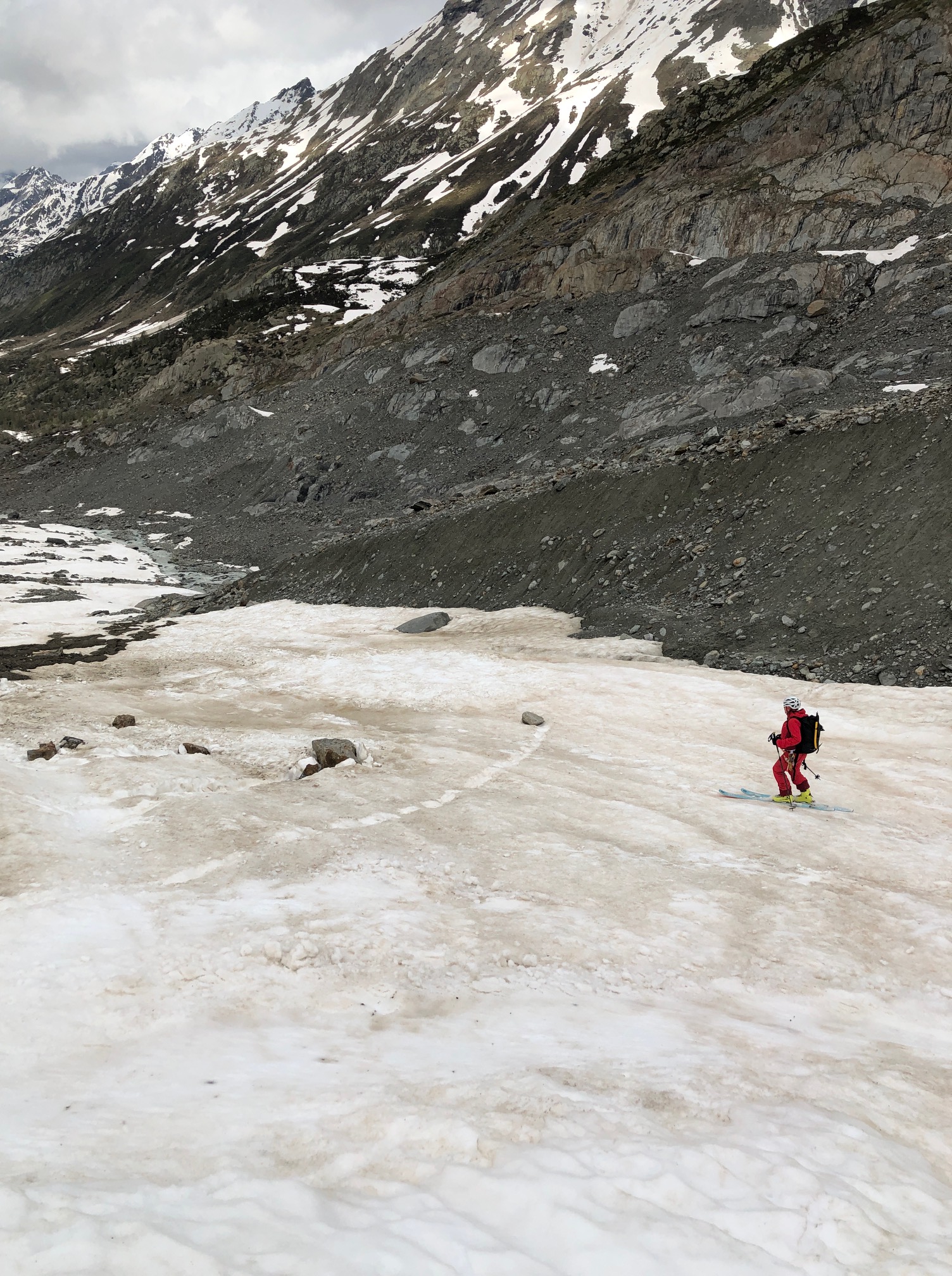 A la Lötschenlücke, on est contents de descendre, mais pas longtemps ! 10 beaux virages et après c’est une alternance de croûte et de soupe infame. On se réjouit que ça finisse, et ça arrive bien assez tôt ! Encore une grosse heure de marche, dans la caillasse et les vernes, avec un sac de 3 tonnes sur le dos. Non vraiment, le ski en mai c’est super !